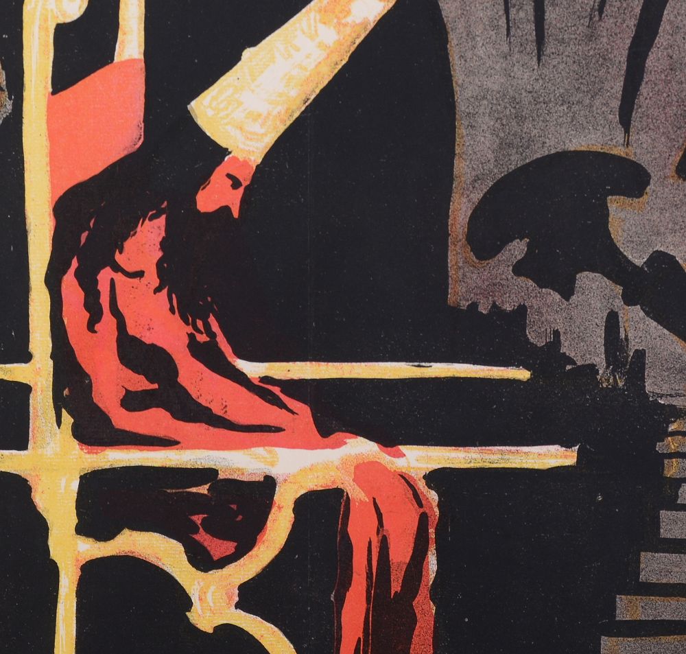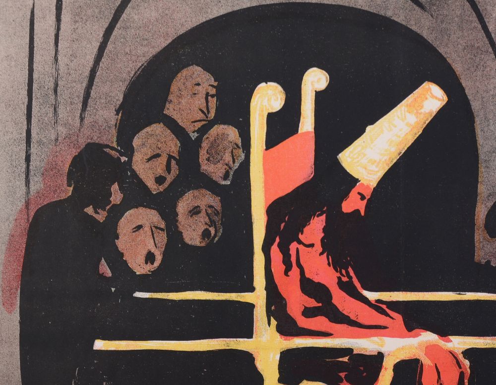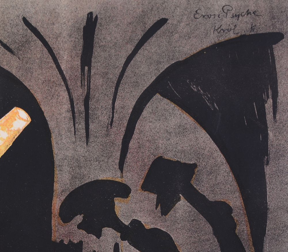 | opis na płycie p.g.: "Eros i Psyche | Król K." opis pracy: Praca Karola Frycza przedstawia scenę z rozdziału siódmego sztuki „Eros i Psyche” (1903) Jerzego Żuławskiego, wystawionej w lutym 1904 roku w Teatrze Miejskim w Krakowie. Artysta przedstawił króla Blaksa (granego przez Józefa Sosnowskiego) bardzo wiernie trzymając się jego opisu z didaskaliów dramatu. Za władcą widnieje jego orszak, przed nim kłaniające się sylwetki Przemówiciela i Dozorcy. Król przed momentem został wniesiony na tronie do lochów więzienia, w którym przetrzymywana jest pominięta na litografii Psyche. Praca charakteryzuje się syntetycznym, groteskowym ujęciem form i postaci, typowym dla karykatury. Ciemne, wydobywane z cienia sylwetki sług kontrastują z potęgą ukazanego w królewskich kolorach złota i purpury Blaksa. | |