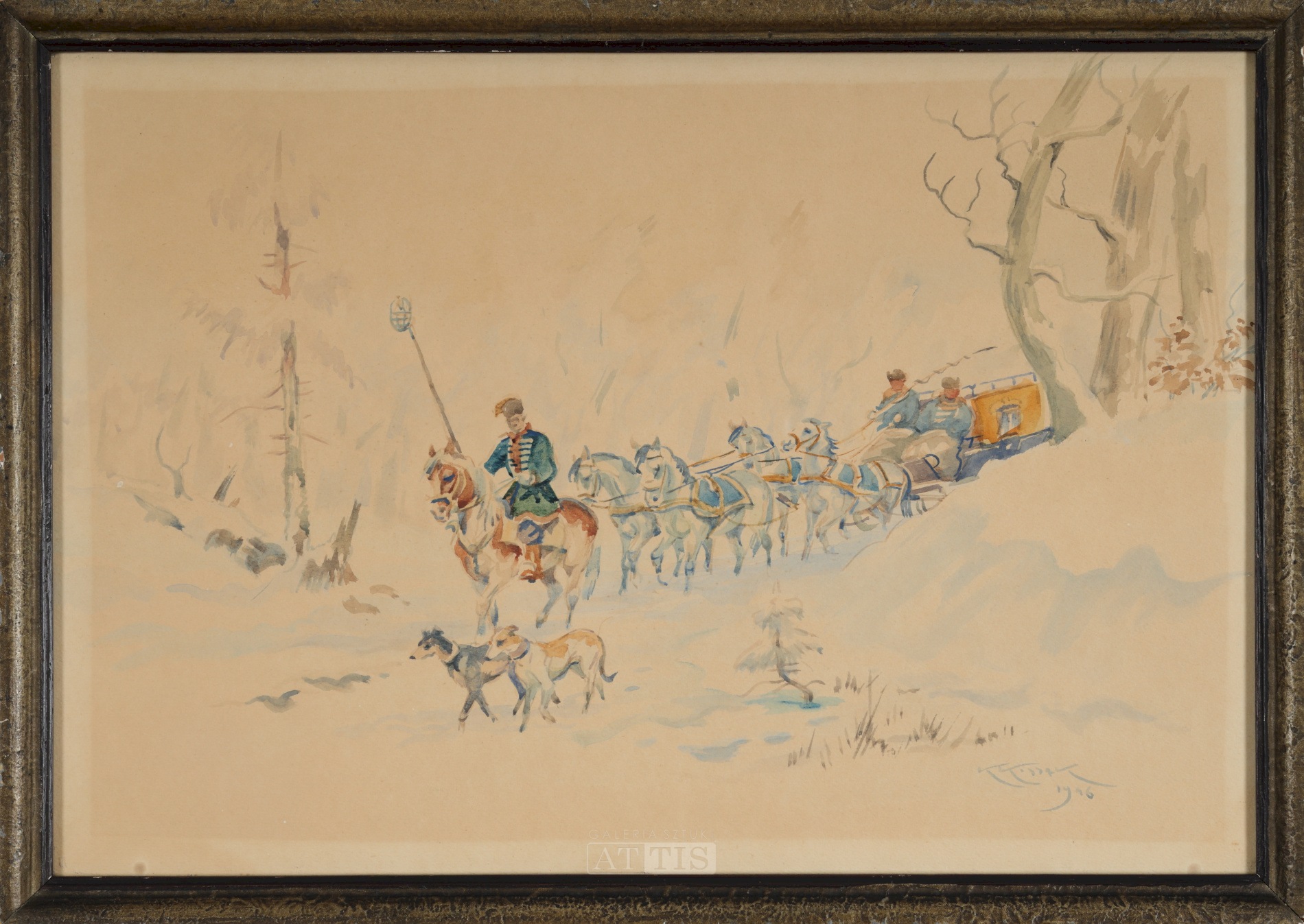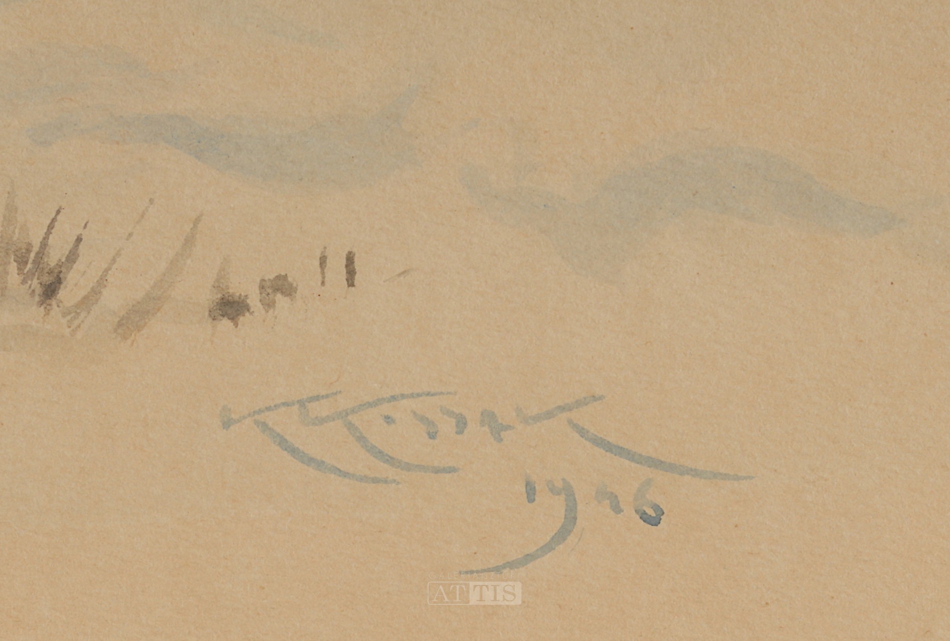 | Sygnowany i datowany p.d.: "KKossak | 1946" Przy krawędziach pracy widoczne odbarwienie papieru. | |