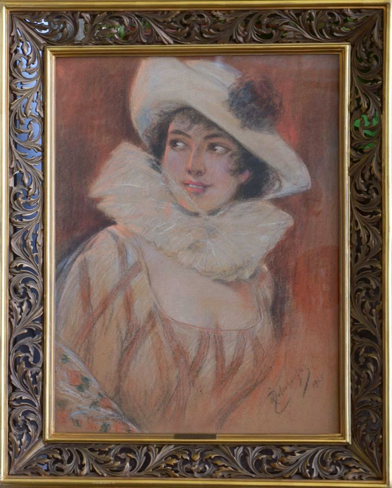 | Sygnowany p.d.: "KŻelechowski | 1920" Kasper Żelechowski w swojej twórczości często utrwalał kobiety z wyższych warstw społecznych, a także tworzył nastrojowe akty, często pastelem i węglem na czerpanym papierze. Jego portrety zawsze cechowały się umiejętnością uchwycenia cech charakteru modela. | |