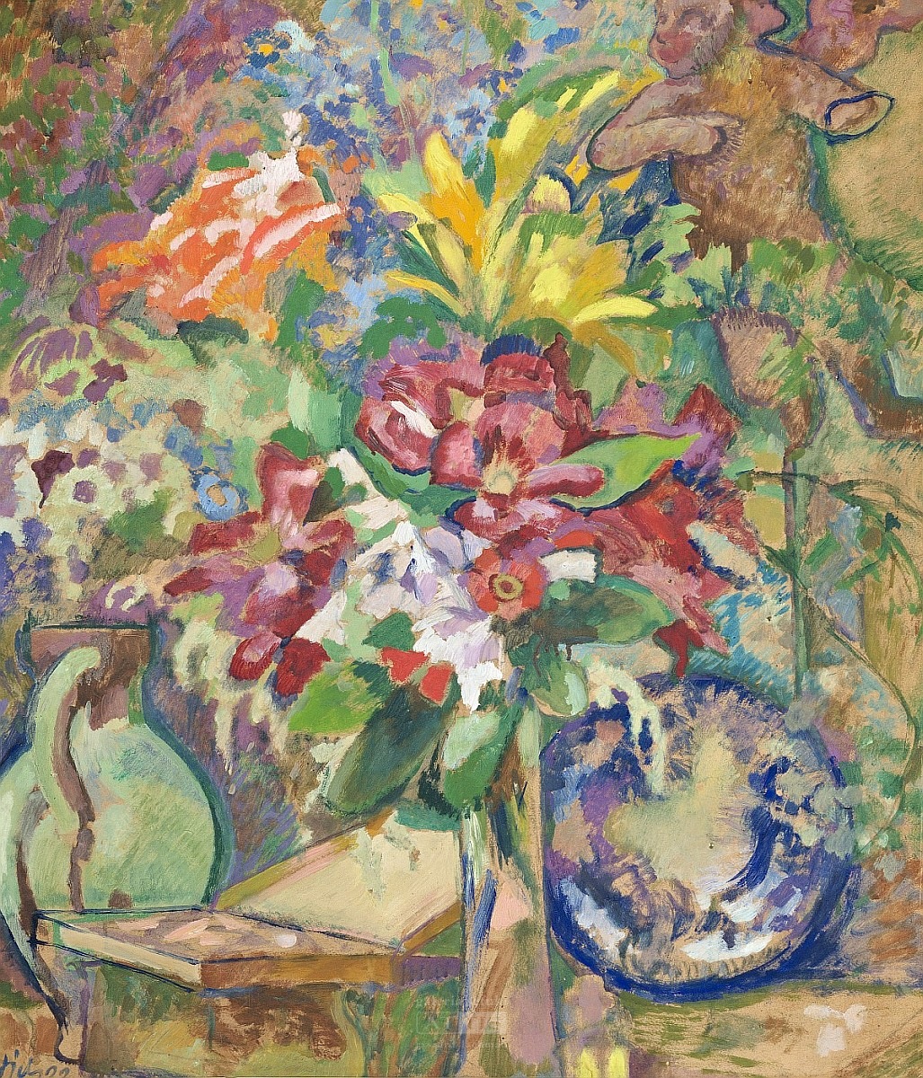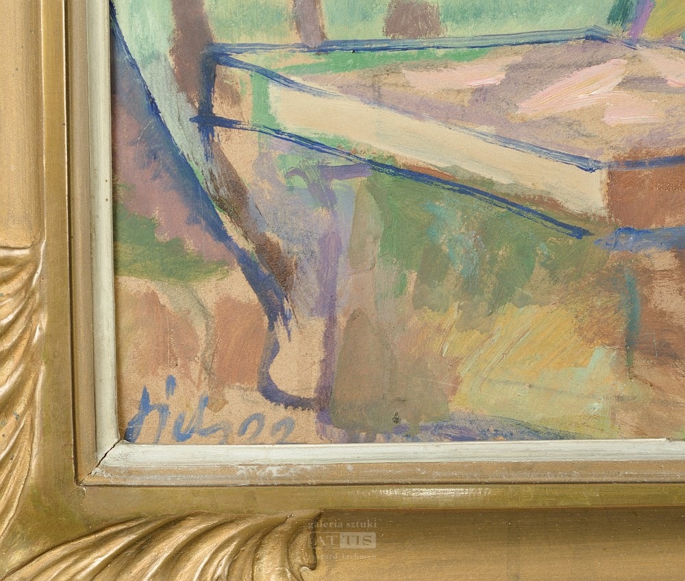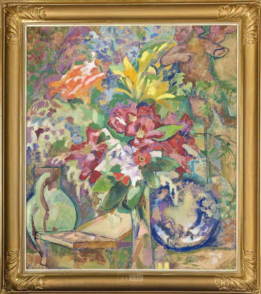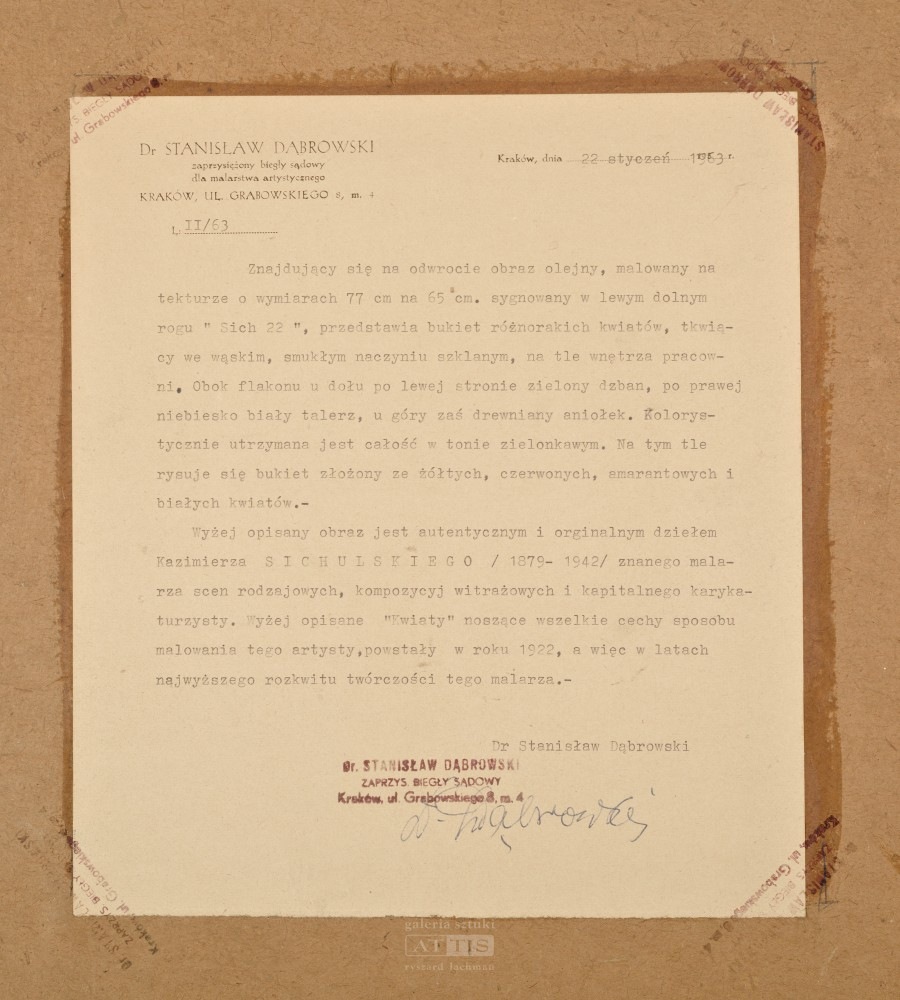 | Sygnowany i datowany l.d.: "Sich 22" Na odwrocie opinia dra Stanisława Dąbrowskiego. OPIS PRACY: Cechą rozpoznawczą sztuki Kazimierza Sichulskiego jest wyraźna, ekspresyjna, młodopolska linia, miękka plama barwna oraz intensywna kolorystyka o odważnych zestawieniach barwnych. Prezentowana praca posiada wszystkie wyżej wymienione elementy, choć przedstawia temat nieczęsty w dorobku artystycznym artysty, a mianowicie martwą naturę. Zestawienie różnorodnych przedmiotów – bukietu kwiatów w wazonie, pudełka czekoladek, dzbanka i fajansowego talerza, zostało ukazane na tle różnobarwnej draperii, co sprawia, że obraz posiada imponujące walory dekoracyjne, a przez duże zagęszczenie plam o odmiennej kolorystyce, przyciąga wzrok widza i zatrzymuje go na dłużej. Interesującym, nietuzinkowym dopełnieniem raczej klasycznej martwej natury jest widoczna w prawej górnej części pracy, niekompletnie zachowana rzeźba putta – defekt w postaci ubytku w partii lewej ręki aniołka poniekąd zaburza elegancję i harmonię pięknych przedmiotów, przypominając o ulotności czasu i kruchości istnienia. Dzieło Kazimierza Sichulskiego jest również znakomite pod względem formalno-warsztatowym. Artysta wykorzystał oryginalny kolor podłoża, gdzieniegdzie pozostawiając jego prześwity. Zwrócił również uwagę na szklane lub szkliwione elementy, takie jak dzban czy talerz, malując je w ten sposób, by farba lekko lśniła, podczas gdy całość obrazu prezentuje się jako matowa. | |