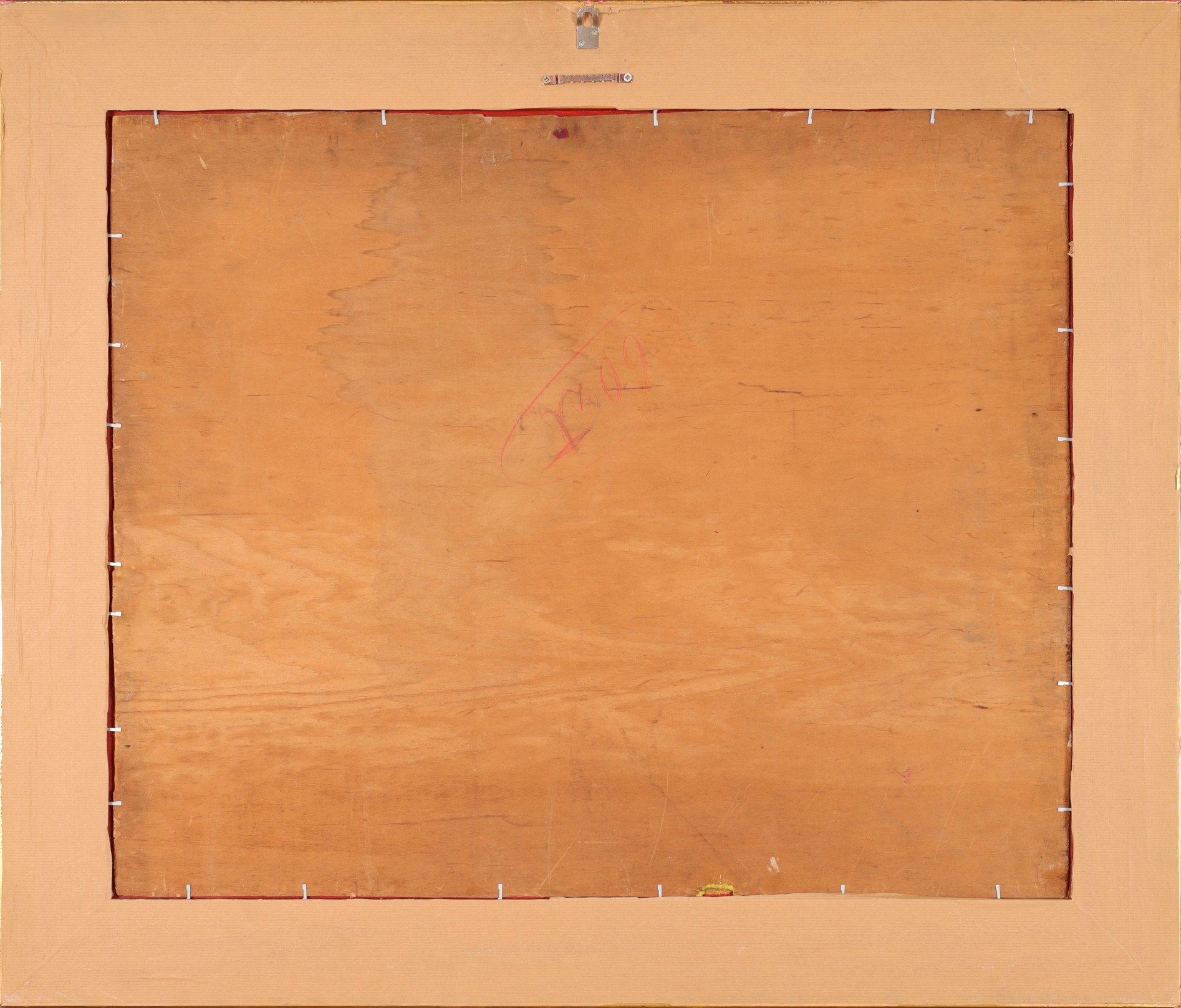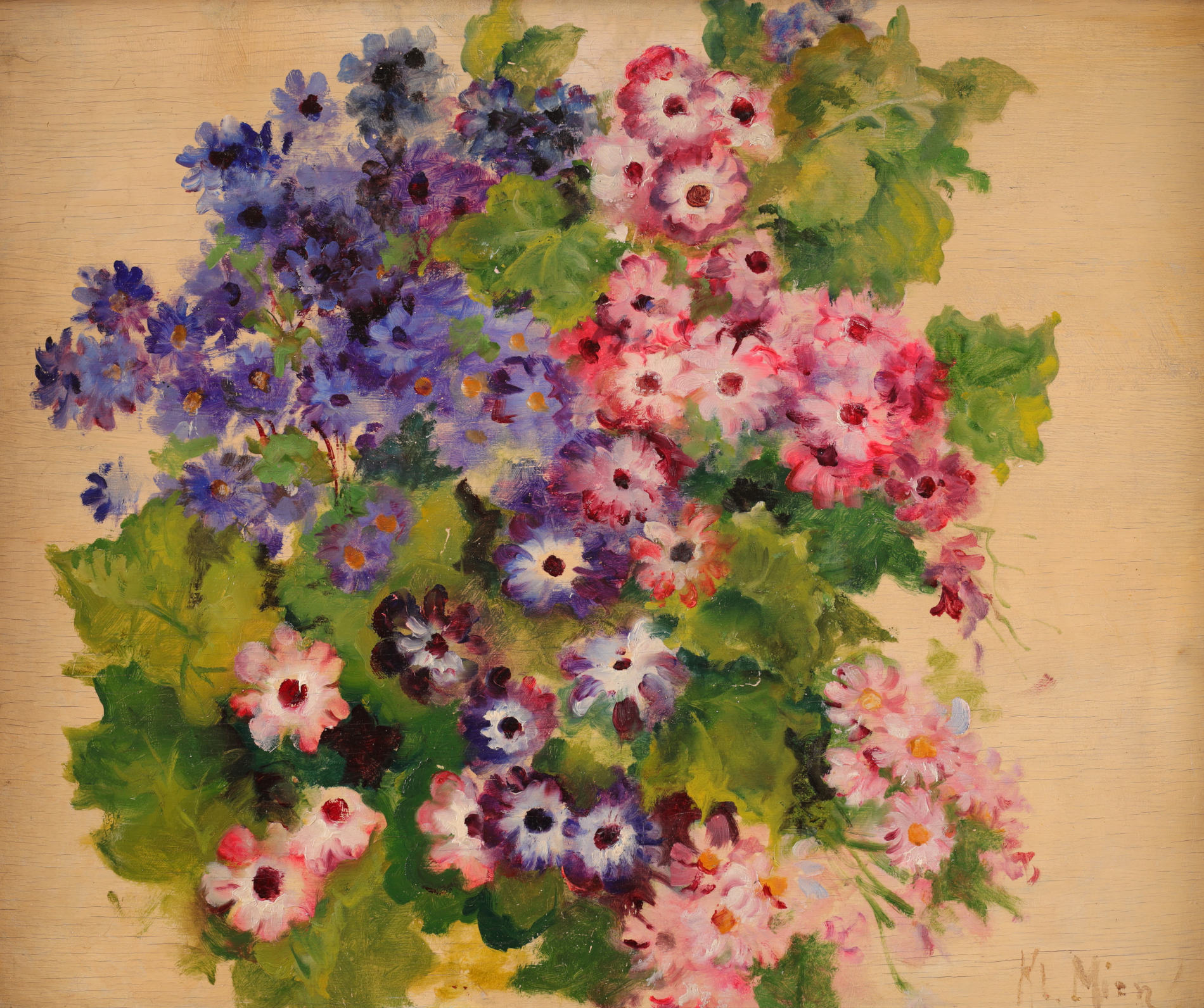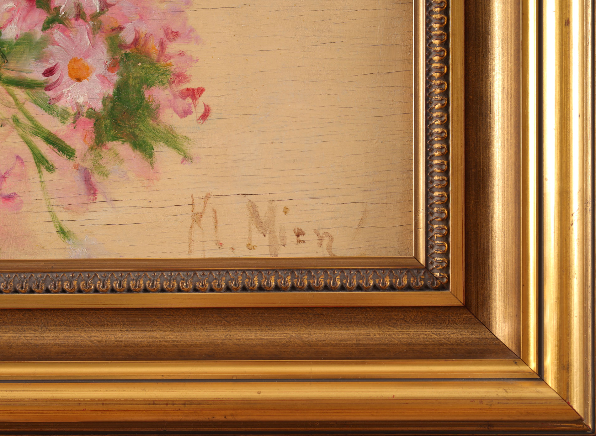 | Sygnowany p.d.: "Kl. Mien" Przy dolnej krawędzi (śr.d.) ok. 2,5 cm ubytek podłoża (niewidoczny w oprawie). Widoczne spękania sklejki. | |