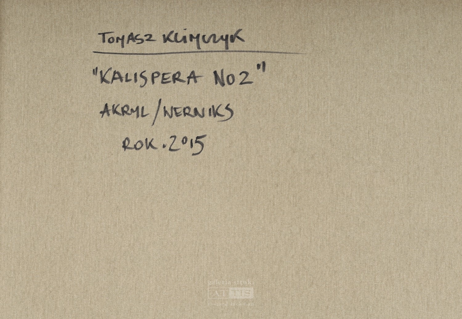 | Sygnowany i datowany l.d.: "TOMASZ KLIMCZYK 2015", p.d.: "KL | IMC | ZYK" (w ramce) Na odwrocie autorski opis. | |