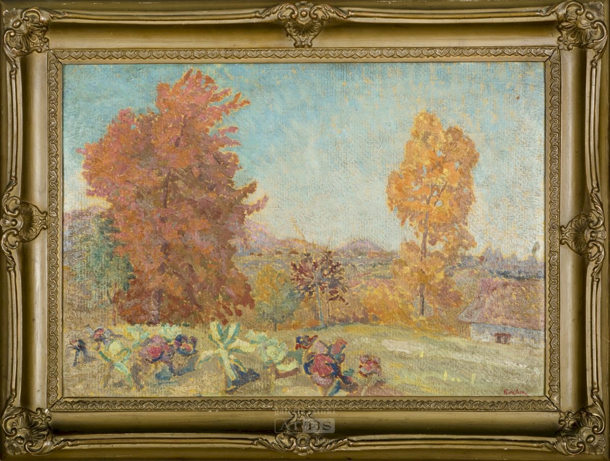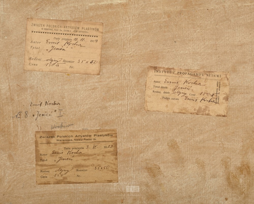 | Sygnowany p.d.: "Krcha" Opisany na odwrocie: "Emil Krcha | "Jesień" " Na odwrocie metka Instytutu Propagandy Sztuki, metka Związku Polskich Artystów Plastyków (Warszawa, kwiecień 1929) oraz metka Związku Polskich Artystów Plastyków (Kraków, listopad 1929). | |