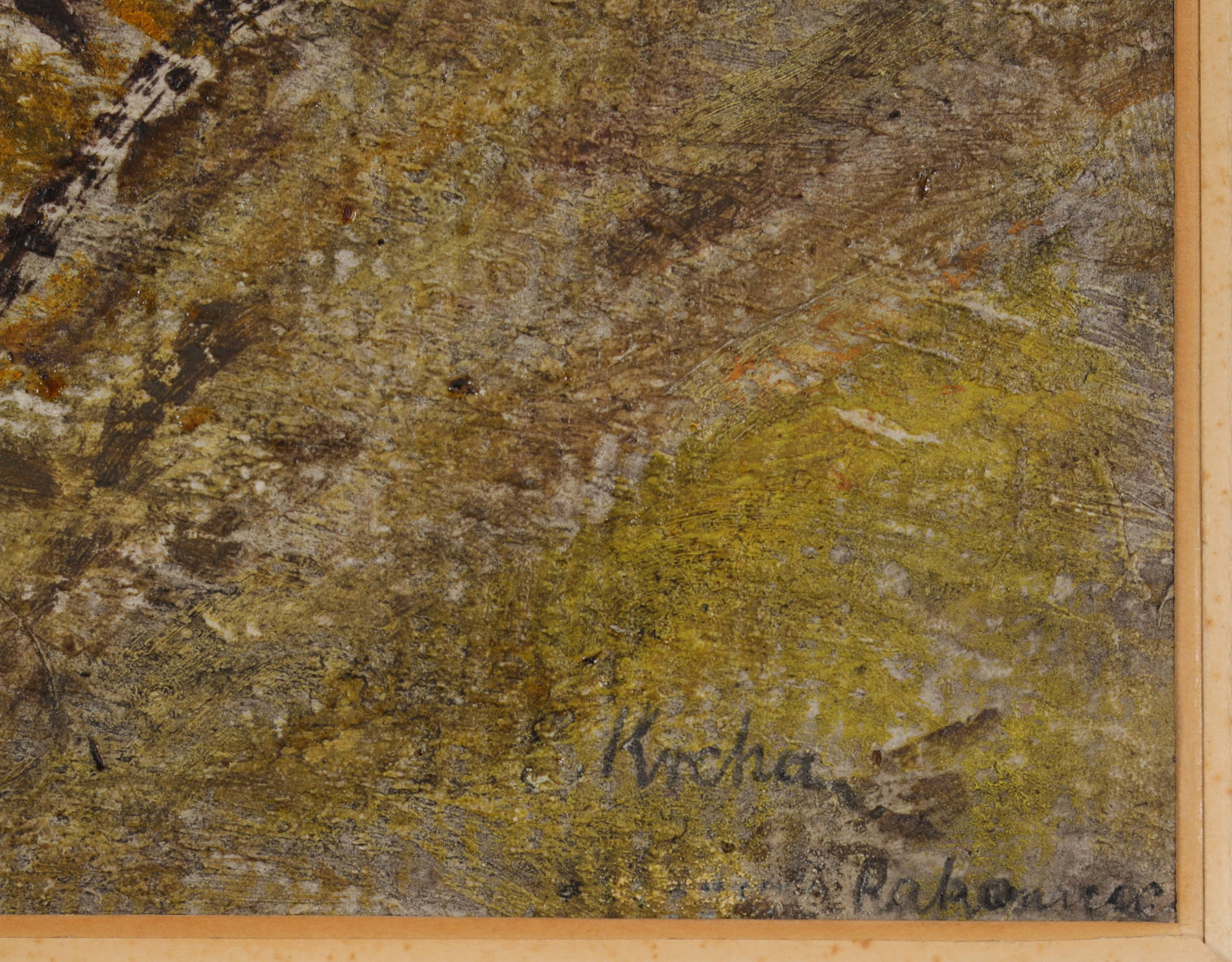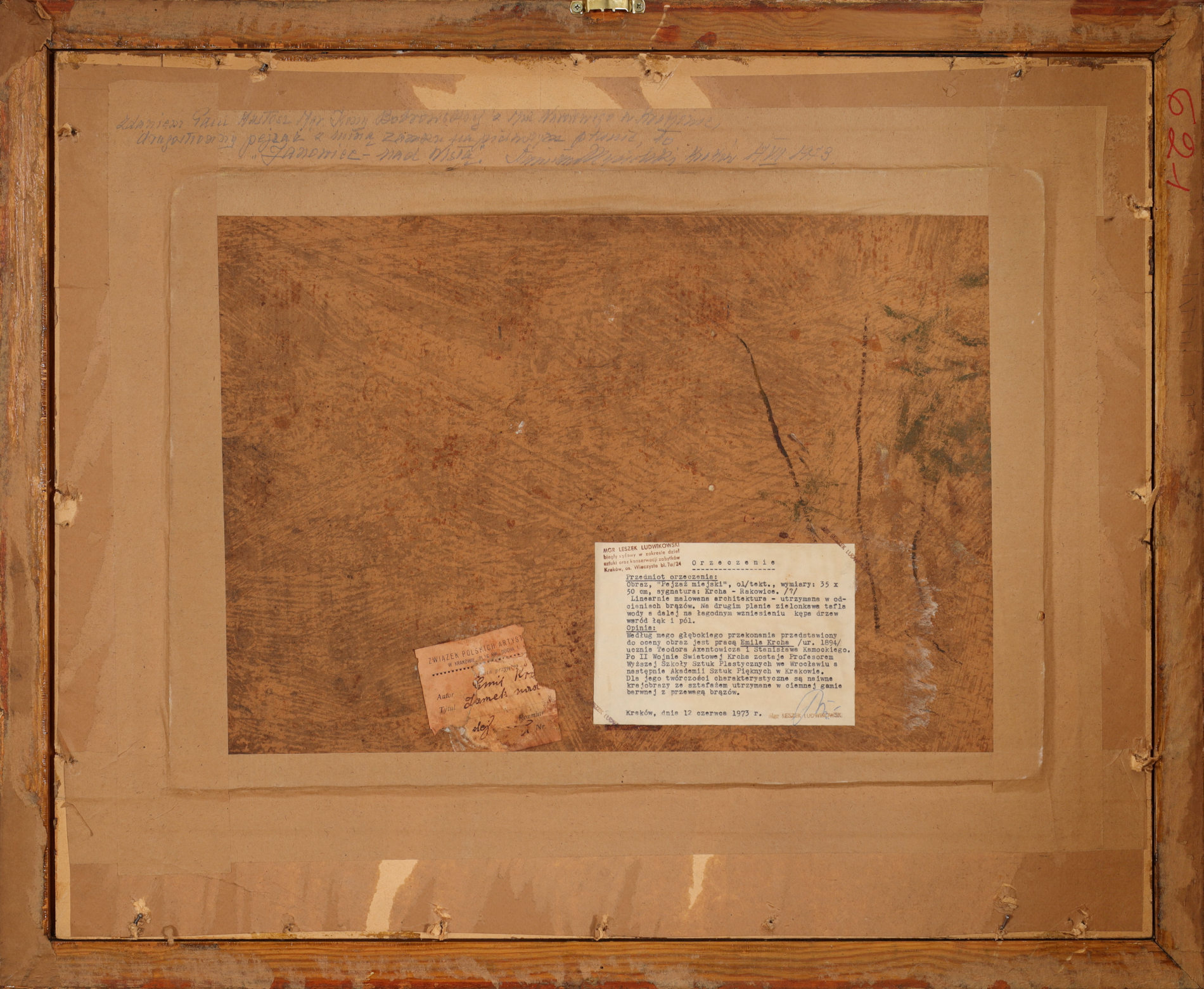 | Sygnowany ołówkiem p.d.: "E. Krcha." Opisany ołówkiem p.d.: "Rakowiec" Na odwrocie częściowo zachowana metka Związku Polskich Artystów Plastyków oraz opinia Leszka Ludwikowskiego z 1973 roku. Wtórnie opisany ołówkiem na odwrocie. | |