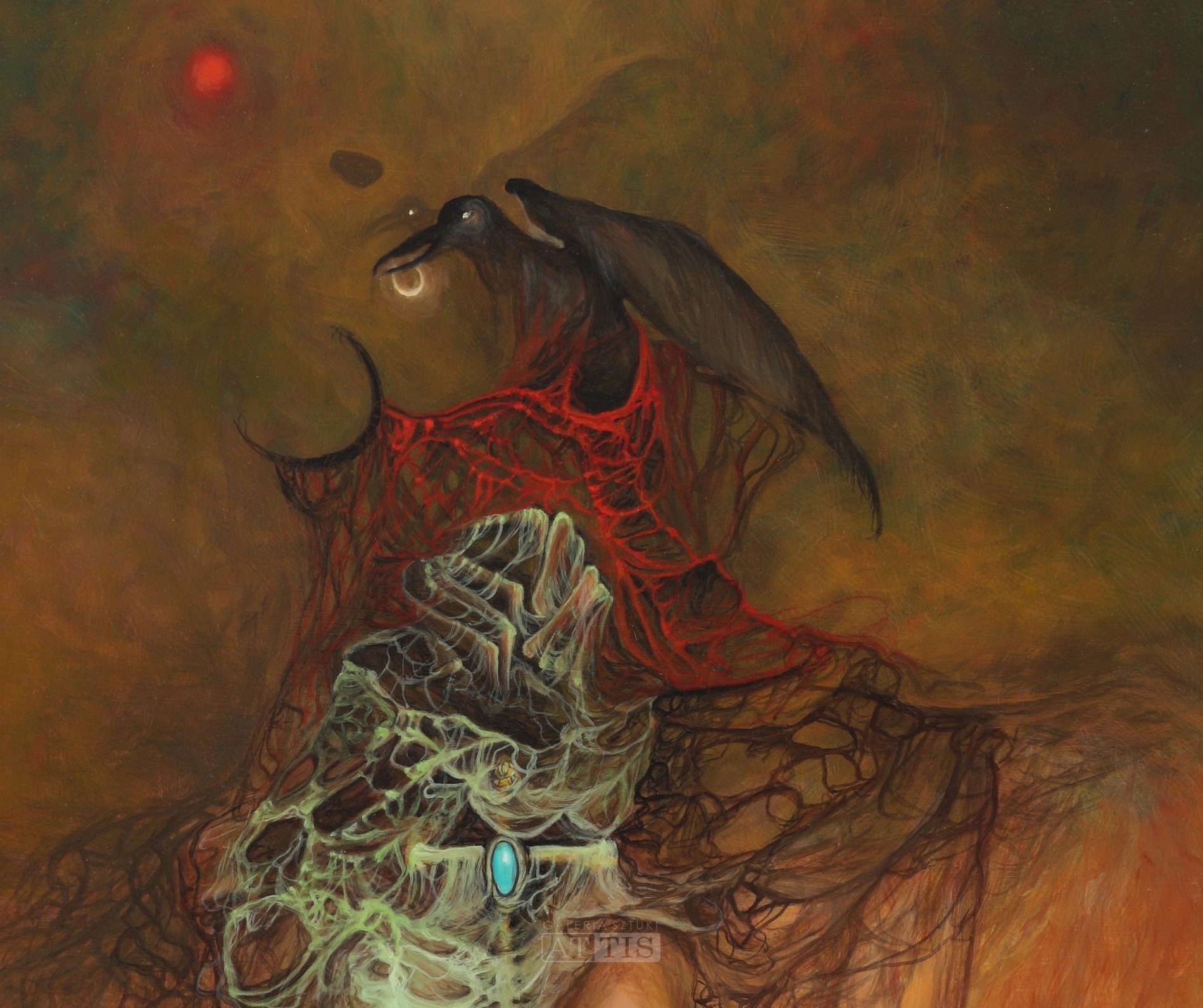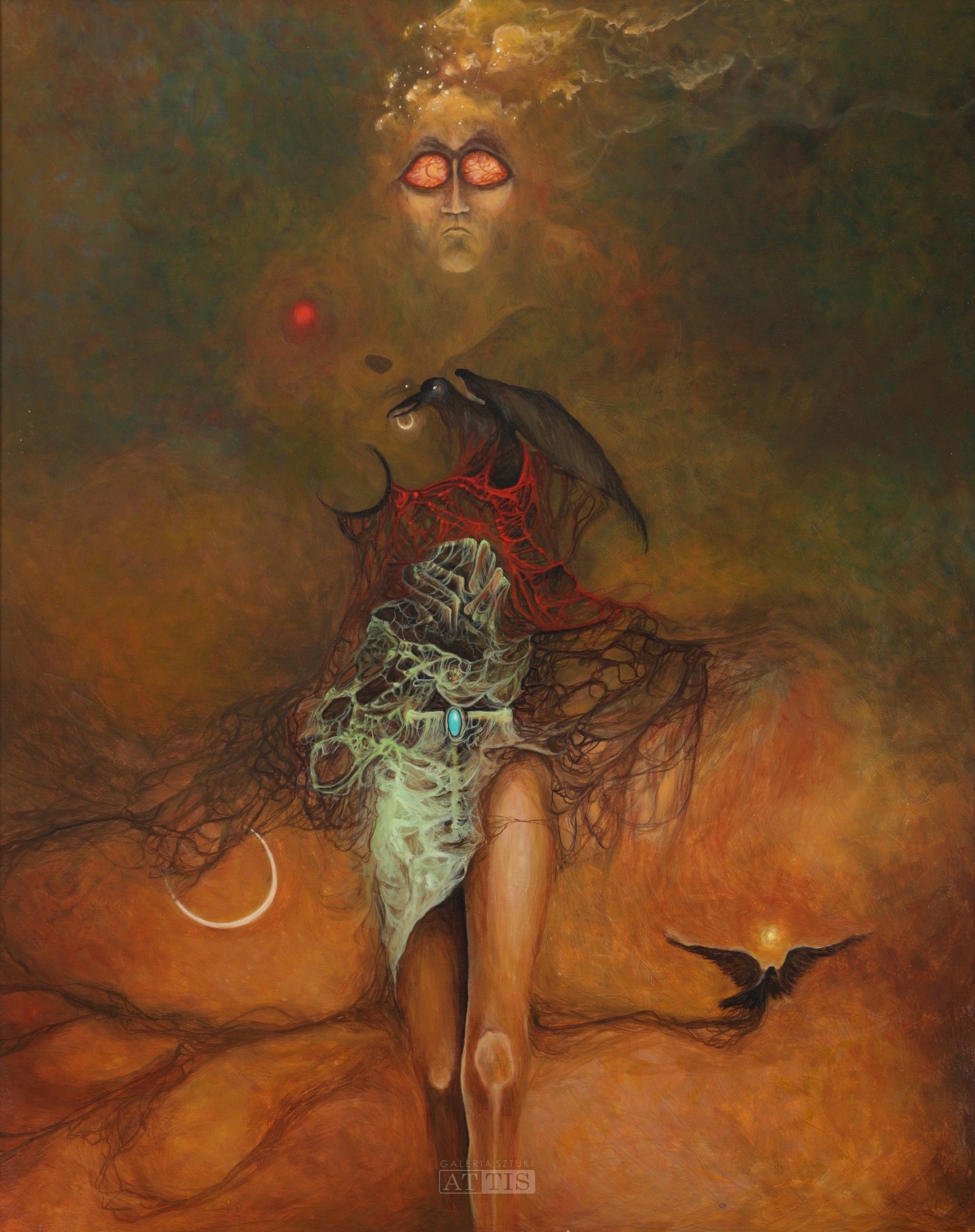 | Sygnowany na odwrocie: "Heksel. K." PROWENIENCJA: - zakup od artysty; - kolekcja prywatna. OPIS PRACY: Krzysztof Heksel jest znanym polskim malarzem-surrealistą, który w swoich pracach czerpie inspiracje z poetyki marzeń sennych. Pod względem formalnym u tego twórcy jest dostrzegalna fascynacja malarstwem Zdzisława Beksińskiego. Kompozycje tworzone przez malarza w swoim założeniu mają być otwarte na wielość interpretacji i zachęcać odbiorców do intelektualnej kontemplacji. Na szczególną uwagę zasługuje również precyzja i maestria techniczna, dzięki którym kreowane przez Krzysztofa Heksla światy i senne wizje w sugestywny sposób oddziałują na odbiorców. W prezentowanym obrazie artysta ukazał tajemniczą kobiecą sylwetkę, która wydobywa się z obłoków. W centralnej części postać składa się z wielobarwnych amorficznych sieci. Całość została uzupełniona obecnością czarnych ptaków – kruków i półksiężyców, które wprowadzają nastrój tajemniczości i skojarzenia z symboliką okultyzmu. Barwy w obrazie w subtelny sposób przenikają się sprawiają wrażenie gwiezdnej mgławicy. | |