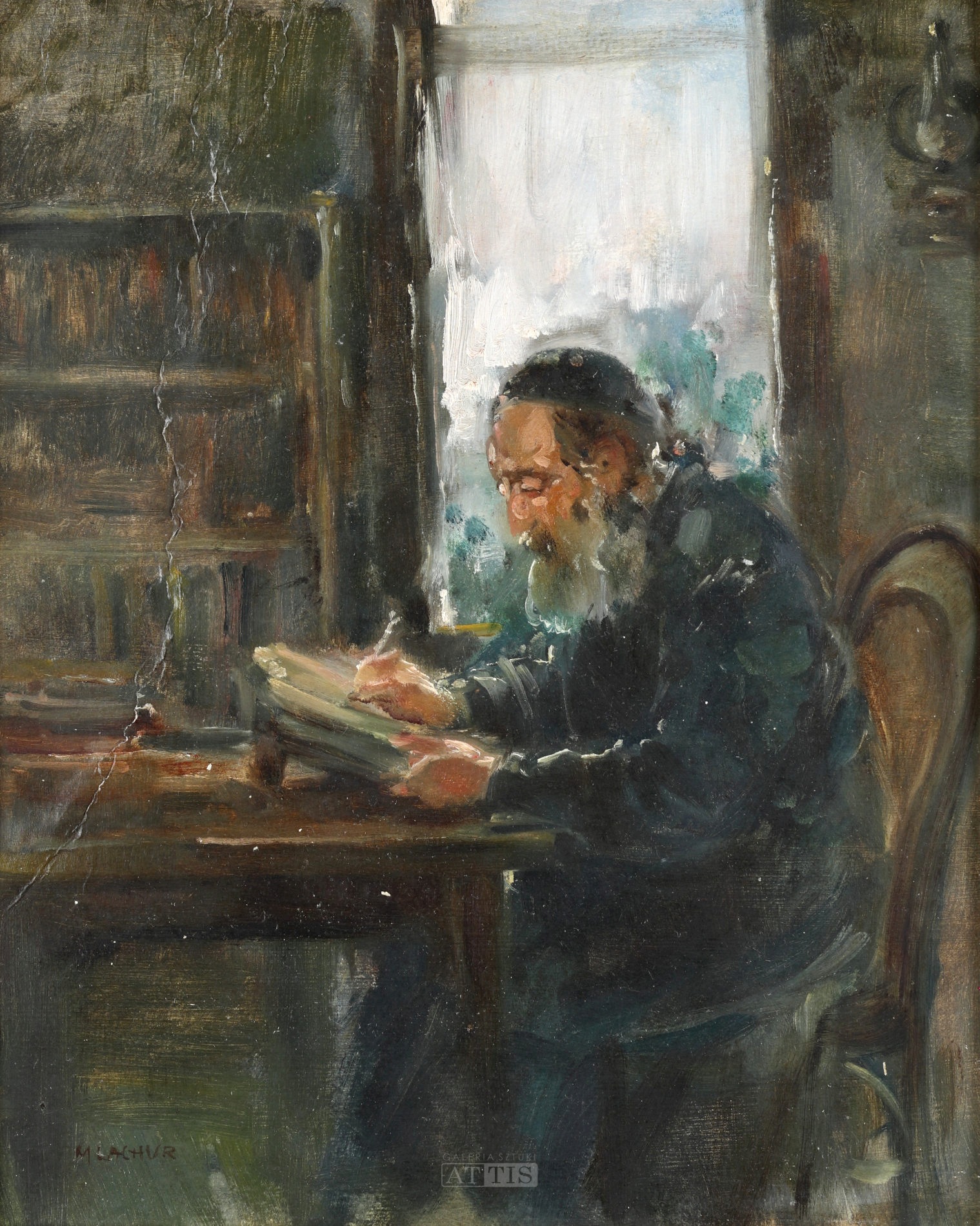 | Sygnowany l.d.: "M LACHUR" Opisany na odwrocie: "M. LACHUR | RABIN Z CYKLU GETTO (STUDIUM DO OBRAZU) | 33 x 27 cm | OLEJ PŁYTA MALARSKA | 1993" Po lewej stronie (l.g.) widoczny ślad po uszkodzeniu górnej warstwy tektury. | |