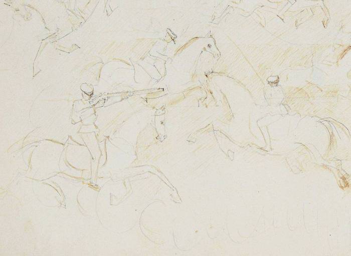 Wspomniana praca powstała w 1915 roku, kiedy artysta służył w 5. baterii 1. Pułku Artylerii Polowej Legionów Polskich. Rysunek przedstawia zbrojnych na koniach w bitewnym chaosie. Postacie są uproszczone, wydają się wirować w powietrzu, a w oddali widoczne są fragmenty drzew i budynków oddane zaledwie kilkoma pociągnięciami piórka. W pracy widoczna jest zapowiedź cech dojrzałej twórczości Leona Chwistka: uproszczenie kształtów i dążenie do oddania dynamiki ruchu.