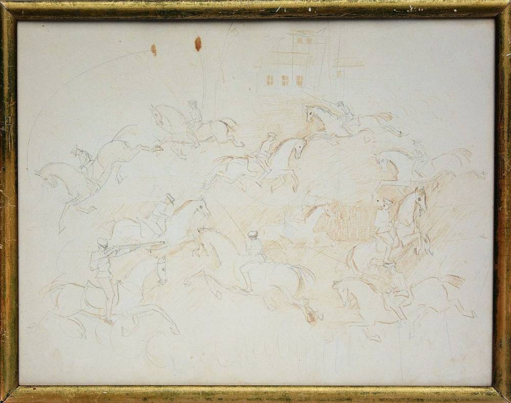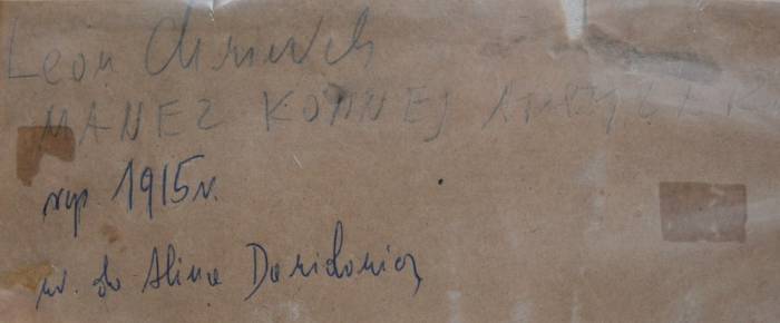 | Praca została zakupiona przez Muzeum Sztuki w Łodzi. Rysunek będzie prezentowany na wystawie "Wielka wojna" (23 XI 2018 - 17 III 2019). Do pracy dołączony jest opis pracy oraz podpis córki artysty - Aliny Dawidowiczowej. Praca była reprodukowana w książce W. Wyganowska, "Sztuka legionów polskich 1914-1918", Wydawnictwo Neriton, Warszawa 1994, il. 6. Praca była wystawiana na wystawie: "Wychowankowie i pedagodzy krakowskiej Akademii Sztuk Pięknych w Legionach", Kraków 1988. Na odwrocie pracy znajduje się szkic scenografii wykonany ołówkiem. Opis pracy: W czasie powstania prezentowanej pracy Maneż konnej artylerii (1915), artysta służył w wojsku. Od 1915 roku przebywał w 5 baterii 1 Pułku Artylerii Polowej Legionów Polskich. Co powoduje przypuszczać, że Leon Chwistek mógł wykonać opisywany szkic na podstawie sceny widzianej na żywo. Na odwrocie pracy znajduje się szkic scenografii. Ekspresja kreski jest zbliżona do kompozycji "Maneż konnej artylerii". Warto wspomnieć, Leon Chwistek był człowiekiem wielostronnym, zajmował się malarstwem, teorią filozofii, logiką oraz matematyką. W swoich tekstach wypowiadał się na temat koncepcji teatru. W latach 30. artysta pisał: "Projektowałem wówczas przerzucenie sceny na wielki amfiteatr, dzięki czemu można by wystąpić równocześnie z niesłychanym bogactwem formy i barwy. Widownia w kształcie ogromnego słoika, miała znajdować się w środku i obracać z wolna dookoła osi, celem umożliwienia widzom objęcia całości przedstawienia. (...) Przypuszczam, że idea strefizmu, tj. podziału sceny na strefę smutną i wesołą, zimną i ciepłą, krągłą i wydłużoną, złośliwą i pogodną, albo na większą liczbę tych stref, doprowadzi z czasem do narodzenia się nowych wartości w dziedzinie widowiska i teatru." Prawdopodobne jest, że prezentowany szkic jest zarysem idei strefizmu w teatrze. Niezwykle podobną kompozycję możemy znaleźć w pracy "Projekt scenografii - praca dwustronna" (tusz, papier, 22,5 x 28 cm (w świetle passe-partout, Aukcja Prac na Papierze Dom Aukcyjny DESA UNICUM, 19 luty 2015) [Bibliografia: Leon Chwistek, Wybór pism estetycznych, wprowadzenie i opracowanie, Teresa Kostyrko, Kraków 2004, s. 159-160.] | |