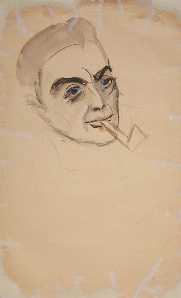 | Rysy twarzy przedstawionej postaci wskazują, że jest to portret Tytusa Czyżewskiego (1880-1945). Artyści należeli do Grupy Formistów. Warto wspomnieć, że twórczość Czyżewskiego nie pozostawała obojętna artyście, co zaowocowało artykułem pt. "Tytus Czyżewski a kryzys formizmu" (1921). Omawiana akwarela przedstawia mężczyznę o wyraźnych rysach twarzy, dużych oczach i wydatnym łuku brwiowym. Te elementy zostały szczególnie podkreślone w kompozycji. Podobne ujęcia widzimy na autoportretach Tytusa Czyżewskiego (Autoportret ok. 1918-1921, tusz, papier, Muzeum Narodowe, Autoportret, 1929). W obu przypadkach artyście towarzyszy fajka, która również pojawia się na prezentowanej pracy. Warto wspomnieć również, że Leon Chwistek w latach 20. wykonywał liczne wizerunki postaci ze środowiska krakowskiego.