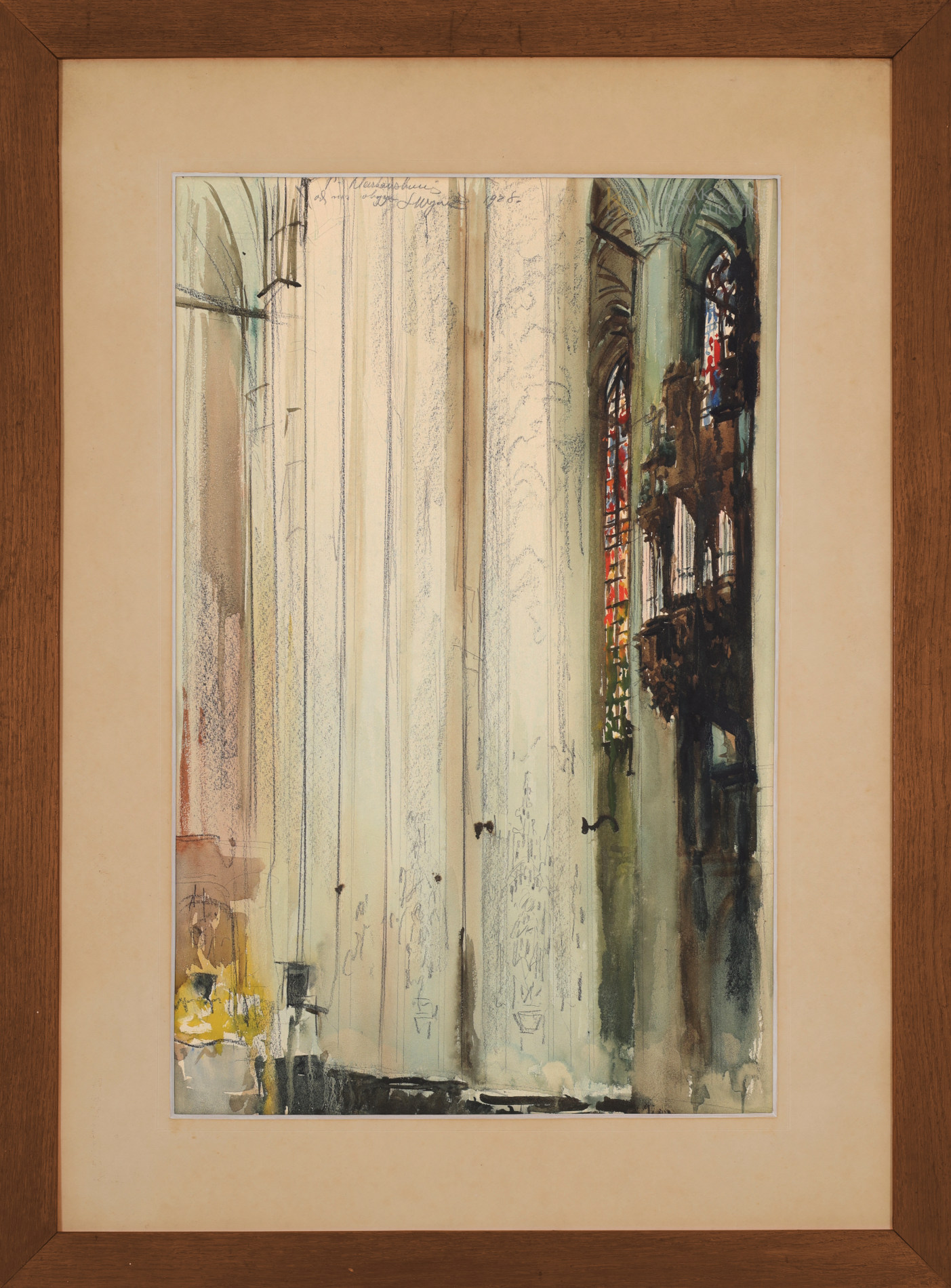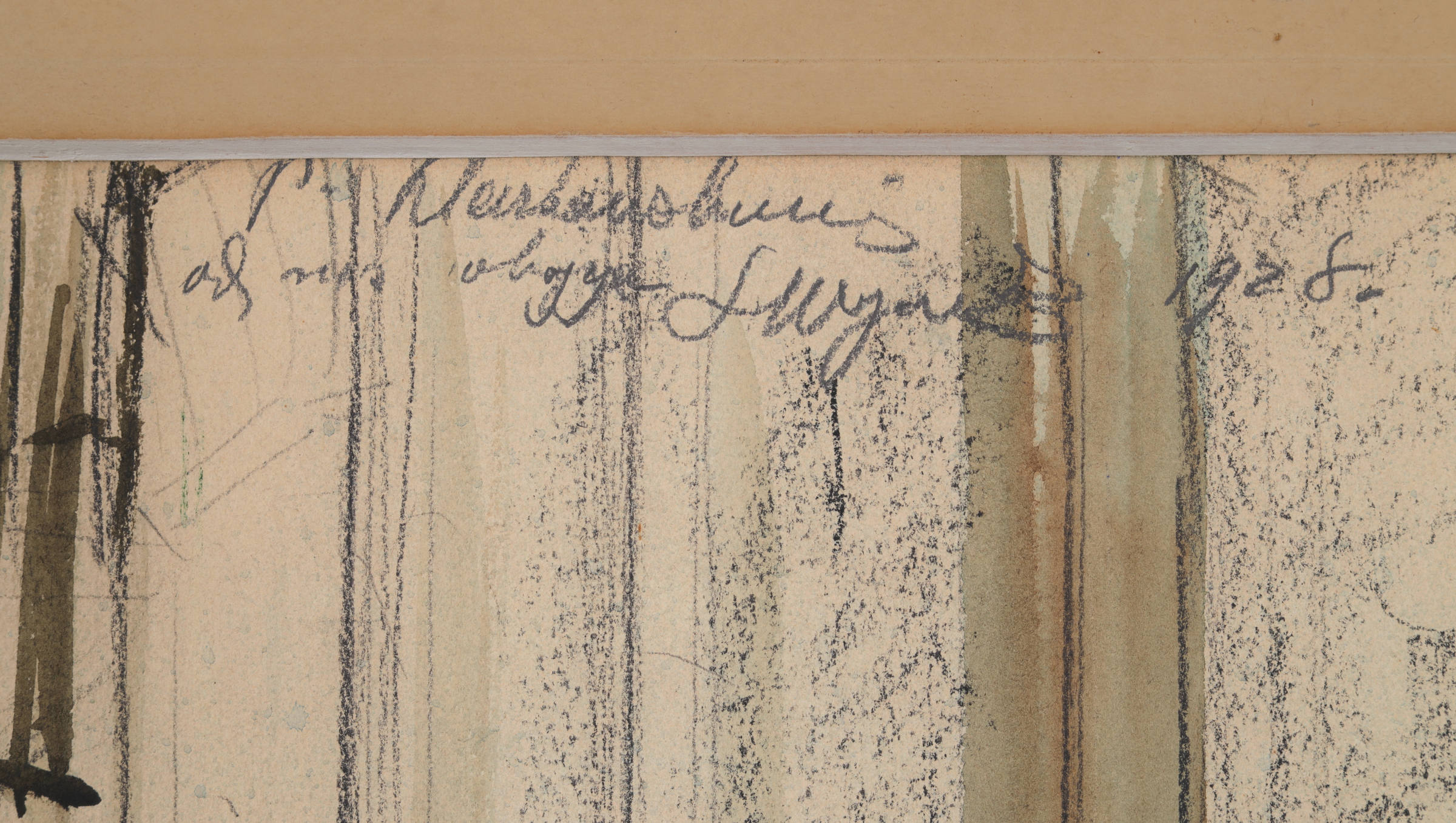 | Sygnowany i datowany śr.g.: "LWyczół 1928." Śr.g. dedykacja autorska. Na odwrocie metka Towarzystwa Przyjaciół Sztuk Pięknych w Krakowie z wystawy "Leon Wyczółkowski (1852-1936). Wystawa pośmiertna" zorganizowanej w czerwcu 1937 roku. Praca została wymieniona na pozycji nr 155 w wykazie dzieł opublikowanym w katalogu "Leon Wyczółkowski (1852-1936). Wystawa pośmiertna", Towarzystwo Przyjaciół Sztuk Pięknych w Krakowie, czerwiec 1937, s. 24. OPIS PRACY: W twórczym dorobku Leona Wyczółkowskiego zachwyca mnogość podejmowanych tematów oraz różnorodność stosowanych technik malarskich. Szczególna wrażliwość na światło, kolor i piękno ojczystego otoczenia przejawiała się u artysty w odtwarzaniu wrażeń wynikających z zetknięcia nie tylko z naturą, ale także z materialnymi śladami przeszłości. Motywy architektoniczne w twórczości Leona Wyczółkowskiego były wynikiem licznych pobytów w polskich miastach, które zaowocowały powstaniem zarówno prac malarskich, rysunkowych, jak i cykli graficznych. Wykonana w latach 20. ubiegłego stulecia praca, prezentowana w 1937 roku na wystawie pośmiertnej artysty w krakowskim Towarzystwie Przyjaciół Sztuk Pięknych, ukazuje fragment wnętrza dawnego kościoła franciszkanów (obecnie Wniebowzięcia NMP) w Toruniu. | |