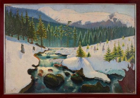 | Sygnowany p.d.: "Leszko" Na odwrocie odręczna metka z opisem obrazu. Widoczne lokalne wybrzuszenia podłoża. PROWENIENCJA: - kolekcja rodziny artysty. OPIS PRACY: Obraz "Poranek na Wiśle z Tyńcem w tle" przedstawia często odmalowywany przez Ludwika Leszko pejzaż z Wisłą i widokiem na opactwo Benedyktynów. Postaci widoczne w centrum obrazu - sześciu atletycznie zbudowanych mężczyzn na łodzi - to piaskarze, także kilkukrotnie ukazywani przez artystę w innych pracach. Powierzchnia obrazu sprawia wrażenie migotliwej, bliki na wodzie i smugi światła na nagich torsach piaskarzy oddają charakter porannego słońca. Atmosfera została podkreślona przez bardziej stonowany kolorystycznie, jakby zamglony widok Tyńca w tle. Gama barwna, choć szeroka, jest bardzo spójna i harmonijna. Na pierwszym planie pociągnięcia pędzla są wyraźnie krótsze, potęgują wrażenie migotania światła. Krajobraz w oddali został złożony z dużych, swobodnie nakładanych plam koloru, co dodaje całemu przedstawieniu trójwymiarowej głębi. Obraz został sprzedany na XIII Aukcji Dzieł Sztuki Krakowskiego Domu Aukcyjnego (16 III 2022) [ZOBACZ WYNIKI] | |