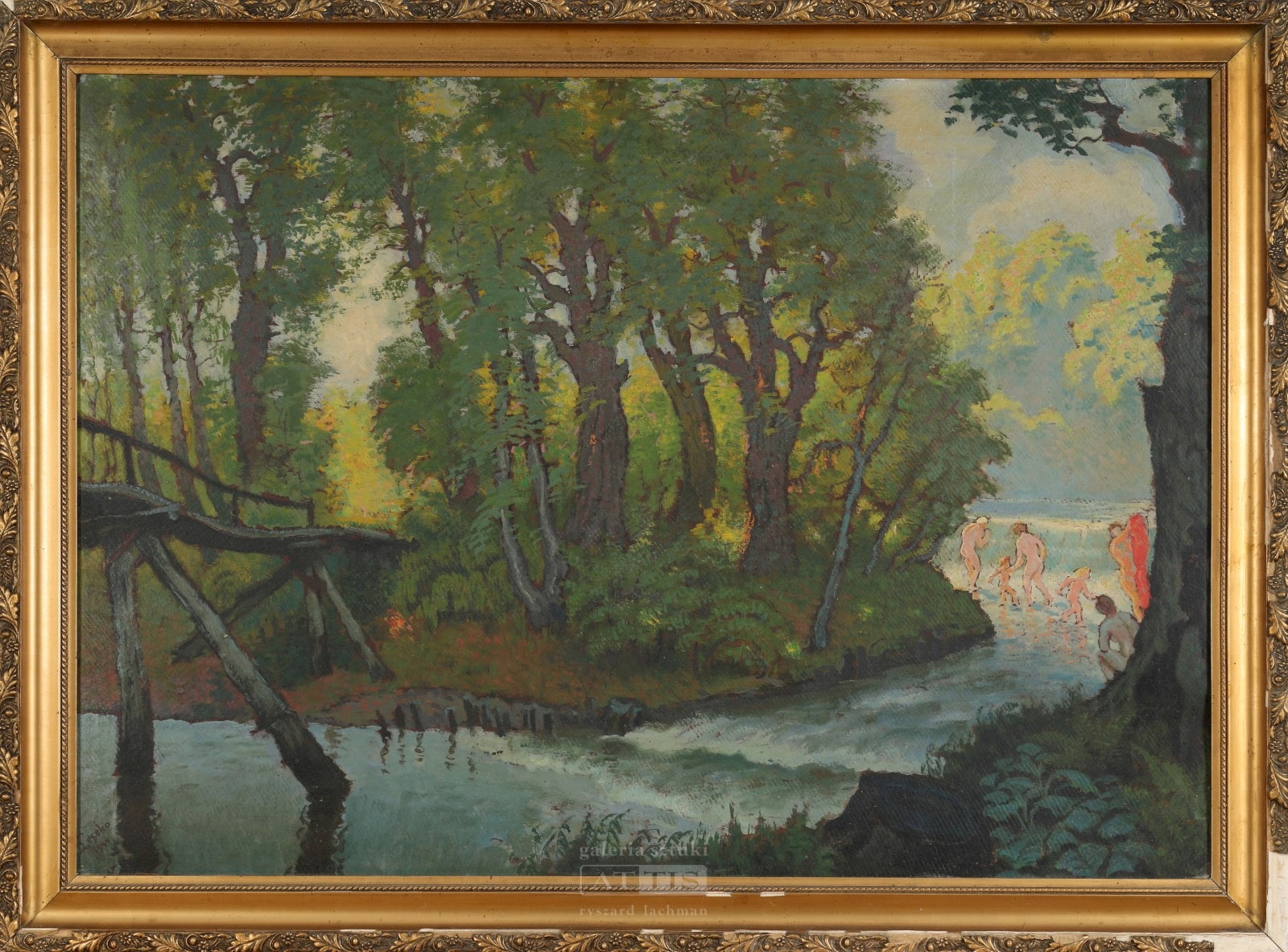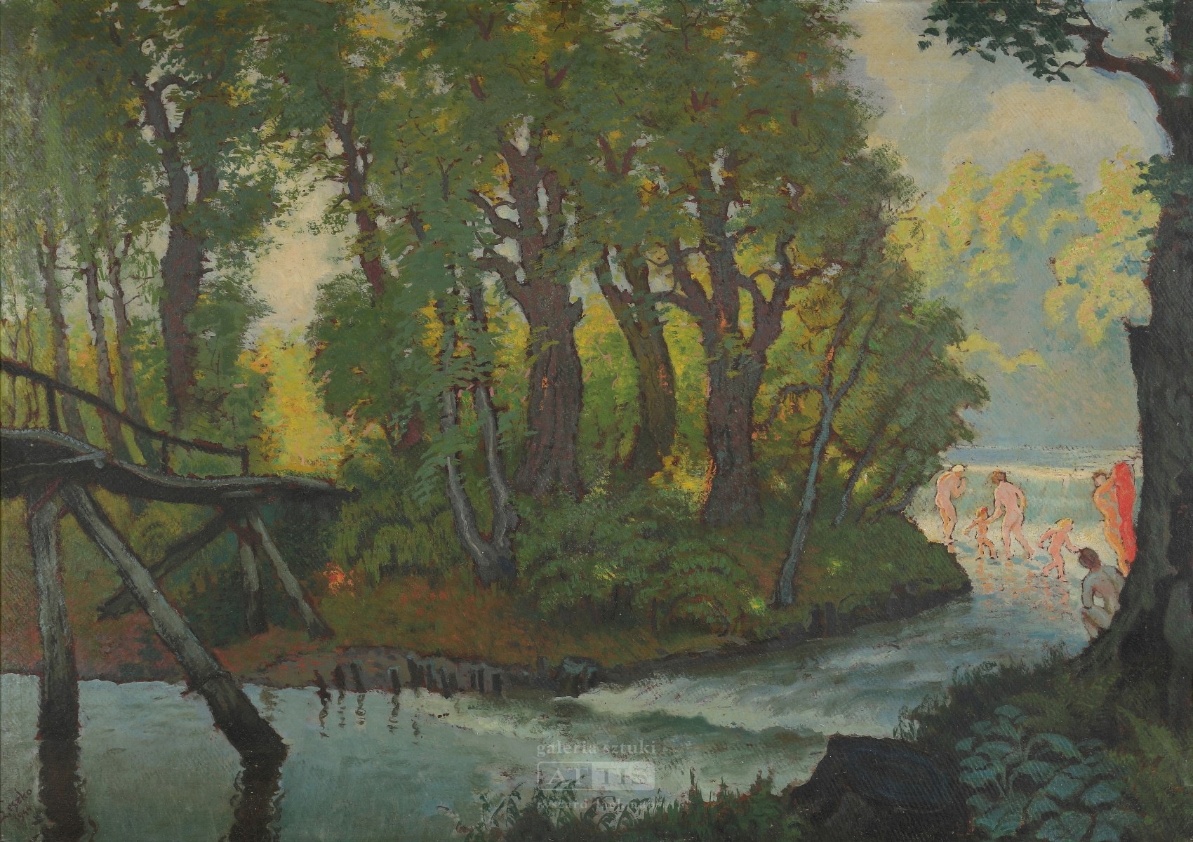 OPIS PRACY: W twórczości Ludwika Leszko motyw rzeki był niezwykle popularny. Artysta wykorzystywał przedstawienia wody do ukazania interesujących zestawień barw i światła. W obrazie "Kąpiel w rzece" malarz ujął gaj wypełniony drzewami o potężnych konarach oraz bujną roślinnością. Na pierwszym planie ukazał rzekę, nad którą z lewej strony został przerzucony drewniany most, z kolei z prawej przedstawił grupę kąpiących się postaci. Sylwetki ludzi zostały jedynie nakreślone i wypełnione cielistymi barwami, zdynamizowanymi plamami światła i cienia. Człowiek jest tu więc ukazany jako część natury. Obraz można podzielić na dwie strefy - pierwsza została ukazana w półmroku, zaś druga w pełnym świetle. W ten sposób Ludwik Leszko osiągnął efekt głębi i interesującą gradację kolorów, wpływającą na idylliczny charakter całego przedstawienia. | |