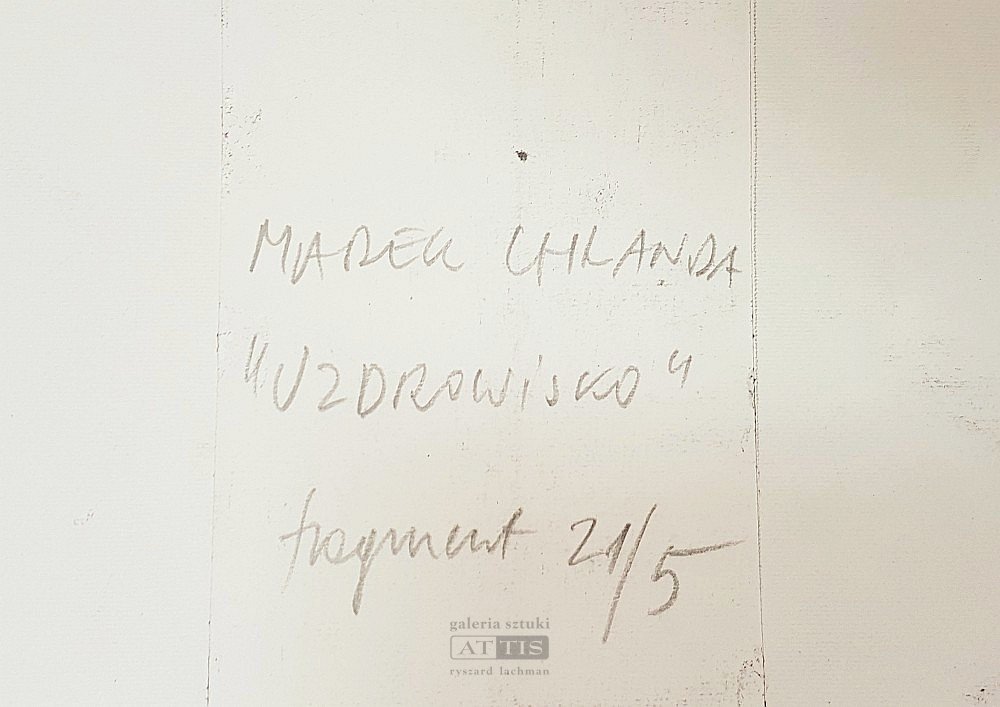 | Sygnowany i opisany na odwrocie ołówkiem: "MAREK CHLANDA | "Uzdrowisko" | fragment 21/5" Praca składa się z dwóch sklejonych ze sobą arkuszy. | |