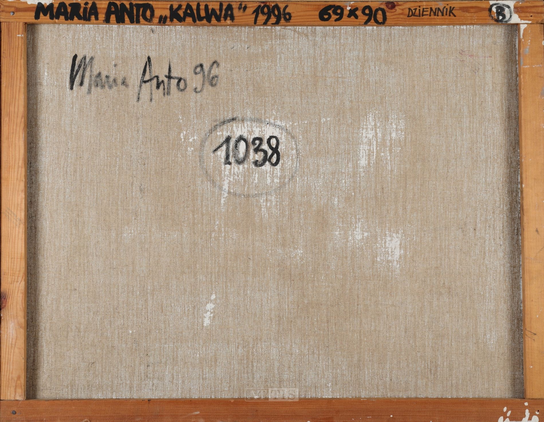 | Sygnowany p.d.: "Maria Anto" Opisany na odwrocie: "Maria Anto 96 | 1038" Opisany na blejtramie: "MARIA ANTO KALWA 1996 69 x 90 DZIENNIK B" | |