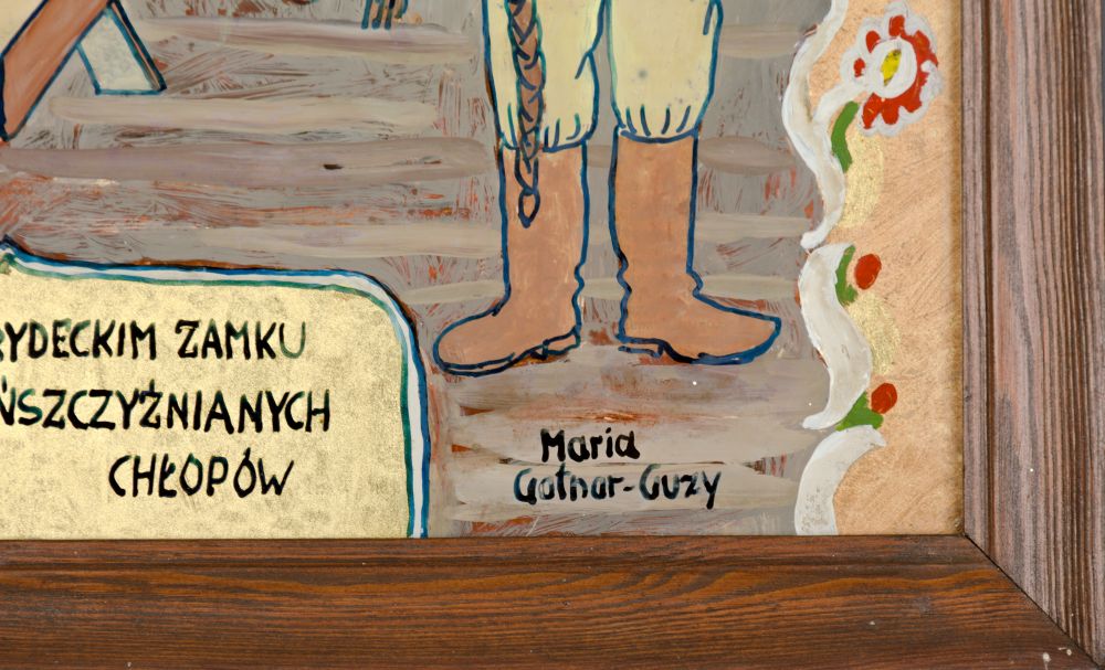 | sygn. p.d.: "Maria | Gatnar-Guzy" OPIS PRACY: Ondraszek to na wpół legendarna postać, zbójnik związany z terenem Beskidu Śląsko-Morawskiego. W ludowych opowieściach przetrwał jako ten, który sprzeciwiał się możnym i ochraniał ludność wiejską. W prezentowanym obrazie Marii Gatnar-Guzy długowłosy Ondraszek został ukazany w stroju Górali śląskich. Stojący w centrum kompozycji zbójnik oddziela grupę smutnych chłopów od wąsatego szlachcica, planującego wymierzyć tym pierwszym chłostę trzymanym w ręce sznurem. Oglądająca wydarzenie z okna zamku kobieta w zielonej sukni przyklaskuje działaniom Ondraszka, który, jak mówi napis w dolnej części kompozycji „nie pozwolił bić pańszczyźnianych chłopów”. Obraz został namalowany w sposób linearny, niebieskie kontury ograniczają płaskie plamy barwne żywych kolorów. Dekoracyjności przedstawieniu dodają malowane na miedzianozłotym tle ludowe, florystyczne ornamenty otaczające całość kompozycji. PRACA ZOSTAŁA SPRZEDANA na IV Aukcji Dzieł Sztuki w Krakowskim Domu Aukcyjnym (16 lipca 2020) [zobacz więcej - link] | |