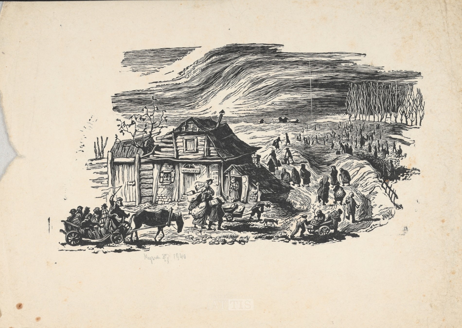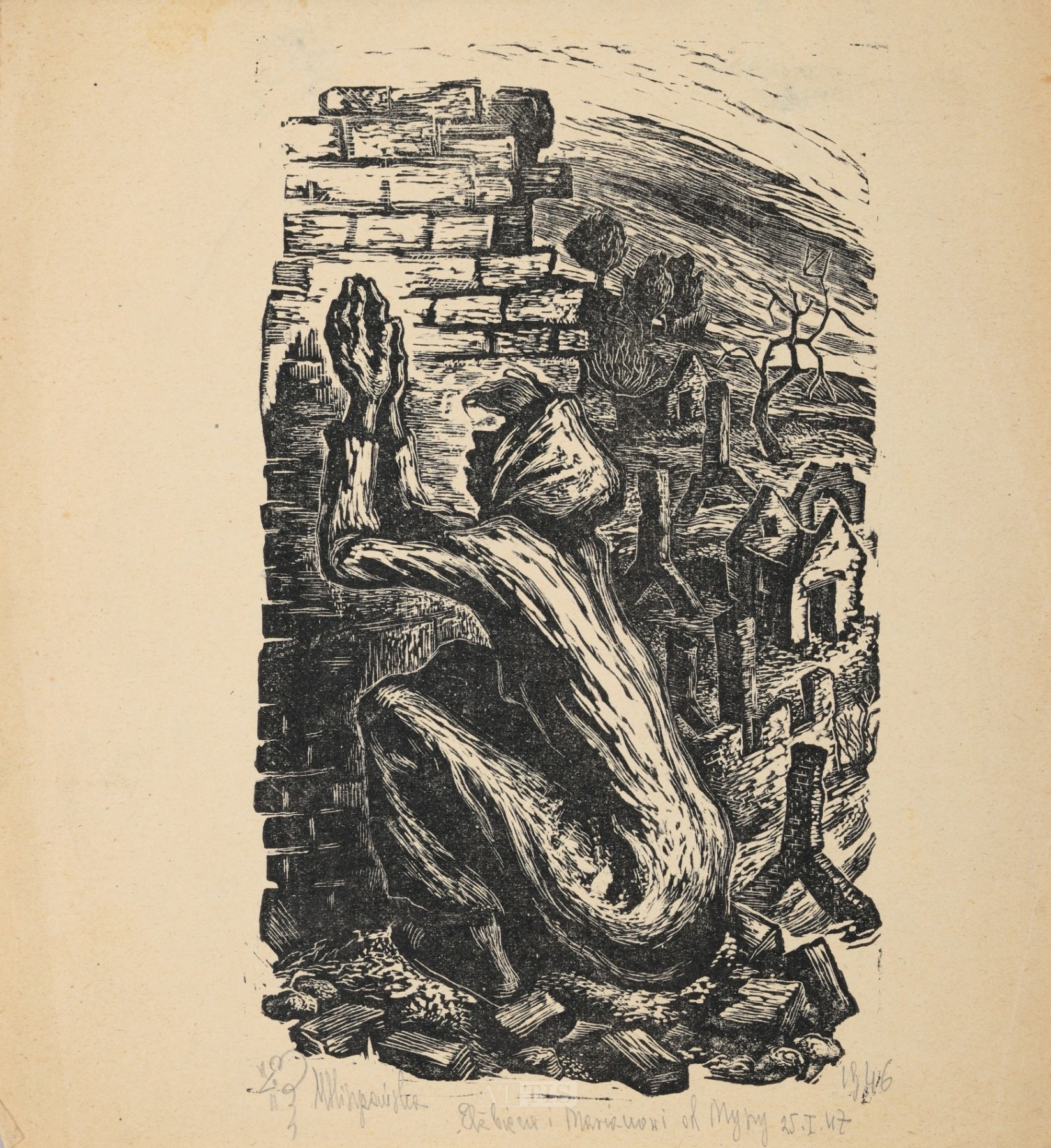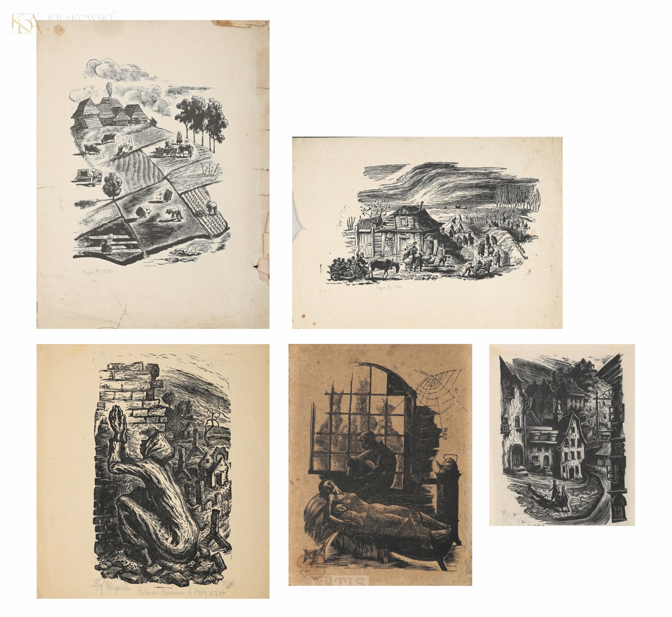 | 1. "Wieś góralska" (1938) Wymiary grafiki: 20,5 x 15,5 cm | Wymiary arkusza: 33 x 24,5 cm Sygnowany i datowany ołówkiem l.d.: "Mysza [rysunek myszy] 1938." Na krawędziach arkusza widoczne liczne zagięcia i naderwania. 2. "Tułaczka" (1940) Wymiary grafiki: 12,5 x 22,5 cm | Wymiary arkusza: 21,7 x 29,5 cm Sygnowany i datowany ołówkiem l.d.: "Mysza [rysunek myszy] 1940" Przy lewej krawędzi arkusza widoczne ubytki papieru. 3. "Modlitwa" (1946) Wymiary grafiki: 21 x 12 cm | Wymiary arkusza: 23 x 20,7 cm Sygnowany ołówkiem l.d.: "[rysunek myszy] MHiszpańska" Datowany ołówkiem p.d.: "1946" Śr.d. późniejsza dedykacja autorska z 1947 roku. 4. "Rodzina" Wymiary grafiki: 19 x 14,5 cm | Wymiary arkusza: 22,7 x 16,5 cm Widoczne zabrudzenie lica oraz ślad po zalaniu (l.d.). 5. "Miasto" (1946) Technika: bibuła, papier Wymiary grafiki: 15 x 11 cm | Wymiary arkusza: 16,5 x 13,2 cm Wymiary z passe-partout: 34 x 21,3 cm Sygnowany i datowany ołówkiem l.d.: "MHiszpańska | [rysunek myszy] 1946" | |