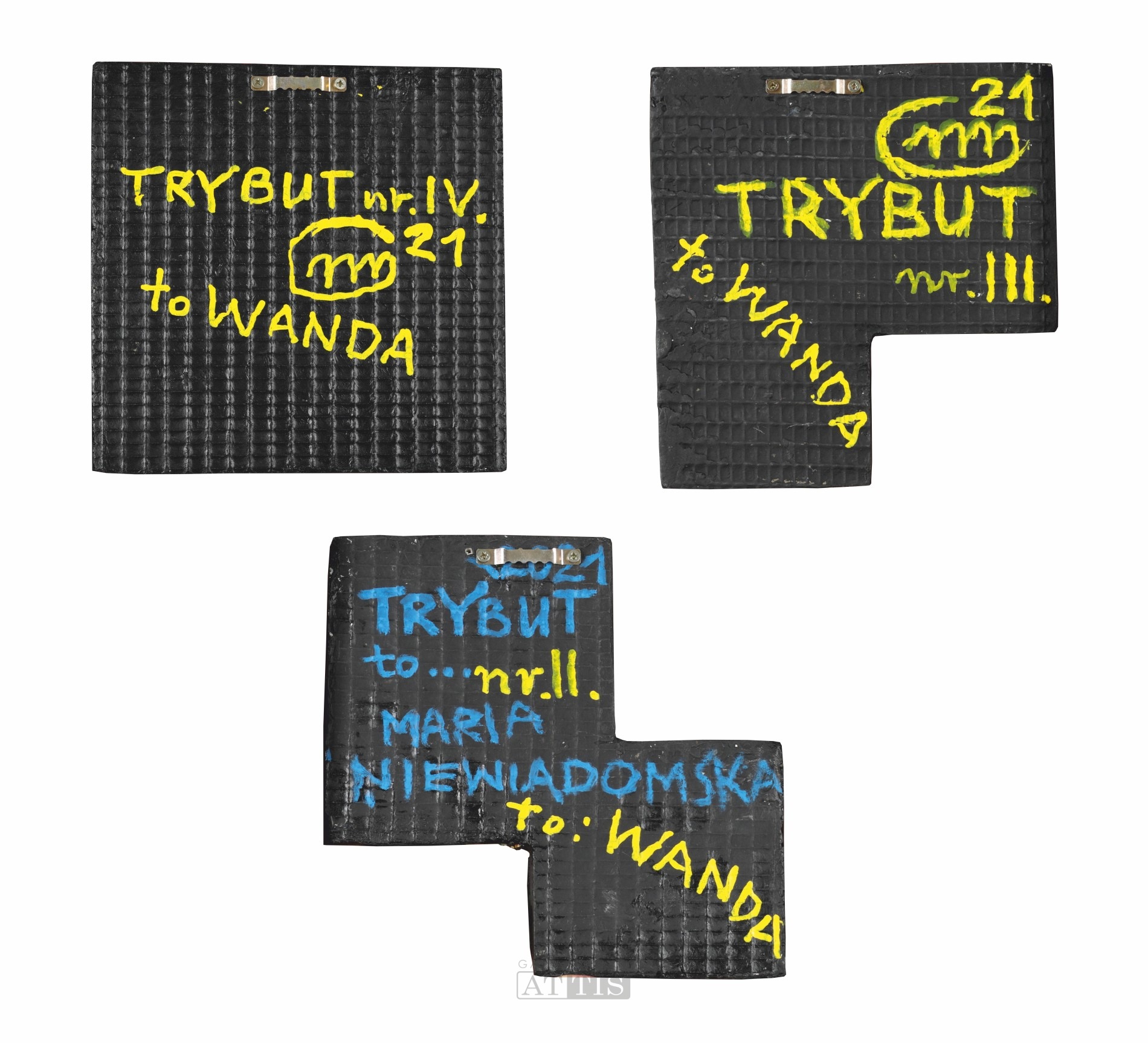 | Sygnowane i opisane kolejno na odwrocie: "2021 | TRYBUT to... nr. II. | MARIA | NIEWIADOMSKA | to: WANDA"; "mn21 | TRYBUT | nr. III. | to WANDA"; "TRYBUT nr.IV. | mn21 | to WANDA" | |