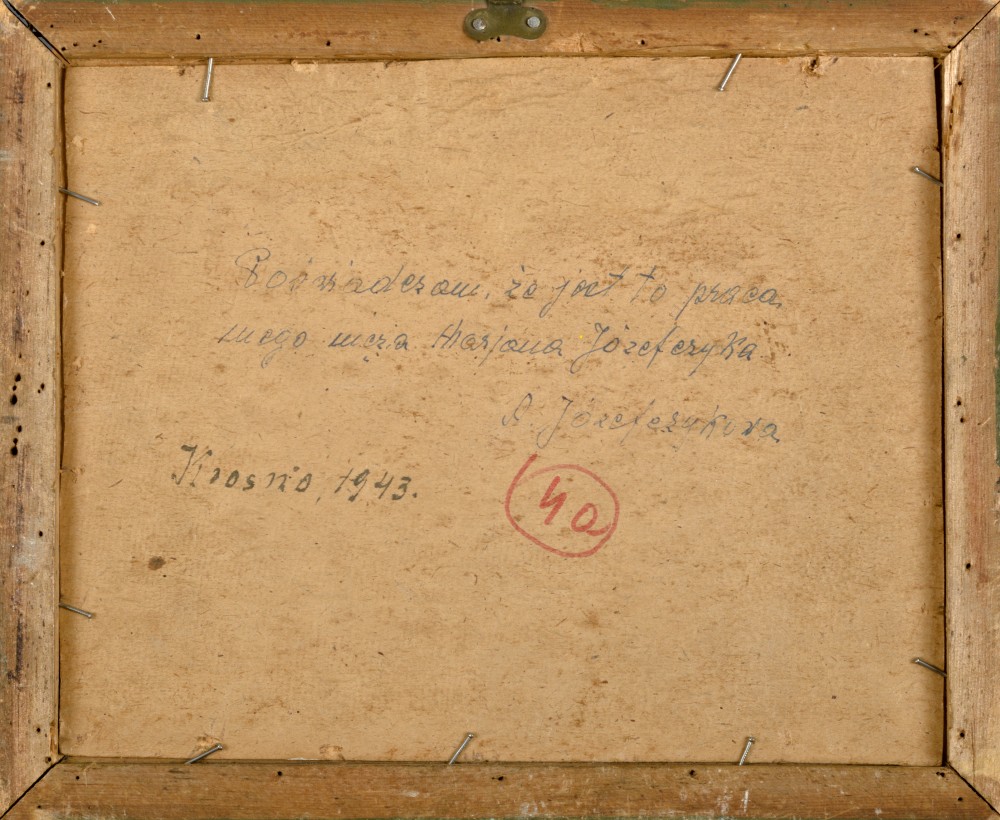 | Na odwrocie opis żony artysty potwierdzający autorstwo obrazu: "Poświadczam, że jest to praca | mego męża Marjana Józefczyka. | A. Józefczykowa | Krosno, 1943." Praca została sprzedana na VI AUKCJI DZIEŁ SZTUKI (14 XII 2020) Krakowskiego Domu Aukcyjnego [zobacz wyniki] | |