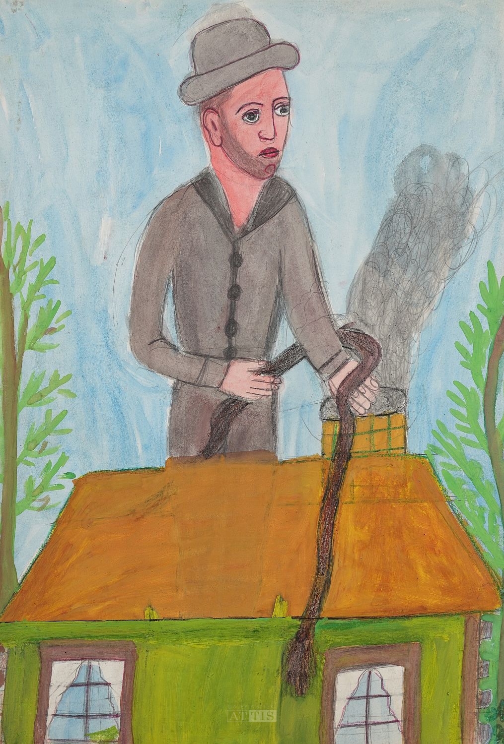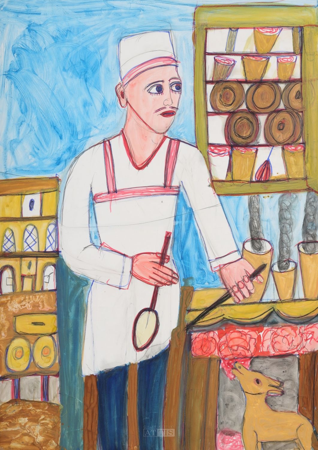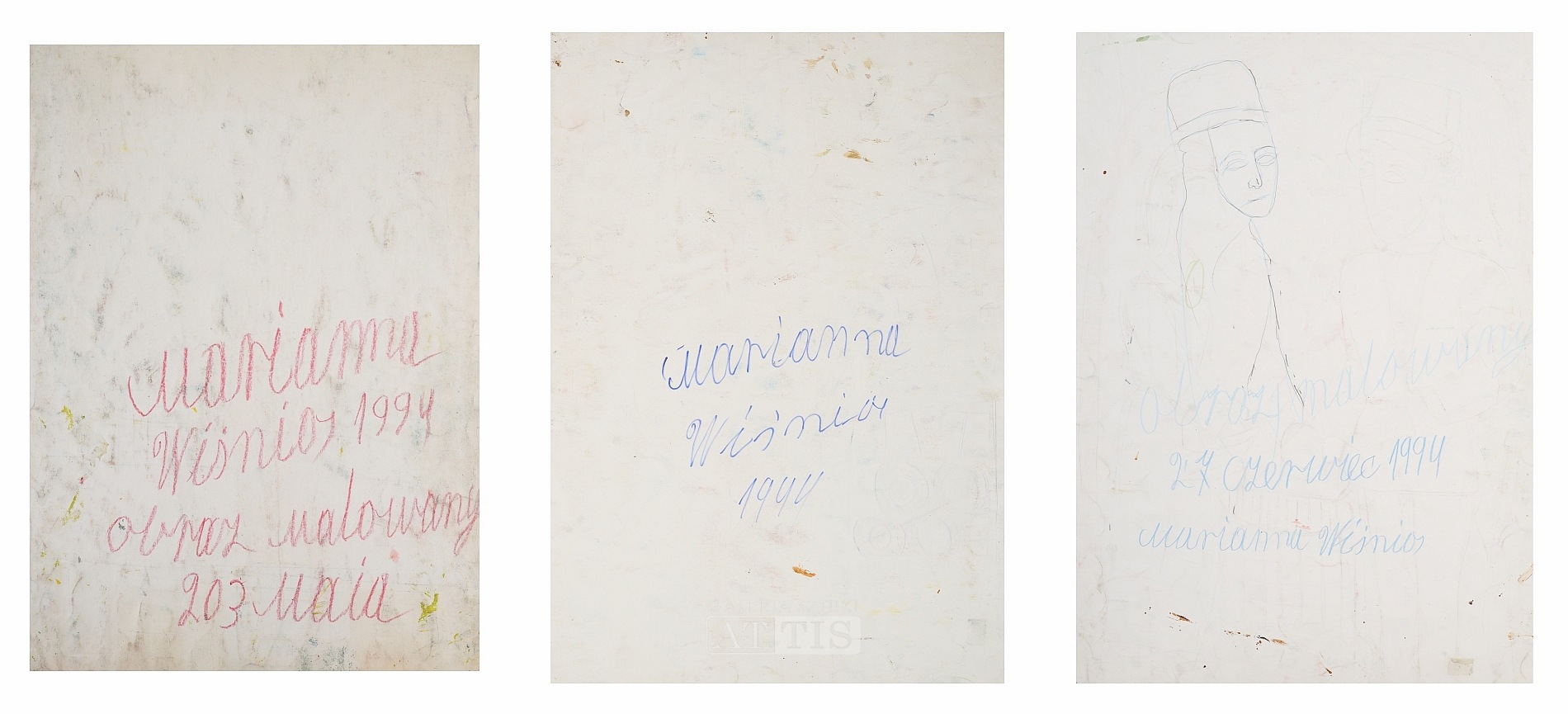 | 1. "Kominiarz" (1994) Technika: gwasz, akwarela, kredka, flamaster, ołówek, karton Wymiary: 50 x 70 cm Sygnowany p.d.: "M | W" Opisany na odwrocie: "Marianna | Wiśnios 1994 | obraz malowany 203 maia" 2. "Kucharz" (1994) Technika: akwarela, gwasz, flamaster, ołówek, karton Wymiary: 61 x 43 cm Sygnowany i datowany na odwrocie: "Marianna | Wiśnios | 1994" 3. "Przy studni" (1994) Technika: akwarela, kredka, flamaster, ołówek, karton Wymiary: 60,6 x 42,5 cm Sygnowany i opisany na odwrocie: "obraz malowany | 27 czerwiec 1994 | Marianna | Wiśnios" | |