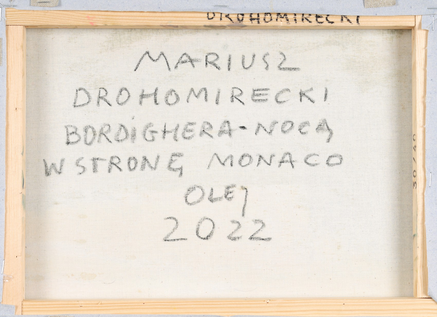 | Sygnowany p.d.: "DROHOMIRECKI" Opisany na odwrocie: "MARIUSZ | DROHOMIRECKI | BORDIGHERA - NOCĄ | W STRONĘ MONACO | OLEJ | 2022" Opisany na blejtramie: "DROHOMIRECKI" | |