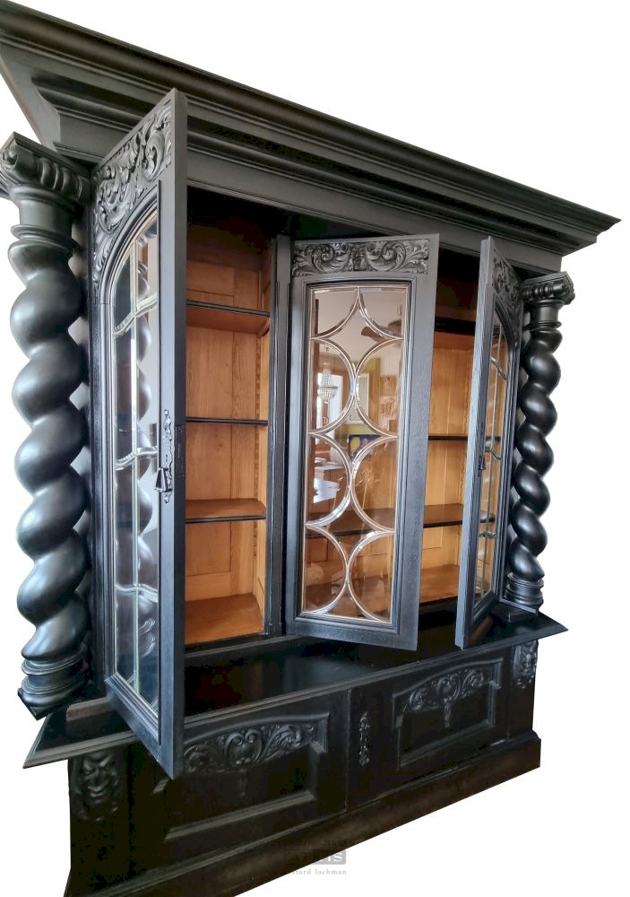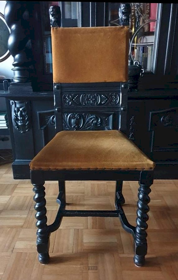 | Komplet mebli gdańskich z ornamentalnym rzeźbieniem w formie maszkaronów oraz lwich łbów, na który składa się biblioteka oraz stół z sześcioma krzesłami. Wymiary biblioteki: 230 x 160 x 52 cm Wymiary stołu: 114 cm (długość), 72 cm (szerokość) Istnieje możliwość obejrzenia mebli w Krakowie po wcześniejszym umówieniu terminu [KONTAKT] | |