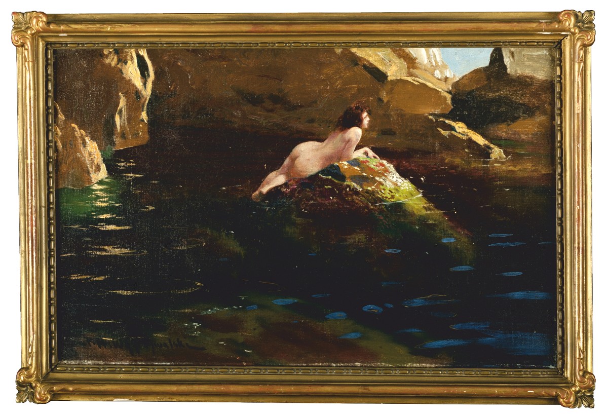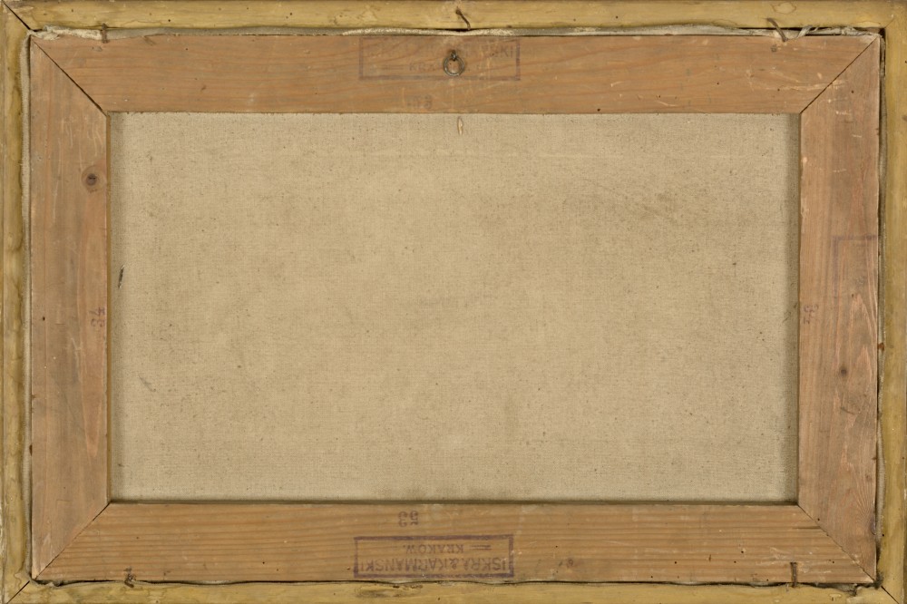 | Sygnowany l.d.: "F. M. Wygrzywalski" OPIS PRACY: Jednym z tematów podejmowanych w sztuce przez Feliksa Michała Wygrzywalskiego był akt kobiecy. Często również artysta umiejscawiał obrazowane przez siebie sceny w nadmorskiej scenografii. Oba te elementy scalone zostały w obrazie “Nimfa na skale” przedstawiającym widoczną od tyłu tytułową boginię w zmysłowej pozie, odpoczywającą na skale blisko morskiego wybrzeża. Praca została sprzedana na V AUKCJI DZIEŁ SZTUKI (29 X 2020) w Krakowskim Domu Aukcyjnym [zobacz katalog] | |