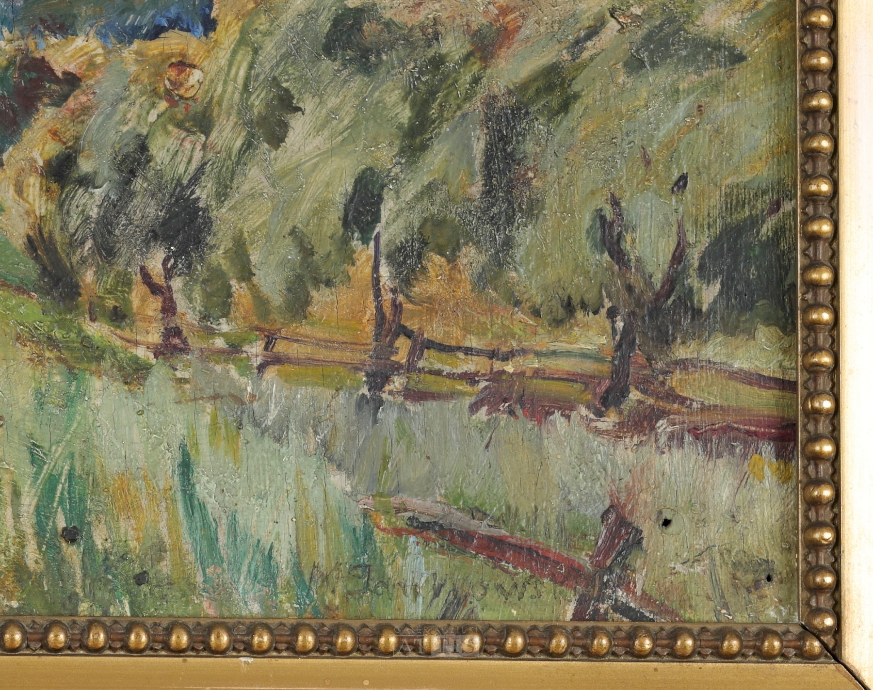 | Sygnowany p.d.: "M. Janikowski" Widoczne zabrudzenie warstwy malarskiej oraz lekkie wygięcie i lokalne spękania podłoża. Przy krawędziach pracy (l.d., śr.d., p.g., p.d.) widoczne niewielkie otwory (po szpilkach?). PROWENIENCJA: - kolekcja rodziny artysty. | |