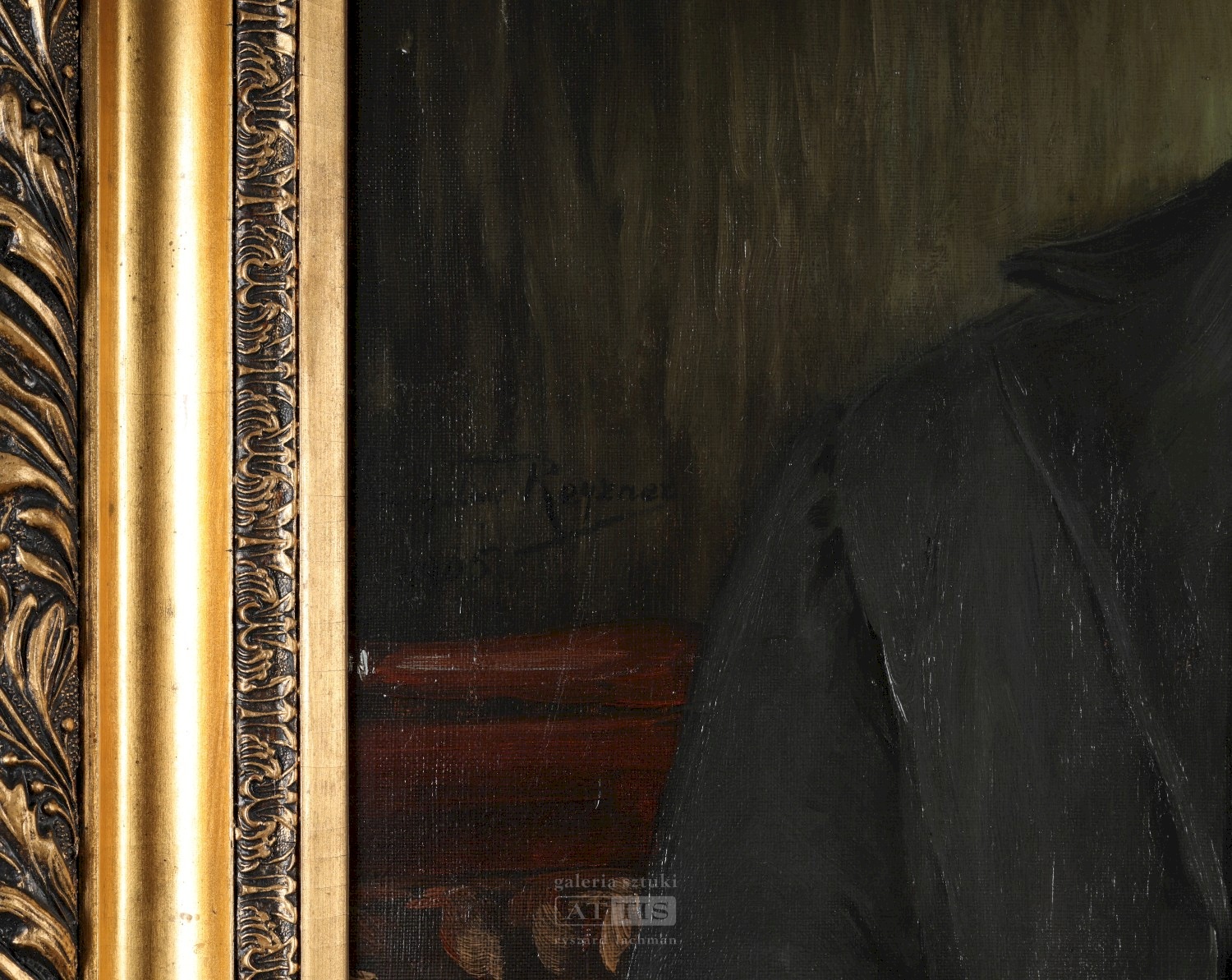 | Sygnowany i datowany l.śr.: "Mieczysław Reyzner | 1905" Widoczne jasne zarysowanie malatury (l.g.). Łatka na odwrocie płótna. | |
