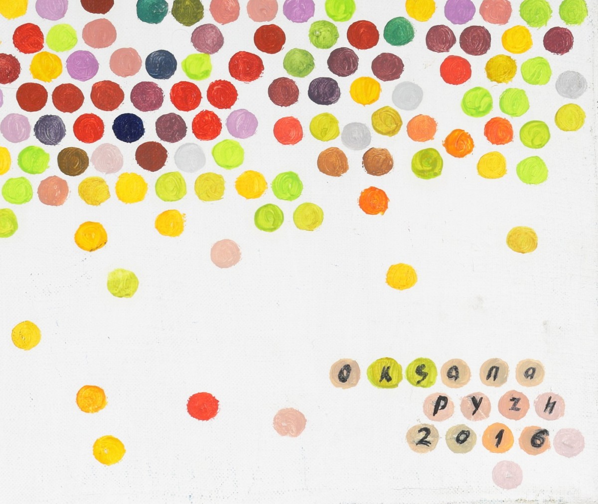Cechą charakterystyczną płócien Oksany Pyzh są kropki, z których malarka tworzy dekoracyjne kompozycje lub tła przedstawień.