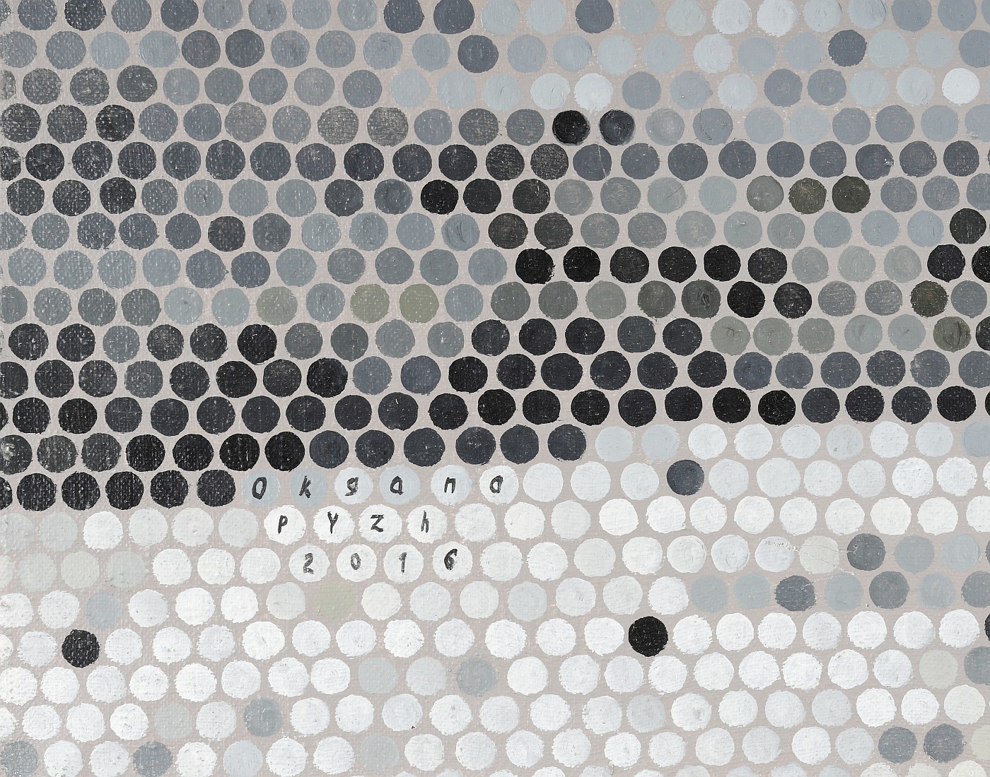 Cechą charakterystyczną płócien Oksany Pyzh są kropki, z których malarka tworzy dekoracyjne kompozycje lub tła przedstawień.