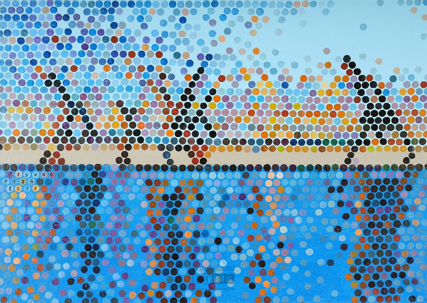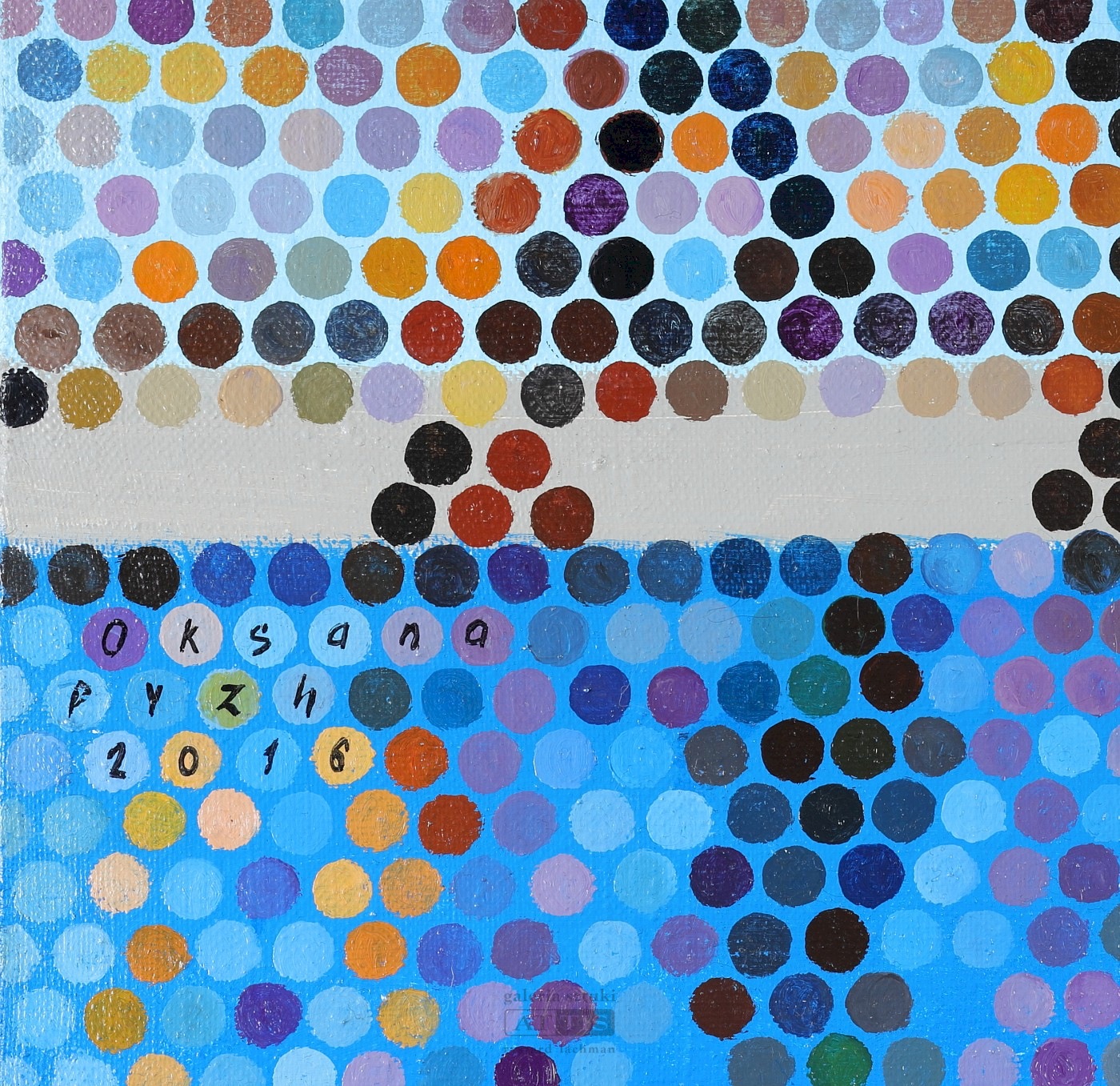 Cechą charakterystyczną płócien Oksany Pyzh są kropki, z których malarka tworzy dekoracyjne kompozycje lub tła przedstawień.