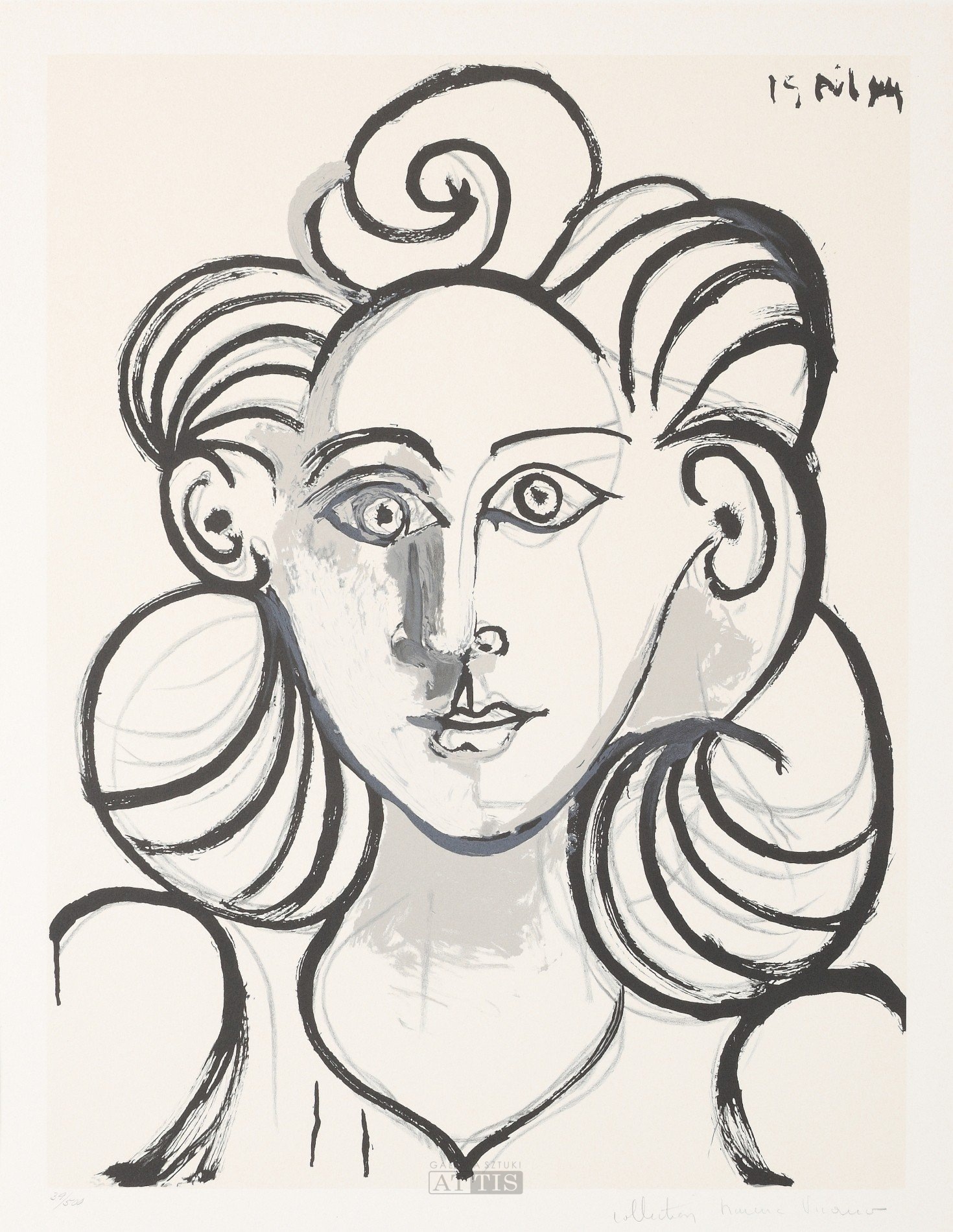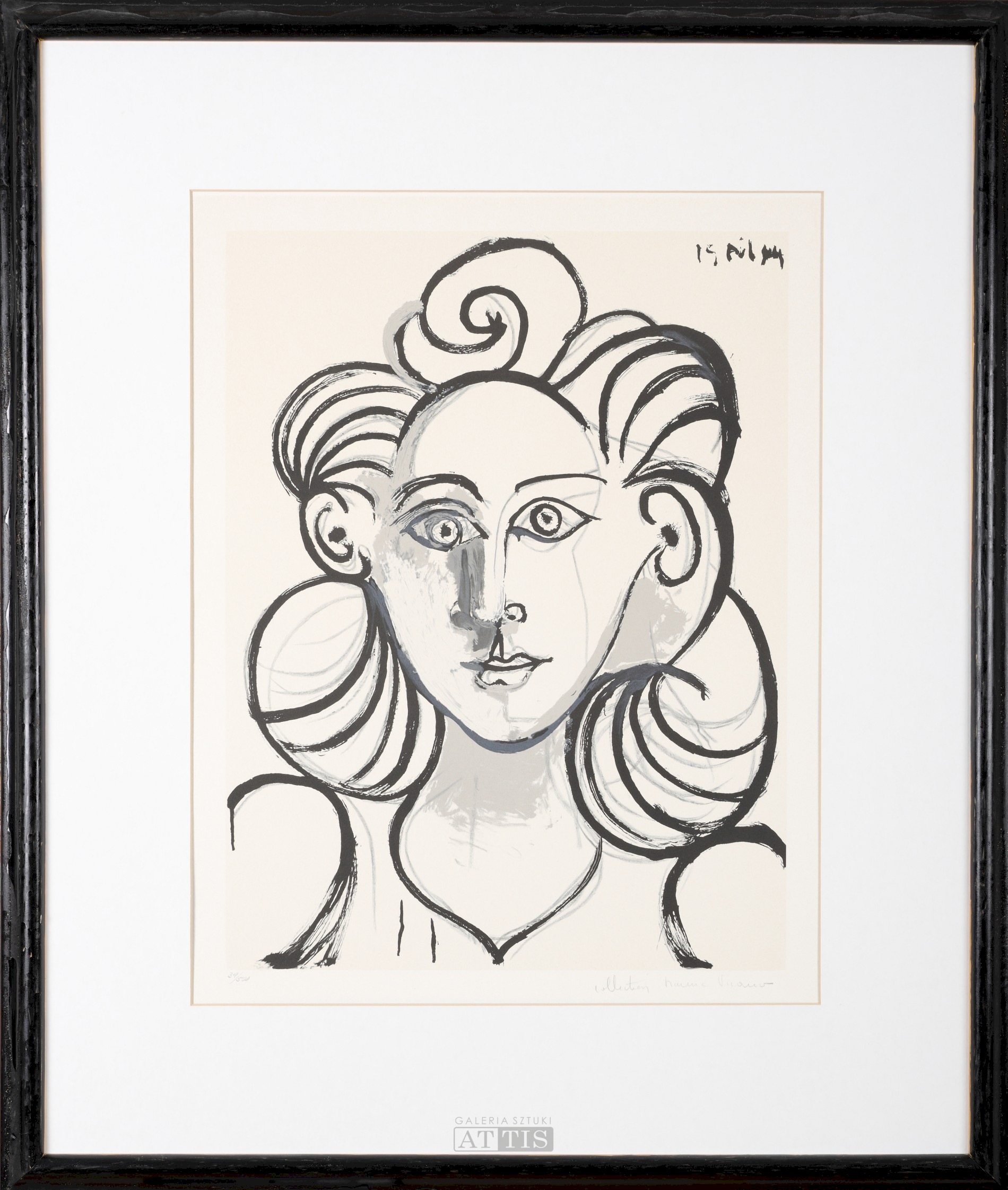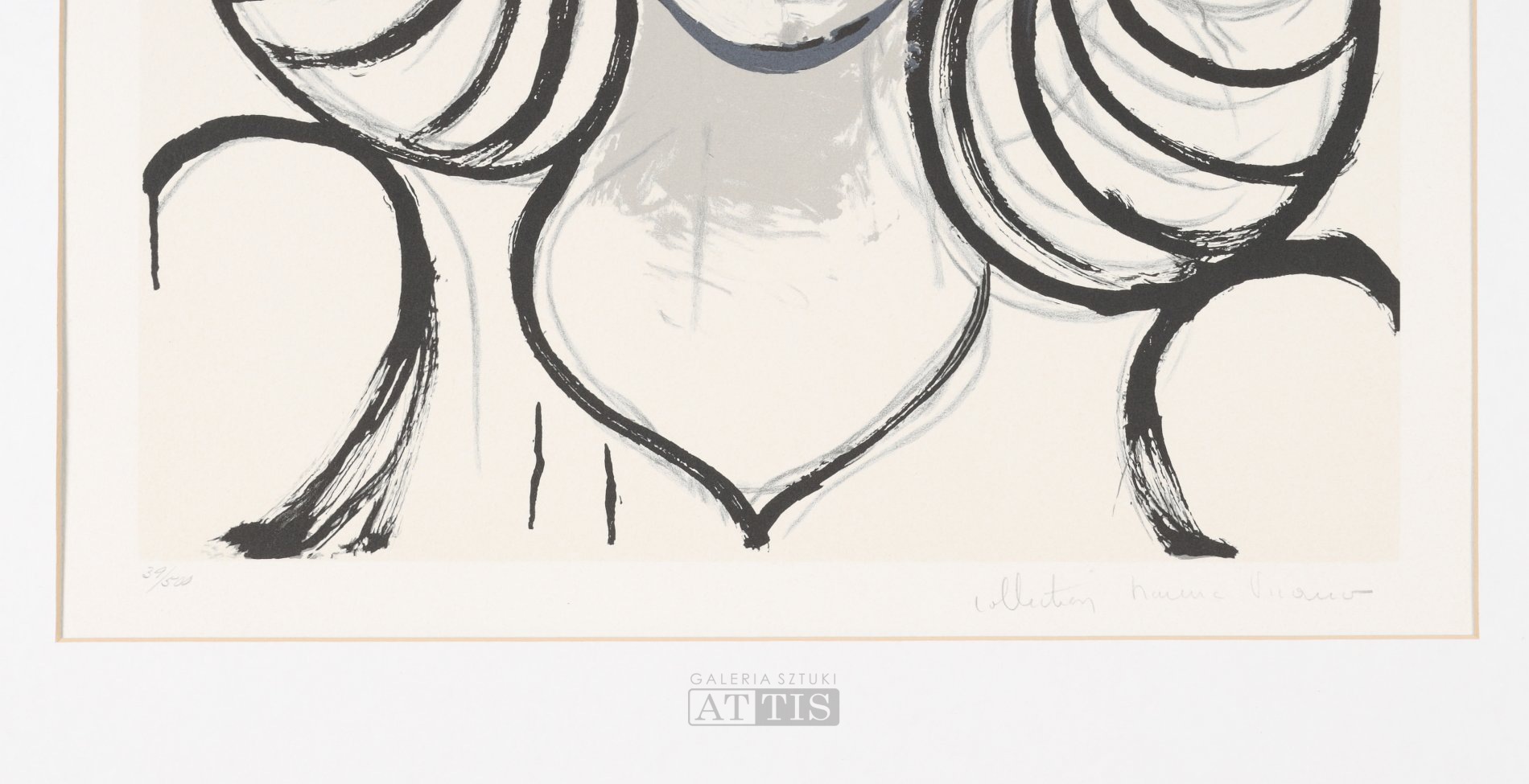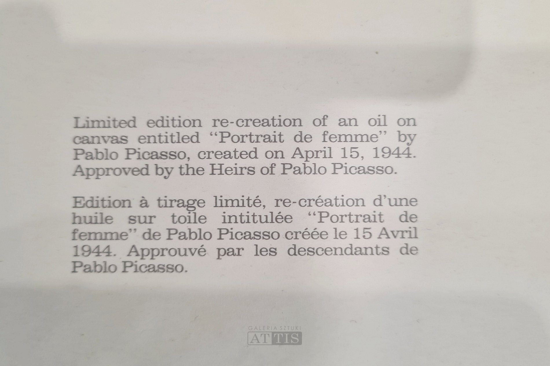 | Opisany ołówkiem p.d. przez wnuczkę artysty, Marinę Picasso: "collection homme Picasso" Opisany ołówkiem l.d.: "39/500" Sucha pieczęć "A limited edition after a work by Pablo Picasso" (p.d.). Sucha pieczęć "l.m.s" (Laurent Marcel Salinas) (l.d.). Na odwrocie drukowany dwujęzyczny zapis o historii powstania grafiki i zatwierdzeniu edycji przez spadkobierców Pabla Picassa ("Approved by the Heirs of Pablo Picasso/Approuvé par les descendants de Pablo Picasso"). Na odwrocie pieczątka "© DR. SAMIR R NEIMAT 1979". Litografia powstała po śmierci artysty, na podstawie jego olejnego obrazu pt. "Portrait de femme" z kwietnia 1944 roku. | |