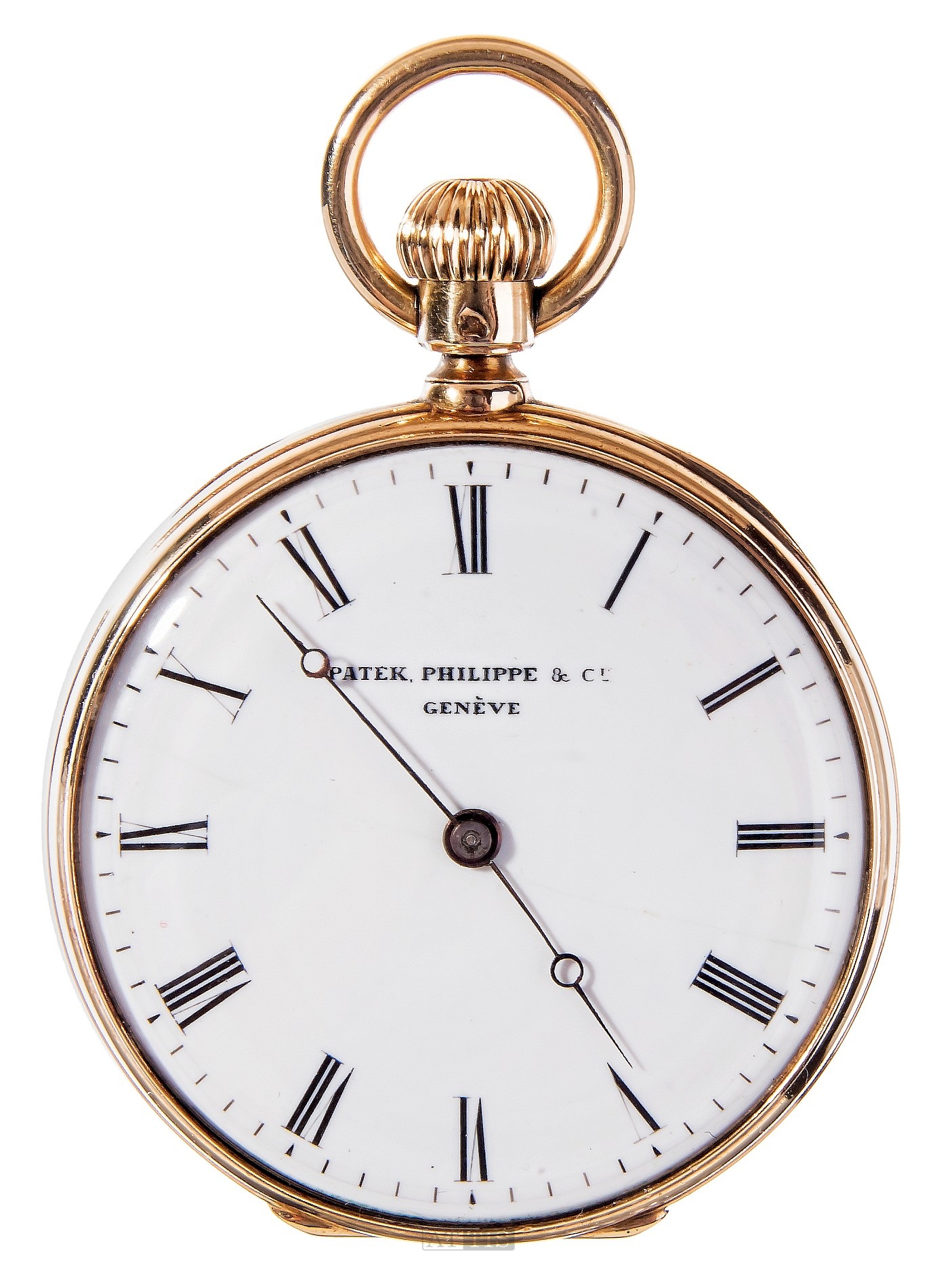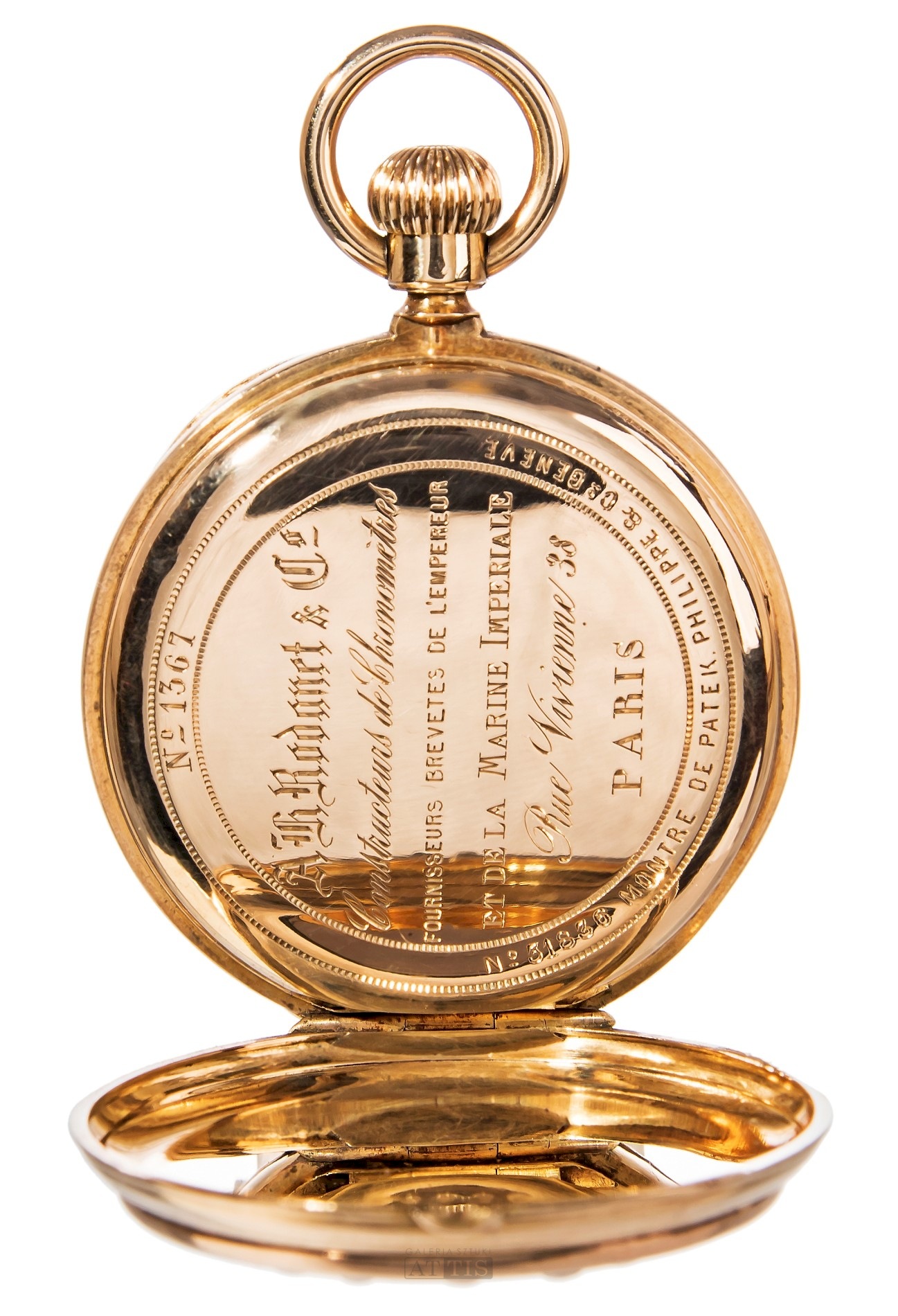 mechanizm: numer 31836 (numer pod tarczą), z wychwytem cylindrowym koperta: odkryta, numer 31836, złoto 18k dekiel wewnętrzny: numer 31836 i 1367; sygnowany tarcza: emaliowana, z sygnaturą Patek Philippe & Cie naniesioną metodą tampodruku szkło: mineralne Stan zachowania: tarcza z mikropęknięciem | |