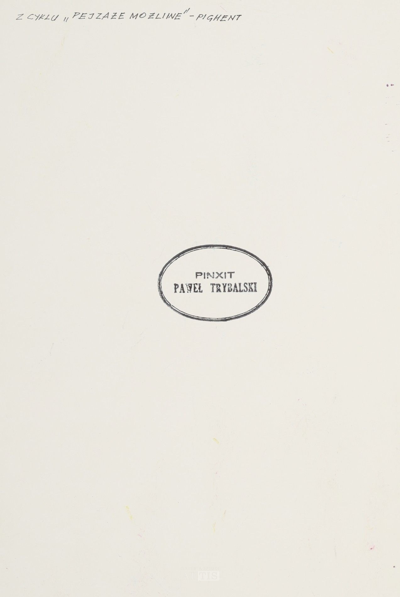| Na odwrocie pieczątka autorska Pawła Trybalskiego "PINXIT | PAWEŁ TRYBALSKI" Opisany na odwrocie: "Z CYKLU PEJZAŻE MOŻLIWE - PIGMENT" | |