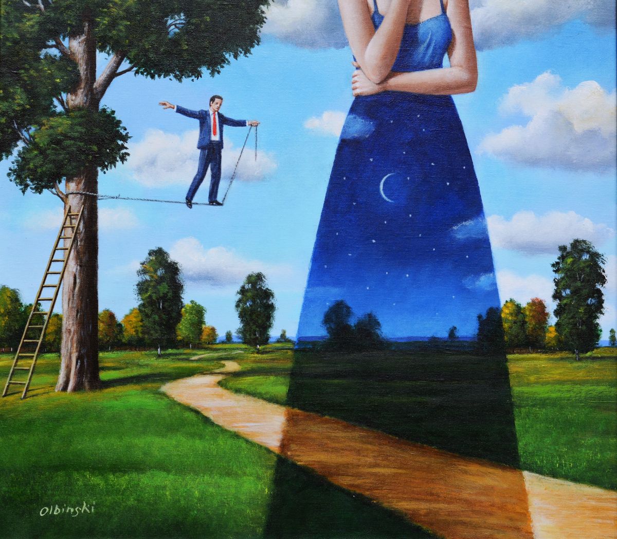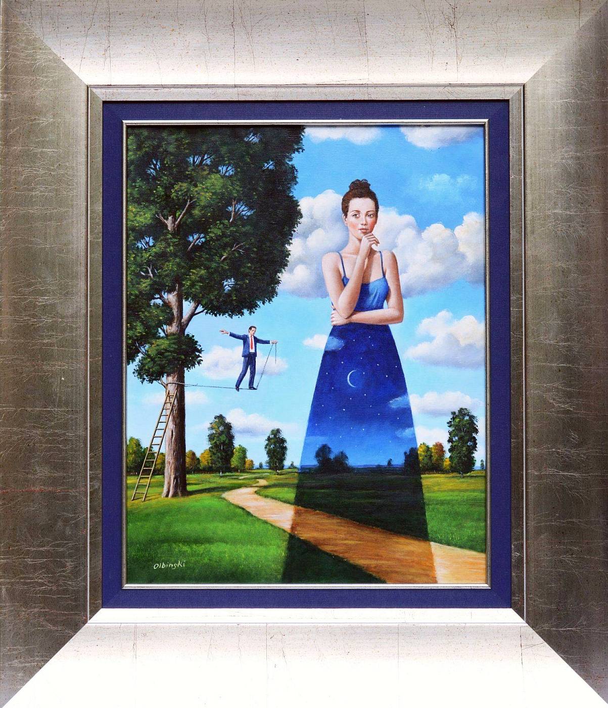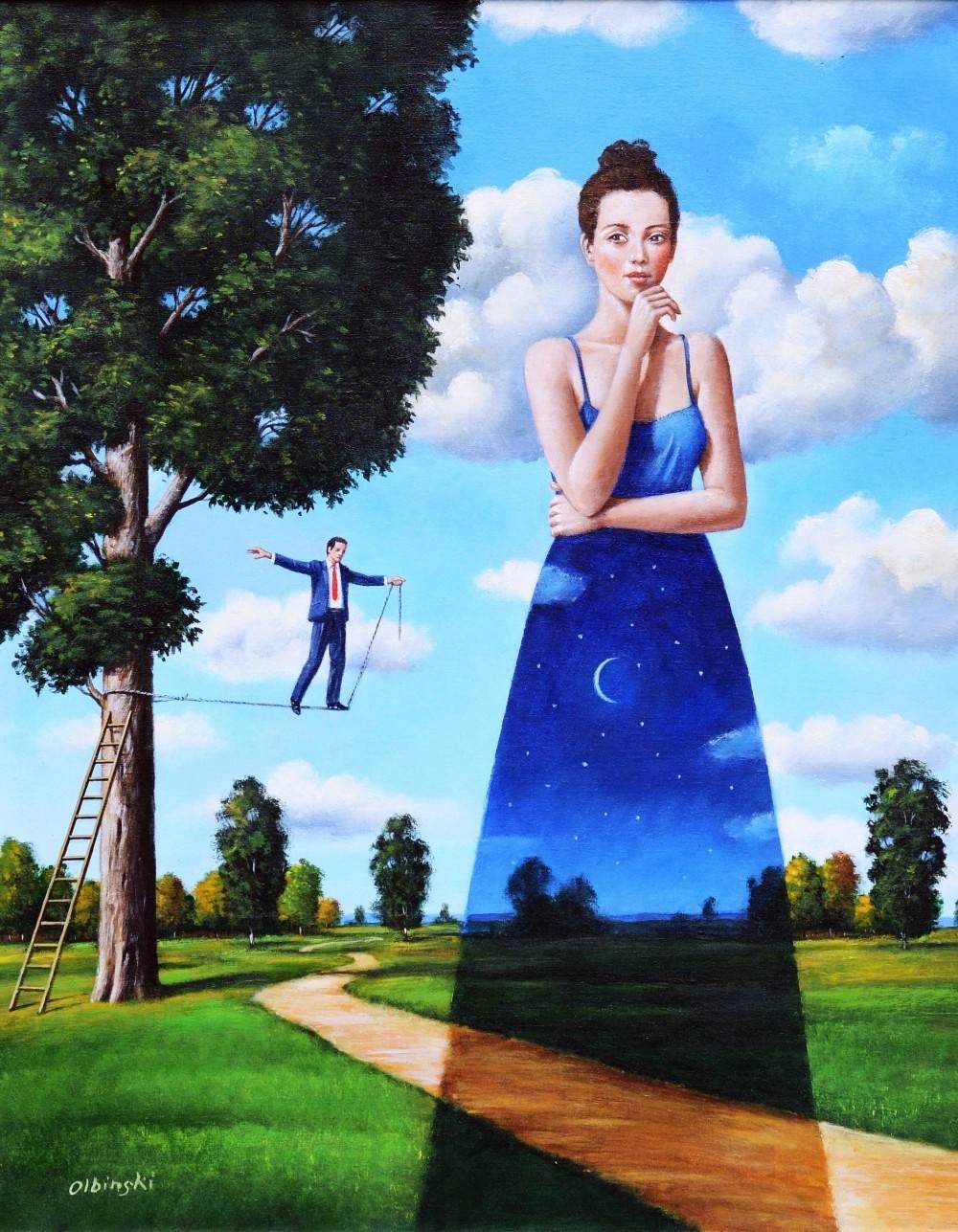 Patrząc na wybierane przez artystę tematy oraz wzorce piękna powielane w jego pracach można odnieść wrażenie, że z kulturą renesansu łączy go znacznie więcej niż humanistyczna wszechstronność zainteresowań. Jego sztuka jest przesycona tym samym zachwytem, z jakim malarze i rzeźbiarze renesansu przedstawiali otaczający świat przyrody i ludzkie ciało. Wykreowane przez Olbińskiego uniwersum budzi także skojarzenia z malarstwem surrealistów, szczególnie zaś z twórczością Renée Magritte’a. Twórczość obydwu artystów łączą cechy takie jak poetycka aura, poczucie humoru oraz zaskakujące zestawienia przedmiotów. Jednak Olbiński, w przeciwieństwie do belgijskiego malarza, nie przytłacza widza atmosferą mrocznej tajemniczości i niepokoju. Nadaje swoim dziełom pogodny klimat. Oferuje odbiorcom ucieczkę od codziennego życia w alternatywną rzeczywistość. W⠀tym idyllicznym świecie nawet sytuacje pełne trudnych emocji przedstawione są lekko ale z morałem.