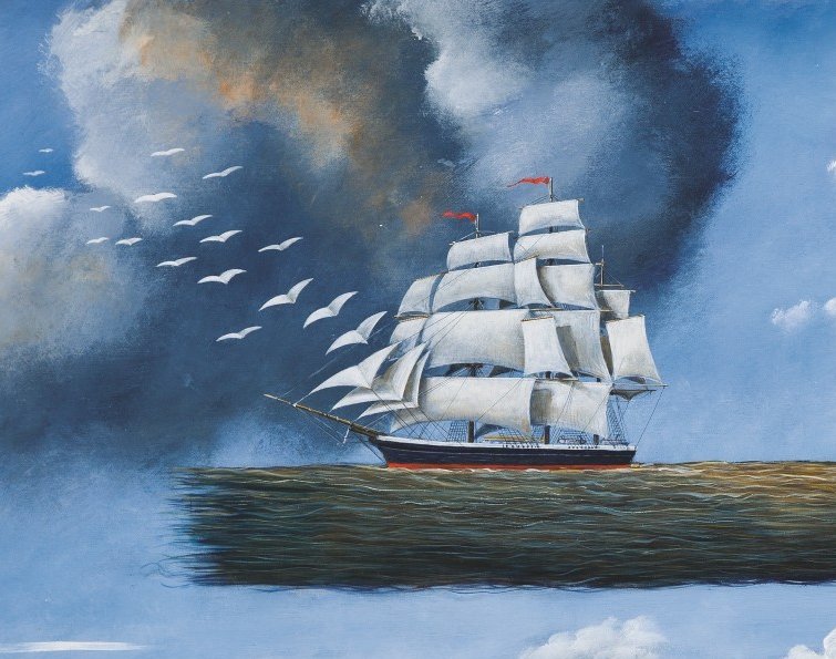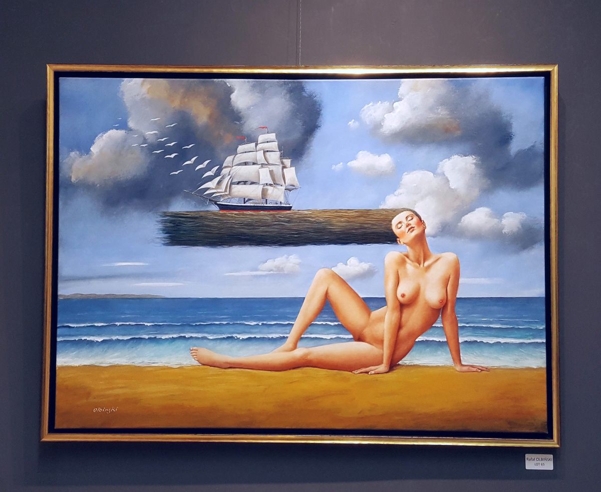 | sygn. l.d.: „Olbiński” OPIS PRACY: Wielkoformatowe płótno Rafała Olbińskiego powtarza tytuł utworu chórowego z opery "Nabucco" Giuseppe Verdiego, nie stanowi jednak interpretacji tej poważnej pieśni o tęsknocie. Artysta inspirację zaczerpnął z samej muzyki, w tekście dzieła ograniczając się natomiast do pierwszego wersu. Surrealistyczny obraz ukazuje akt kobiecy umiejscowiony w nadmorskim pejzażu. Po rozwianych, powtarzających horyzontalną dynamikę morskich fal włosach rozmarzonej kobiety, niczym tytułowa myśl, przepływa statek, którego żagle stopniowo zamieniają się w lecące ku niebu białe ptaki. Kompozycja pracy jest doskonale wyważona, a realistyczny sposób malowania i żywa kolorystyka pozwalają wczuć się w nastrój zamyślenia i atmosferę nadmorskiego powiewu wiatru. PRACA ZOSTAŁA SPRZEDANA NA III Aukcji Dzieł Sztuki w Krakowskim Domu Aukcyjnym (26 maja 2020) [zobacz więcej] | |