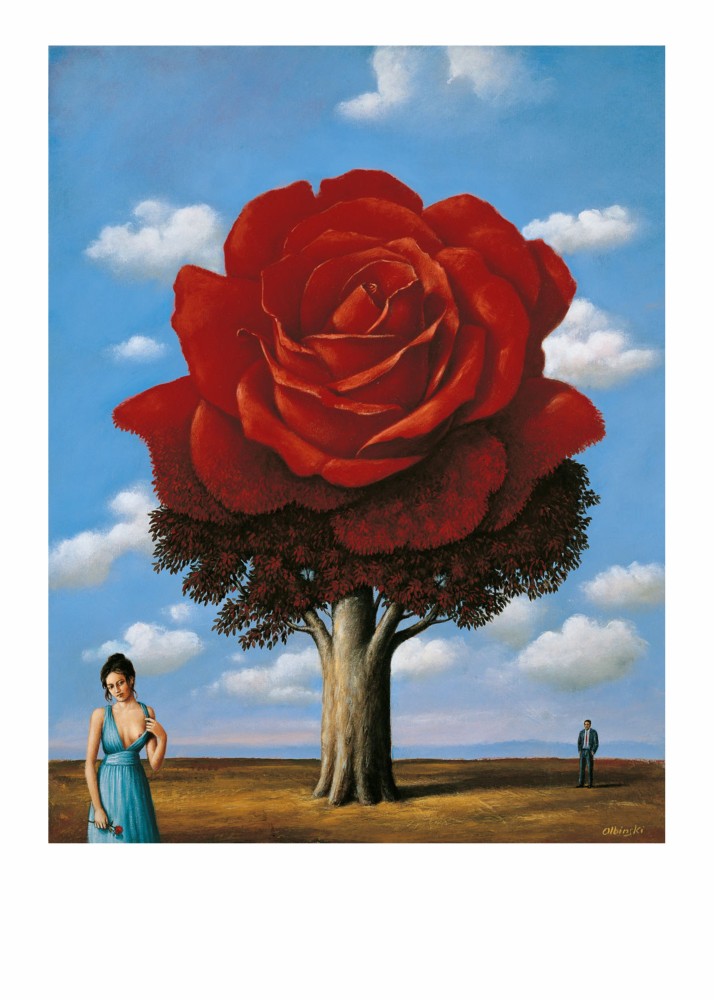 Patrząc na wybierane przez artystę tematy oraz wzorce piękna powielane w jego pracach można odnieść wrażenie, że z kulturą renesansu łączy go znacznie więcej niż humanistyczna wszechstronność zainteresowań. Jego sztuka jest przesycona tym samym zachwytem, z jakim malarze i rzeźbiarze renesansu przedstawiali otaczający świat przyrody i ludzkie ciało. Wykreowane przez Olbińskiego uniwersum budzi także skojarzenia z malarstwem surrealistów, szczególnie zaś z twórczością Renée Magritte’a. Twórczość obydwu artystów łączą cechy takie jak poetycka aura, poczucie humoru oraz zaskakujące zestawienia przedmiotów. Jednak Olbiński, w przeciwieństwie do belgijskiego malarza, nie przytłacza widza atmosferą mrocznej tajemniczości i niepokoju. Nadaje swoim dziełom pogodny klimat. Oferuje odbiorcom ucieczkę od codziennego życia w alternatywną rzeczywistość. W⠀tym idyllicznym świecie nawet sytuacje pełne trudnych emocji przedstawione są lekko ale z morałem.