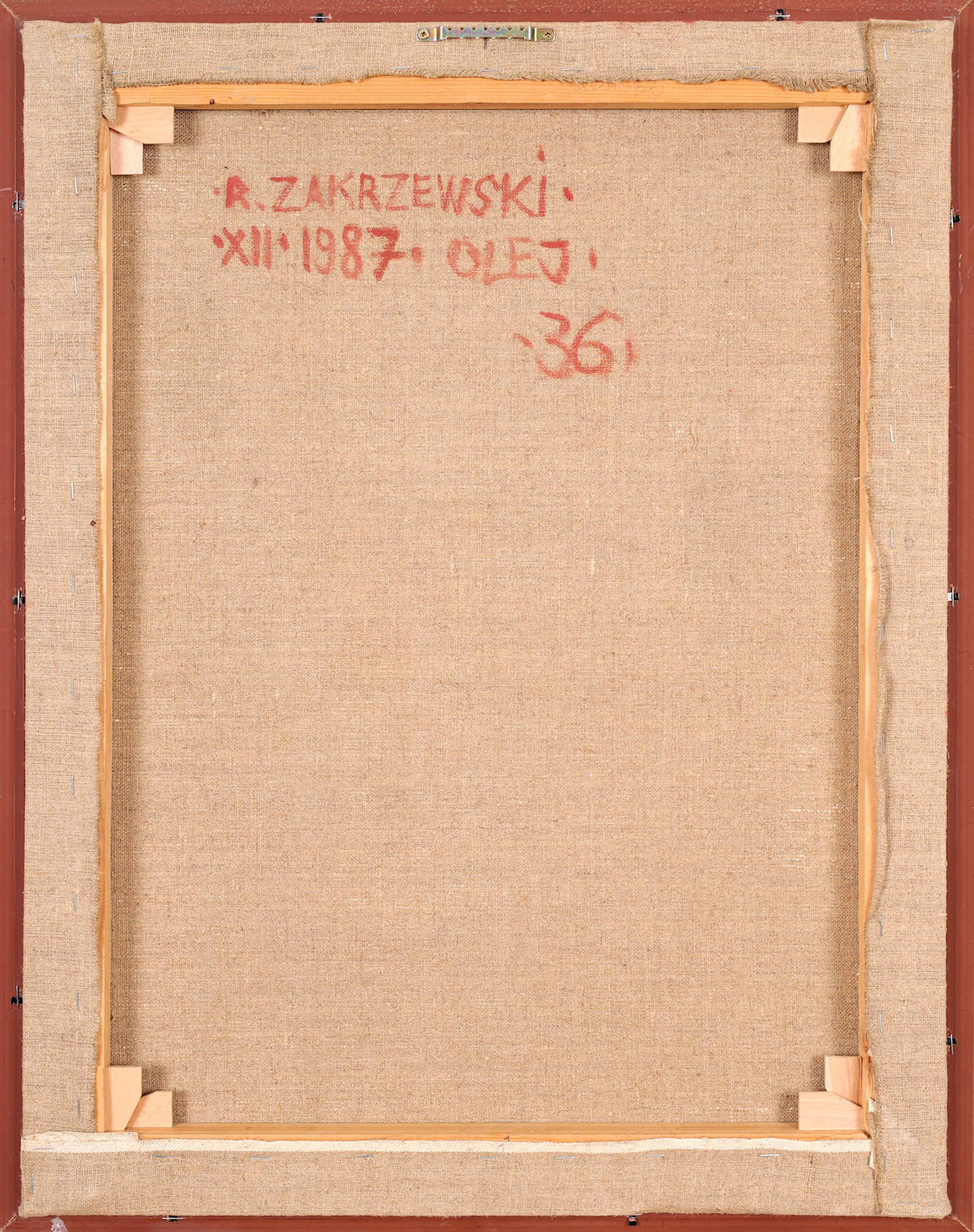 | Sygnowany i opisany na odwrocie: "‧ R ‧ ZAKRZEWSKI ‧ | ‧ XII ‧ 1987 ‧ OLEJ ‧ | ‧ 36 ‧"
