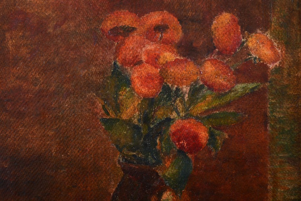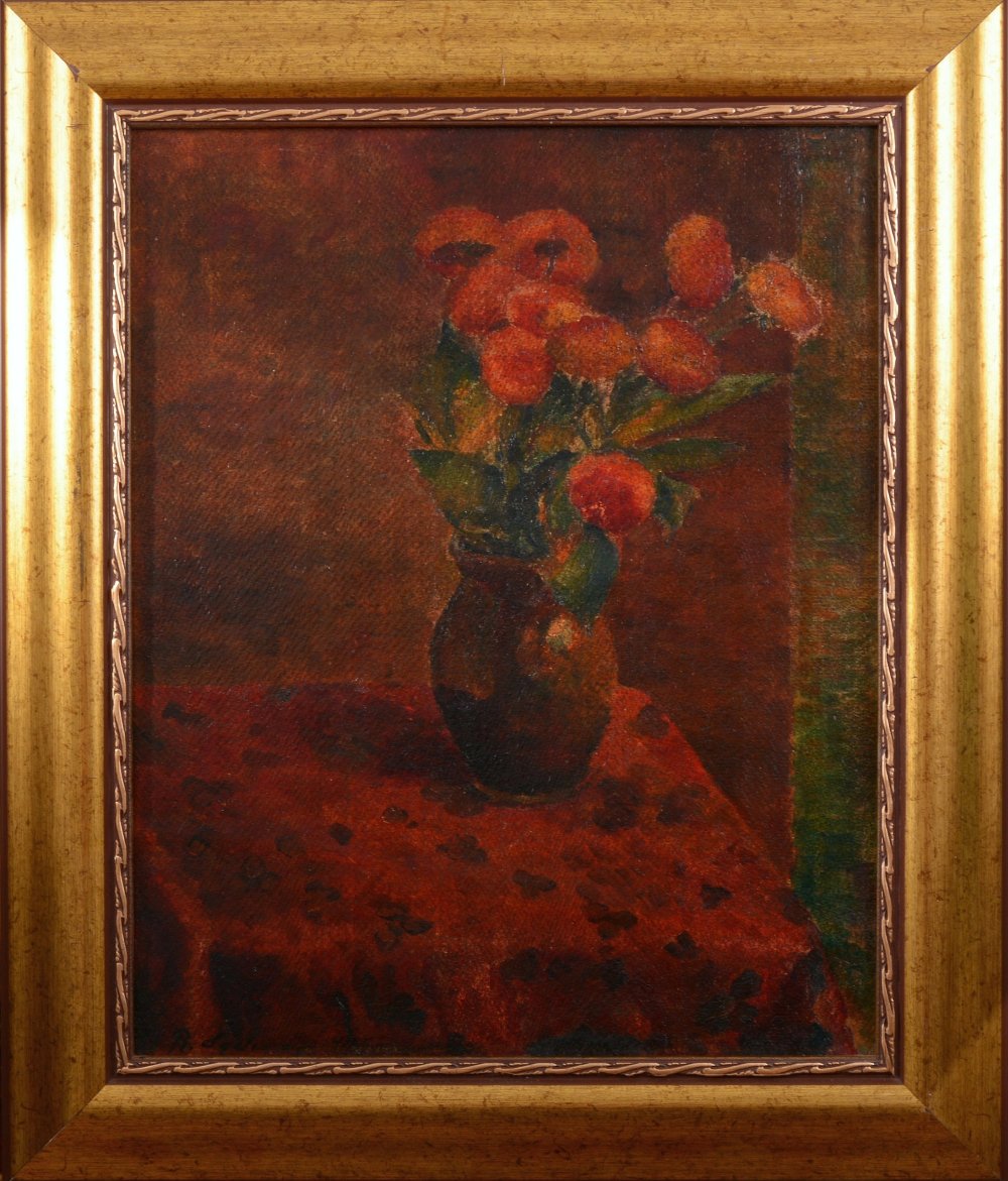Zupełnie innym klimatem charakteryzują się jego martwe natury, w których występują wykańczane subtelnie przedmioty o delikatnie zatartych granicach. Przykładem tego rodzaju twórczości Ryszarda Ledwosa jest kompozycja „Kwiaty”. Artysta ukazał położony na przykrytym wzorzystym bordowym obrusem stoliku brązowawy wazon z bukietem szkarłatno-bursztynowych kwiatów. Tło obrazu stanowi jednolita, płaska ciemnoczerwono-brązowa plama, zamknięta od lewej strony pasem ciemnej zieleni korelującej z barwą liści bukietu. Dzieło utrzymane jest w przygaszonej, wąskiej, harmonijnej gamie barwnej, jego wyraz skupia się właśnie na kolorze. Malowane jest w sposób niezwykle subtelny, cienką warstwą farby, z wykorzystaniem rytmicznej struktury podobrazia (płyty).