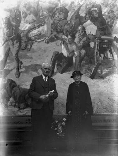 Stanisław Batowski Kaczor z żoną Ireną na tle swojego obrazu "Polskie Termopile"