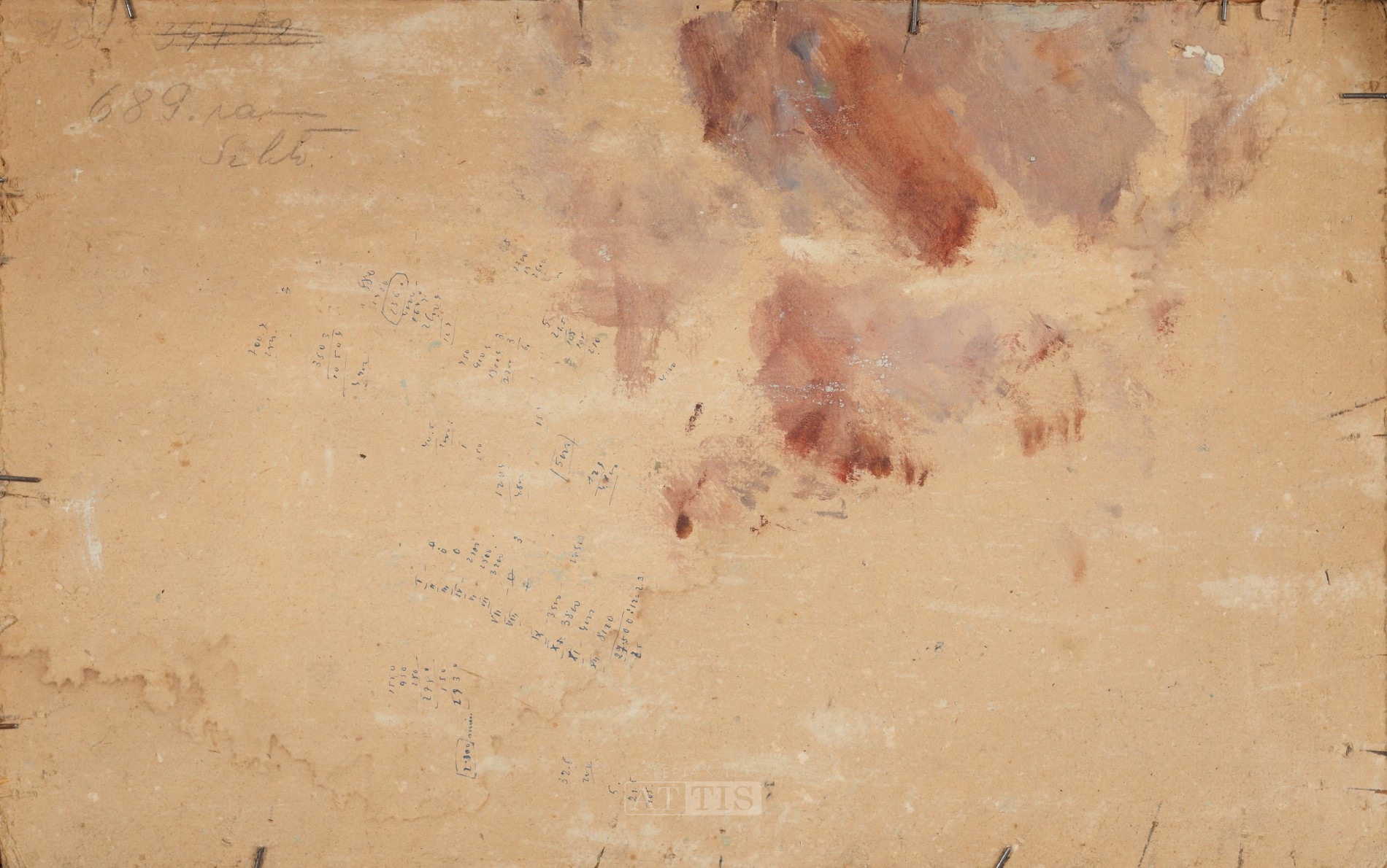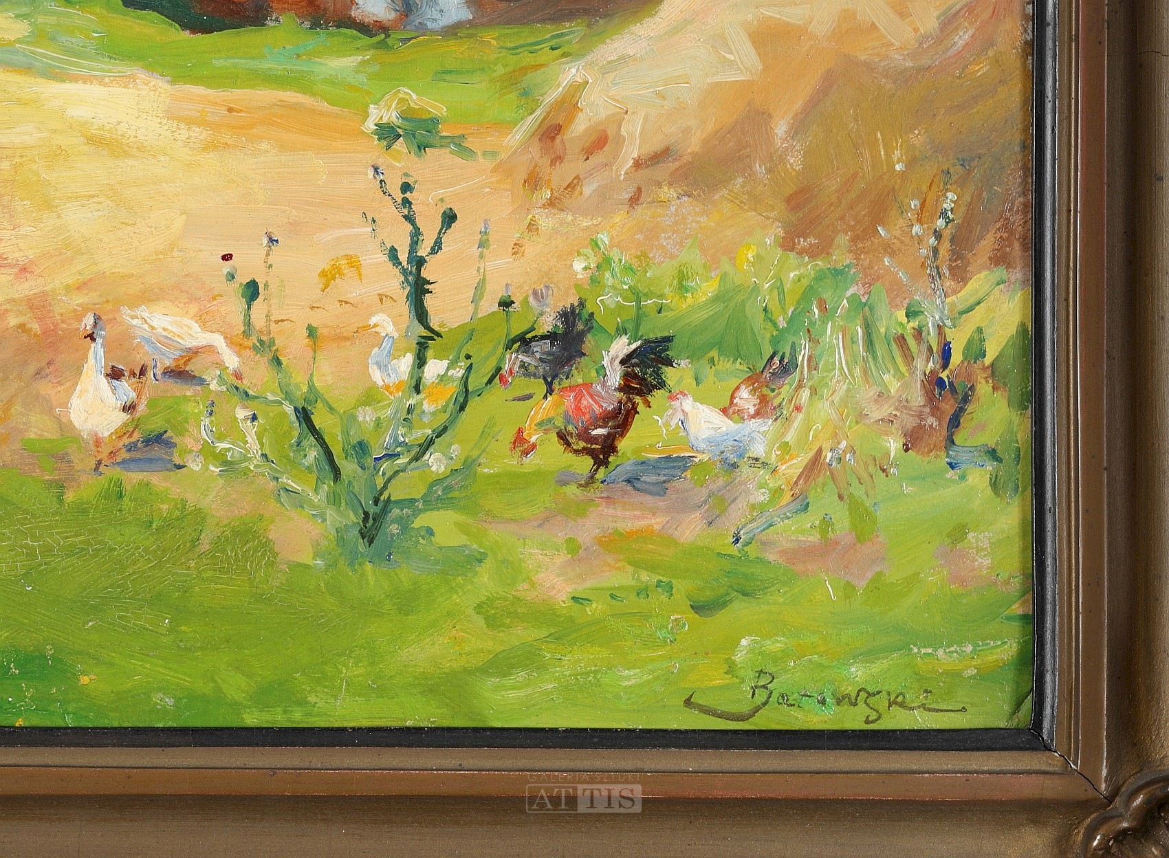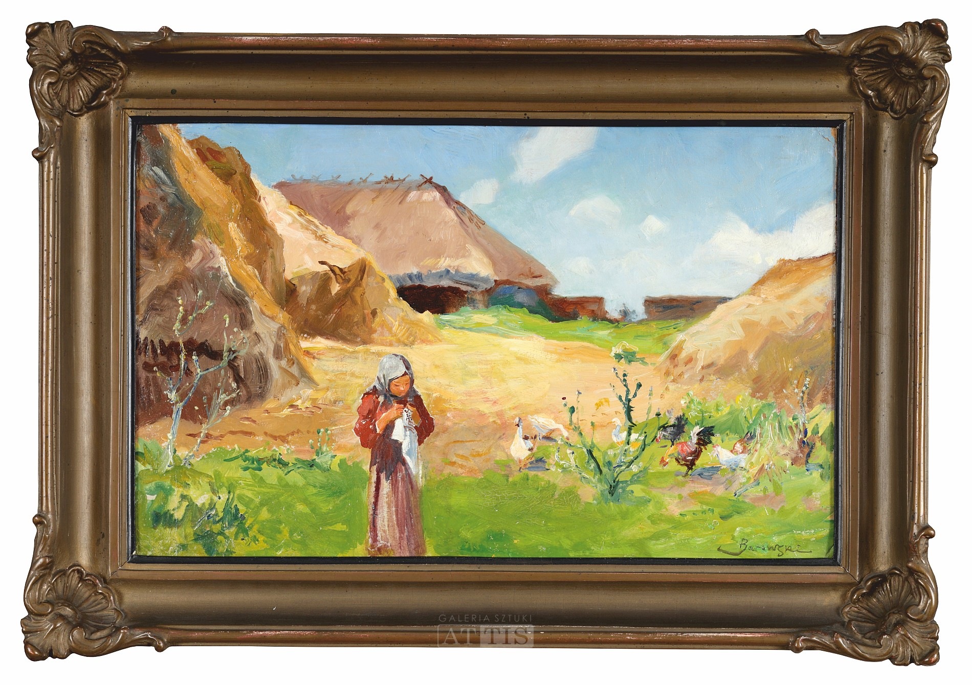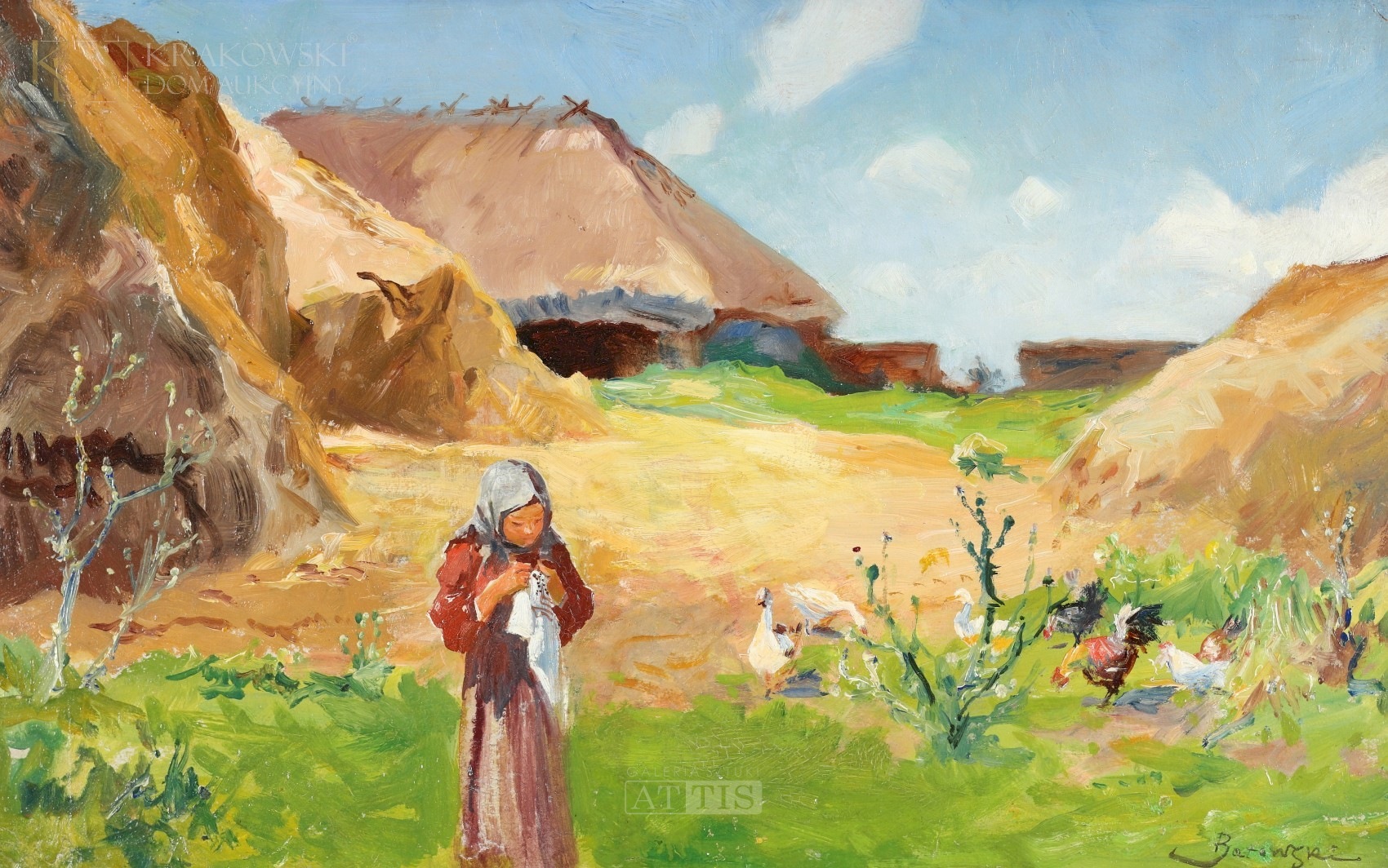 | Sygnowany p.d.: "Batowski" OPIS PRACY: Stanisław Batowski Kaczor – mimo, iż znany głównie jako batalista – zajmował się także malarstwem pejzażowym, rodzajowym i portretowym. Sceny z polskiej wsi, podobnie zresztą jak przedstawienia walk niepodległościowych, stanowiły dla artysty pretekst do wyrażenia uczuć patriotycznych. Obraz Stanisława Batowskiego Kaczora "Na wsi" przedstawia haftującą dziewczynkę na tle stogów siana i pokrytych strzechą domów. Po prawej stronie kompozycji pasie się przydomowe ptactwo. Malarz ukazał tę sielankową scenę z dużą swobodą. Przyglądając się malarskiej warstwie obrazu można śledzić energiczne pociągnięcia pędzla i podziwiać śmiałe, kontrastowe decyzje w dobrze gamy barwnej, dzięki którym praca trafnie oddaje klimat letniego, ciepłego dnia. | |