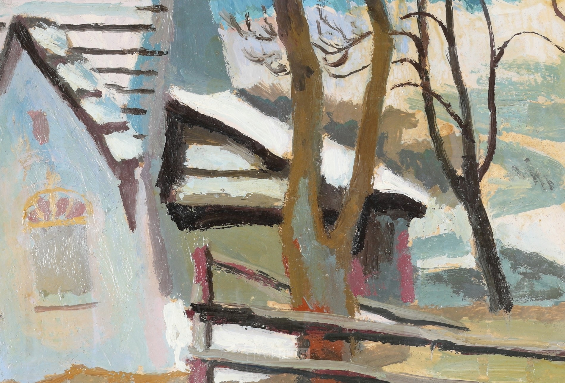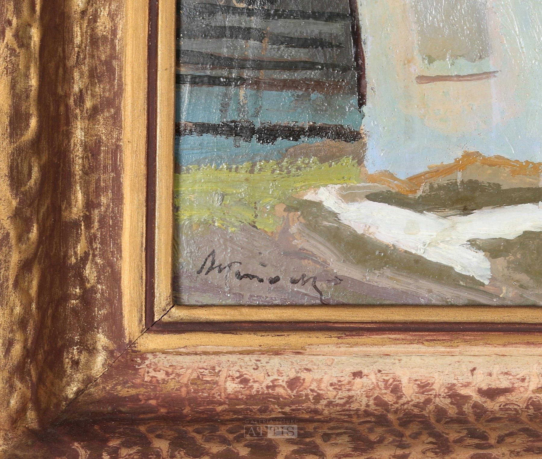 | Sygnowany l.d.: "StKamocki" Opisany na odwrocie: "K. | MARCOWY | ŚNIEG" OPIS PRACY: Obraz Stanisława Kamockiego "Marcowy śnieg" ukazuje górzysty pejzaż wsi w okresie przedwiośnia. Artysta przedstawił fragment drewnianego domu z zaznaczoną błękitną szarością kamienną podmurówką oraz dobudówką po jednej stronie. Przed domem znajduje się murowana kapliczka, będąca właściwie dominantą kompozycji. Po prawej, na pierwszym planie, widnieje drewniane ogrodzenie, za nim bezlistne jeszcze drzewa, a w oddali szeroki krajobraz pól pokrytych miejscami topniejącym śniegiem. Stanisław Kamocki, dobierając gamę barwną i sposób prowadzenia narzędzia, dobrze oddał aurę marcowej przyrody. Widz patrzący na obraz może wręcz poczuć rześkie powietrze i zapach wilgotnej, odradzającej się po zimie do życia ziemi. Pod względem formalnym praca jest malowana zdecydowanymi, szerokimi pociągnięciami pędzla, miejscami pojawiają się impasty. Stanisław Kamocki to jeden z najbardziej cenionych pejzażystów – uczniów Jana Stanisławskiego. Studia pod okiem mistrza wpłynęły w dużej mierze na takie właśnie odważne traktowanie kompozycji oraz budowę obrazu w oparciu o plamę, światło i kolor, nie zaś o sztywny rysunek. To swoiste, raczej wrażeniowe niż studyjne podejście do malarstwa sprawia, że w obrazach Stanisława Kamockiego niezwykle trafnie zamknięty zostaje prawdziwy charakter przedstawianego krajobrazu. | |