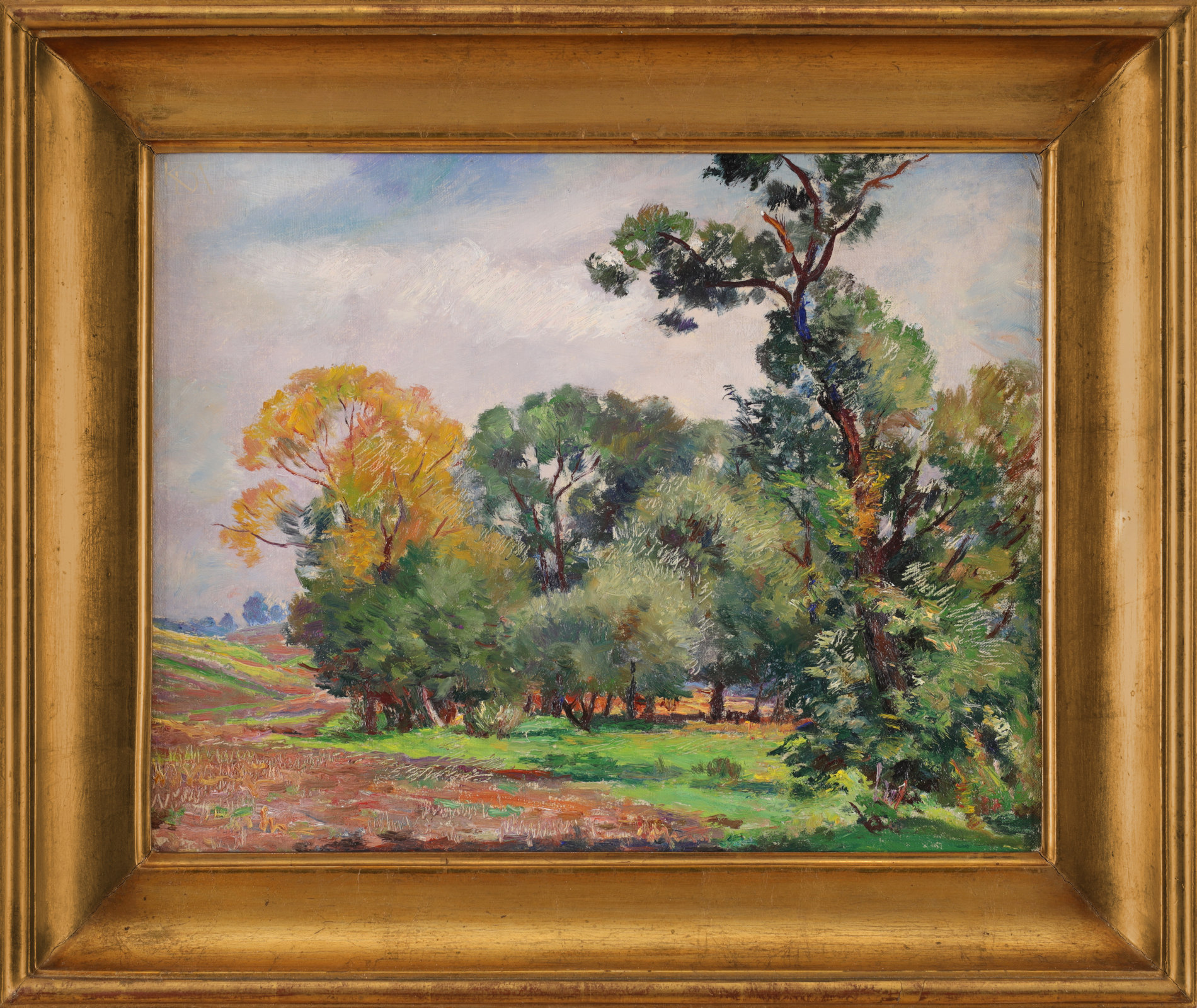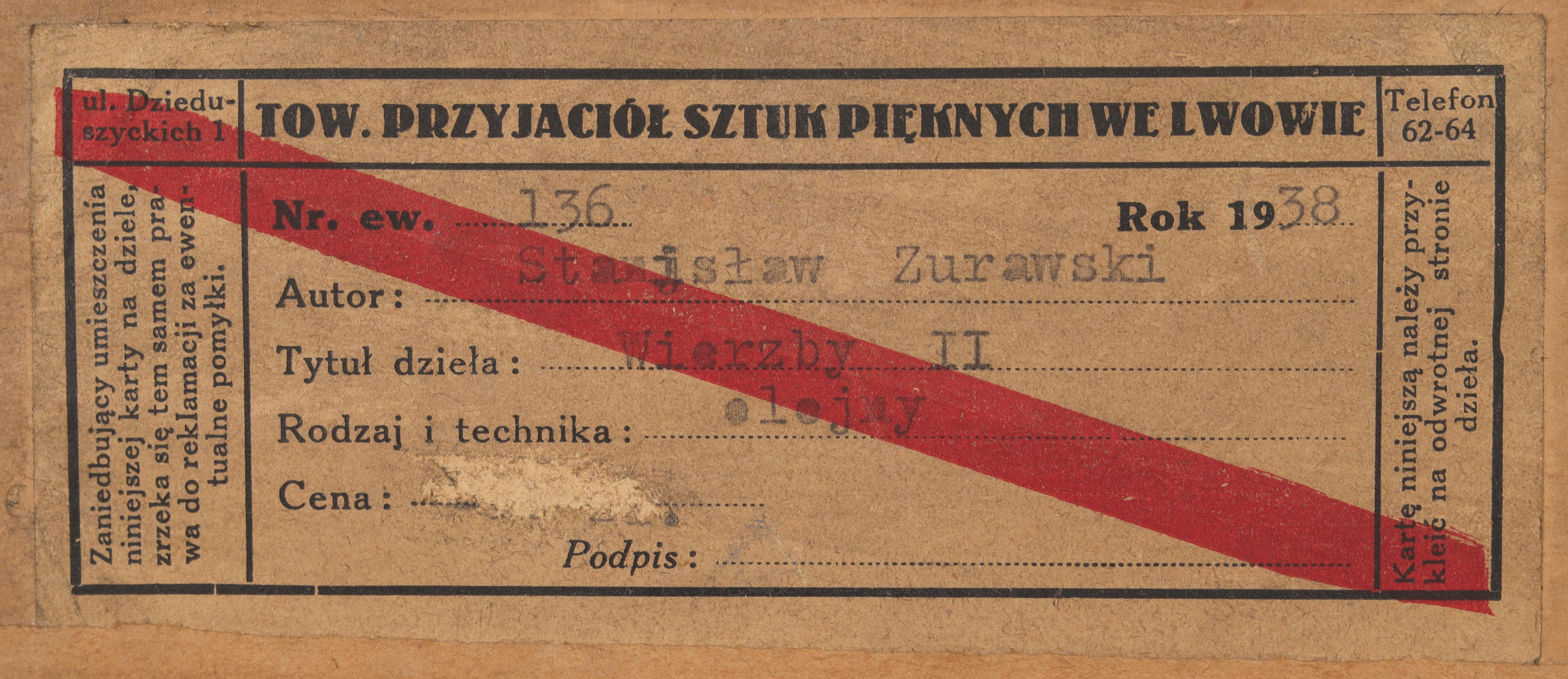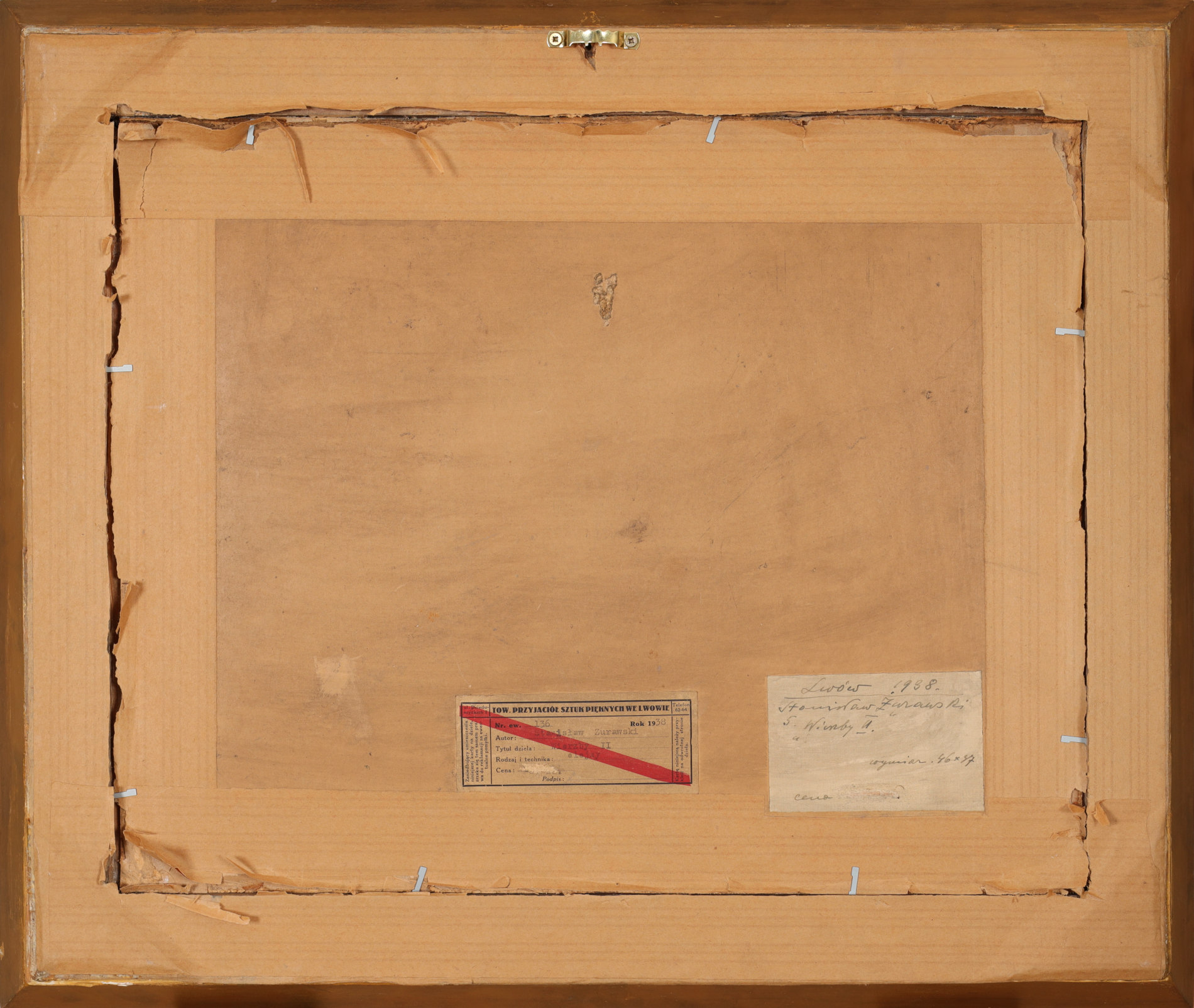 | Na odwrocie metka Towarzystwa Przyjaciół Sztuk Pięknych w Krakowie z 1938 roku oraz metka z odręcznym opisem obrazu. | |