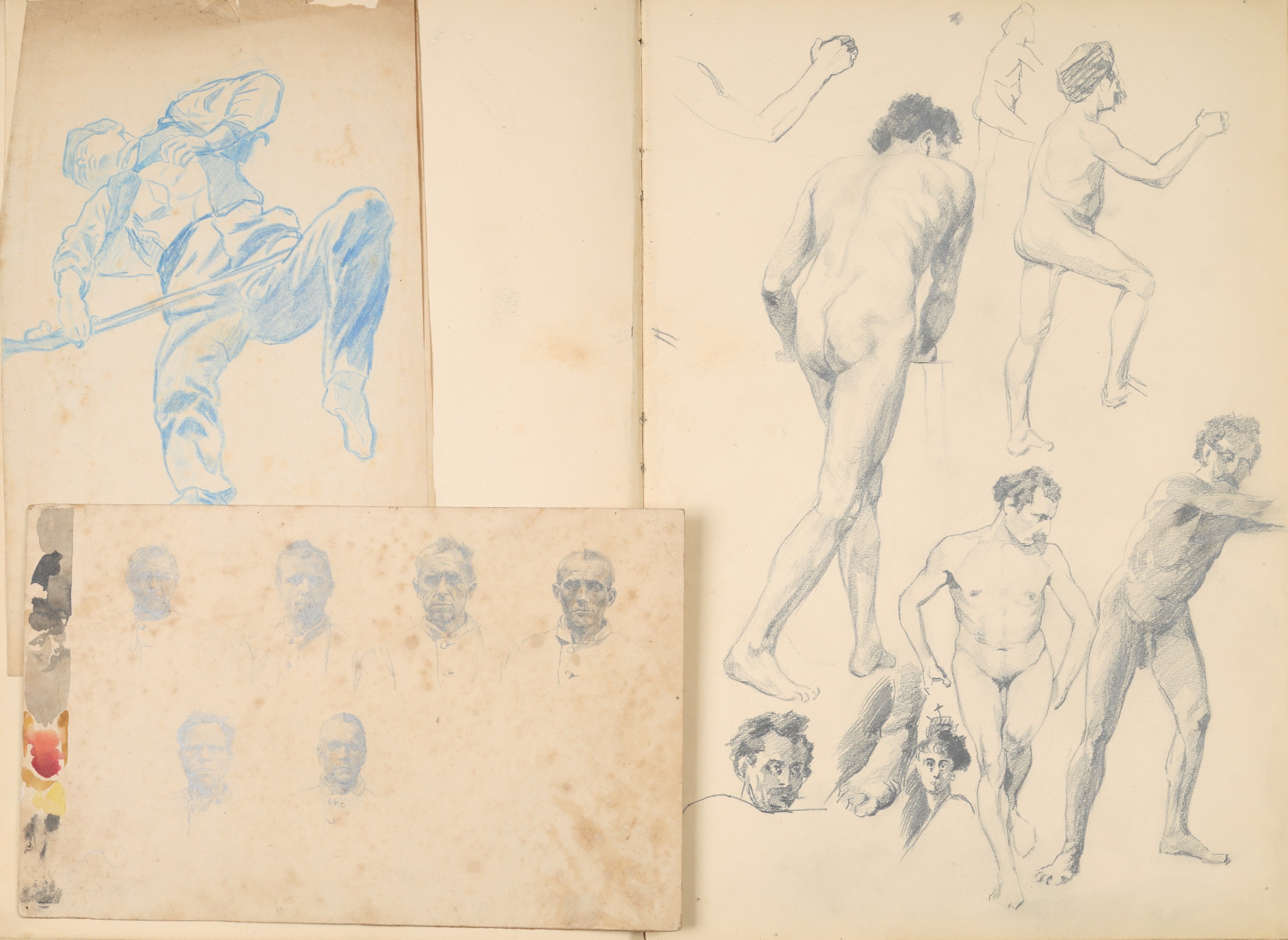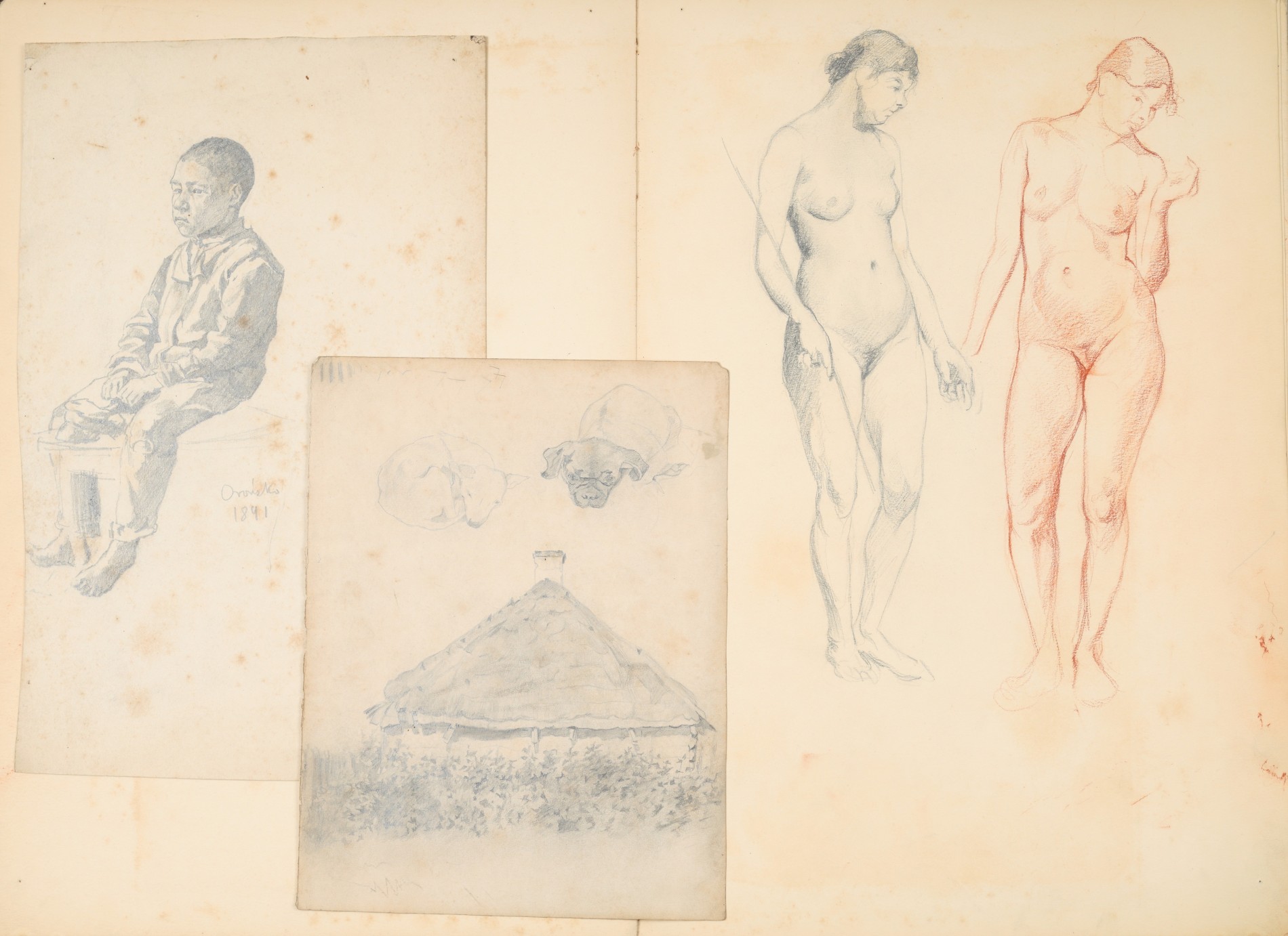 | Okładka opisana i datowana p.g.: "Stefan Kania. | 1892. München."; śr.g.: "Stefen lassen." oraz na stronie verso śr.g.: "Stefan Kania. | 1892. München." Szkicownik zawiera: 17 kart (13 z rysunkami na stronie recto, 1 z rysunkiem na stronie verso, 3 z rysunkami recto-verso) oraz 7 kart luzem (opis poniżej). Na wewnętrznej stronie tylnej części okładki rysunek ołówkiem przedstawiający pejzaż oraz szkic twarzy. Karty szkicownika przedstawiają głównie studia aktów kobiecych oraz męskich, ale także pojedyncze studia portretowe i anatomiczne. Rysunki luzem: "Studium anatomiczne nogi", ołówek, karton, 45 x 21,5 cm "Pejzaż z chatą oraz studia leżących psów", ołówek, papier, 26,5 x 20,5 cm "Mężczyzna z szablą", kredka, papier, 33 x 21 cm (arkusz złożony w pół; na nim dwa rysunki postaci). Widoczne ubytki i zagięcia przy krawędziach podłoża. "Studia portretowe", ołówek, tektura, 20 x 32 cm "Siedzący chłopiec" (1891), ołówek, karton, 36 x 23 cm, opisany p.d. "Orońsko | 1891" "Rewolucja | Wizja skrzypka" (rysunek dwustronny), akwarela, ołówek, tusz, tektura, 22 x 16,8 cm "Kosynier", ołówek, tektura, 27,7 x 22,3 cm | |
