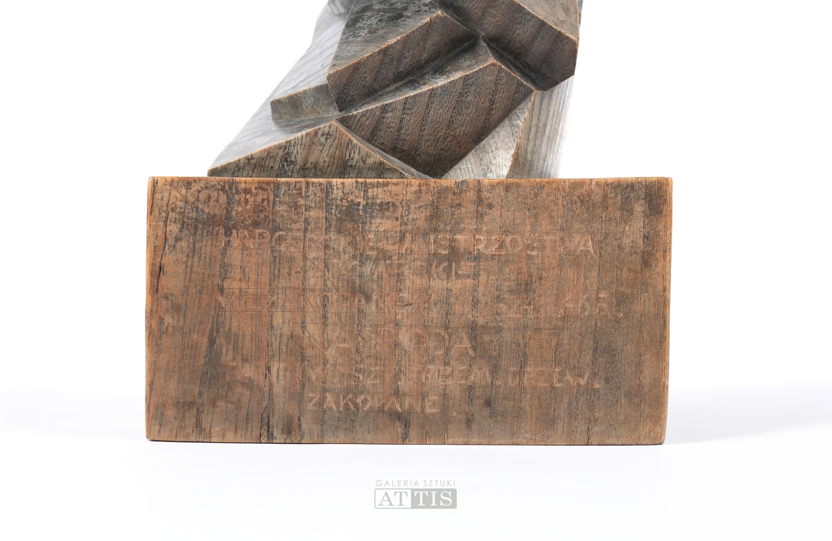| Opisana na froncie podstawy: "HARCERSKIE MISTRZOSTWA | NARCIARSKIE | W ZAKOPANEM 19.II-24.II.46R. | NAGRODA | PAŃSTW. SZK. PRZEM. DRZEW. | ZAKOPANE." Na spodzie podstawy sygnatura Państwowej Szkoły Przemysłu Drzewnego w Zakopanem: "PSPD" wpisane w tzw. "krzyżyk niespodziany". Więcej o rzeźbie można przeczytać w artykule na blogu Krakowskiego Domu Aukcyjnego [ZOBACZ] | |