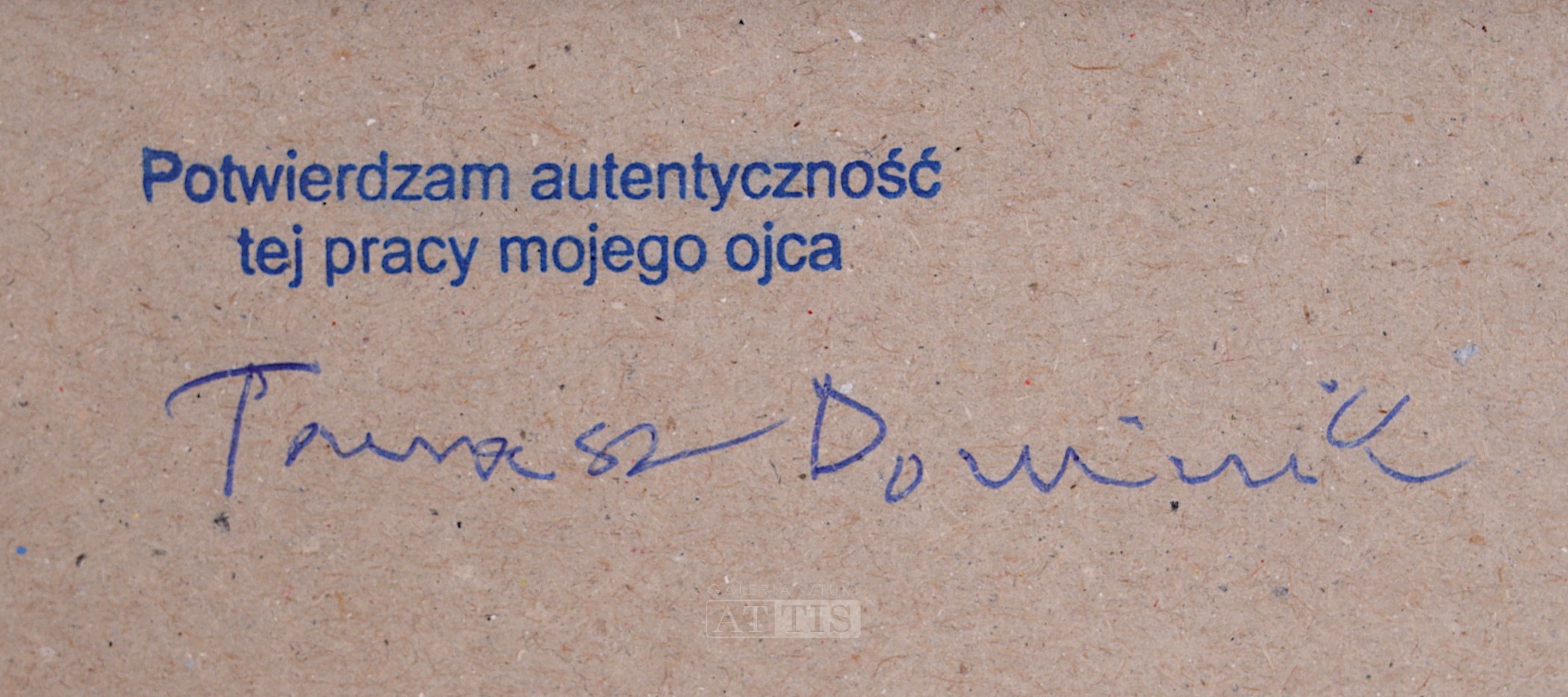 | Sygnowany p.d.: "Dominik" Na odwrocie oprawy potwierdzenie autentyczności obrazu podpisane przez syna artysty, Tomasza Dominika. | |