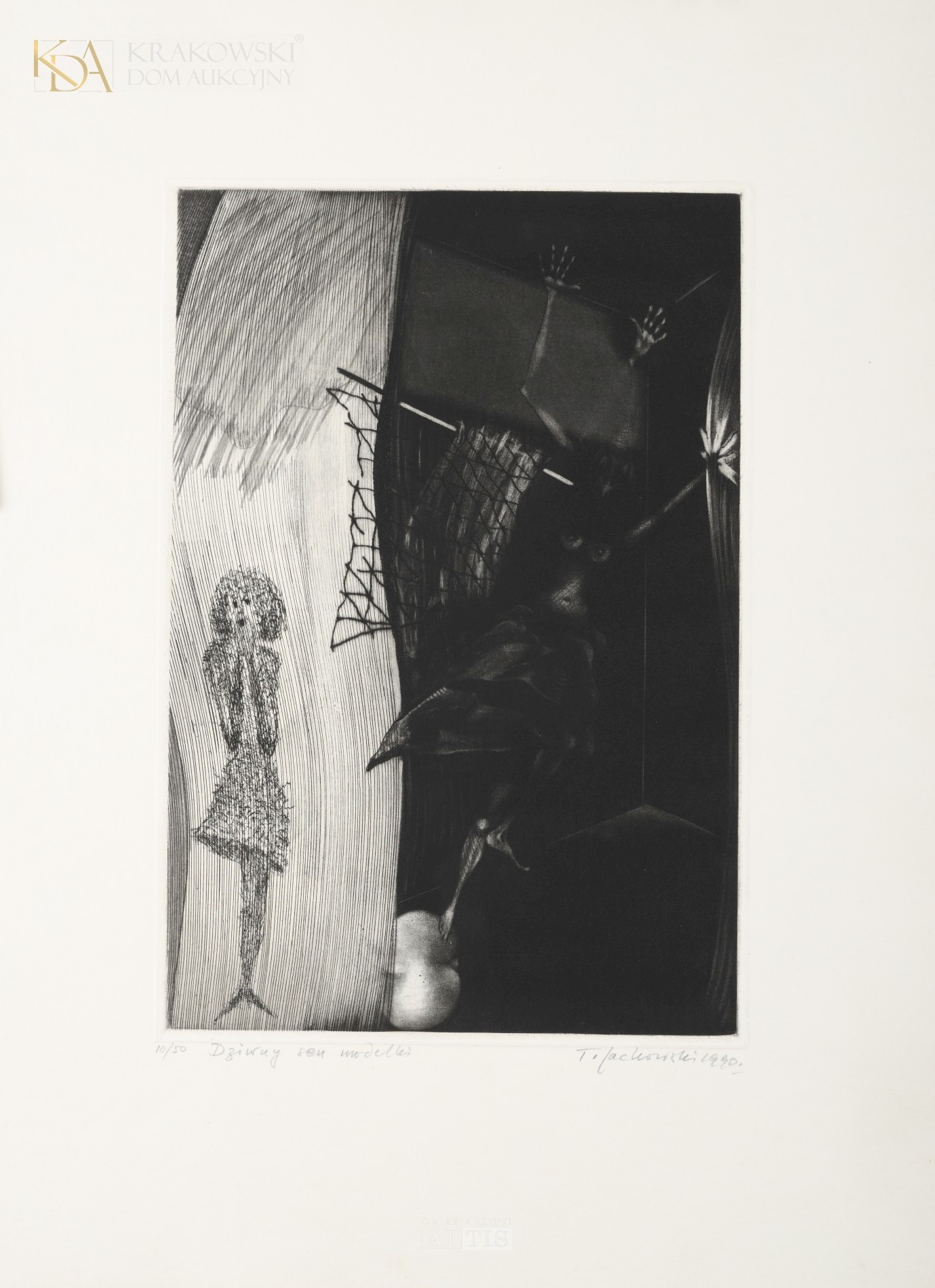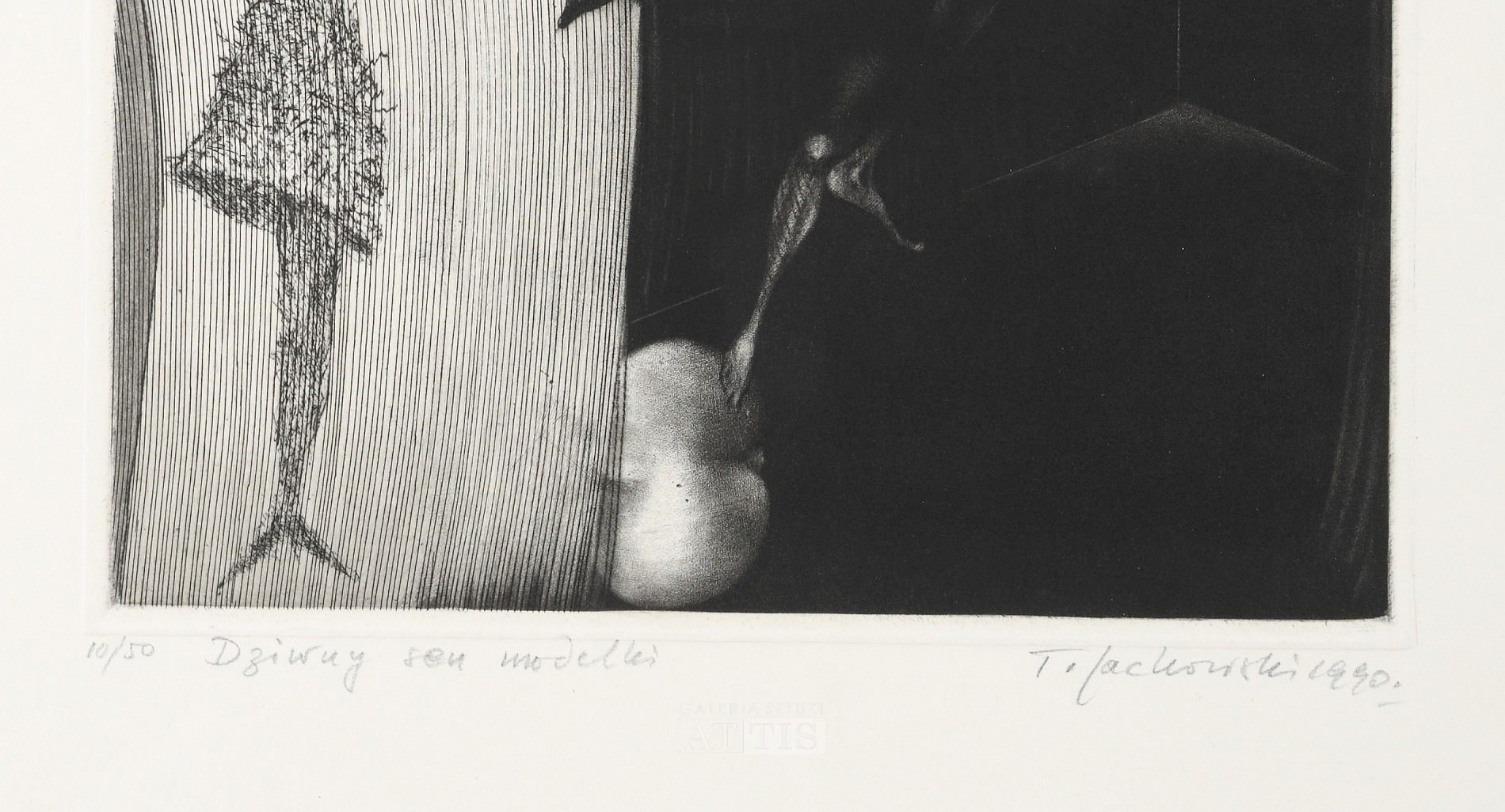 | Sygnowana i datowana ołówkiem p.d.: "T. Jackowski 1990." Opisana ołówkiem l.d.: "10/50 Dziwny sen modelki" Opisana na odwrocie. | |