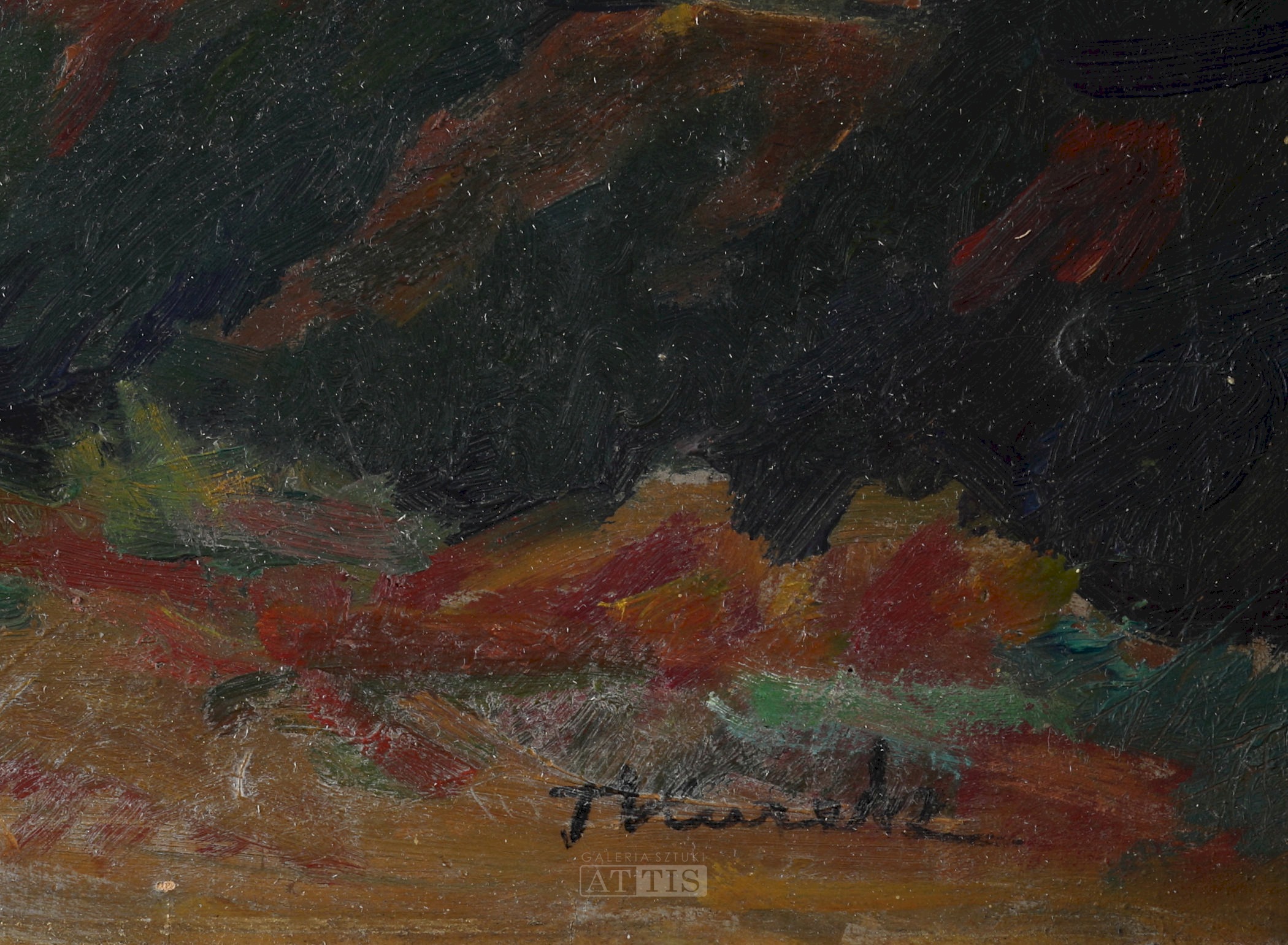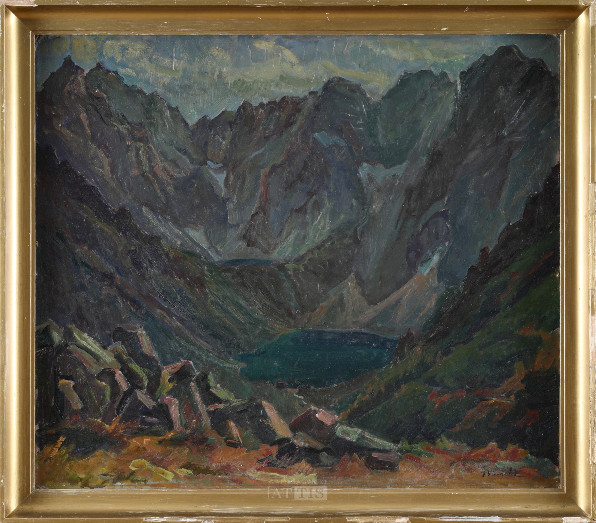 | Sygnowany p.d.: "TKurek" Na odwrocie metka z odręcznym opisem: "MORSKIE OKO | olej | Kurek Tadeusz | Zakopane" Widoczne zabrudzenie malatury. | |
