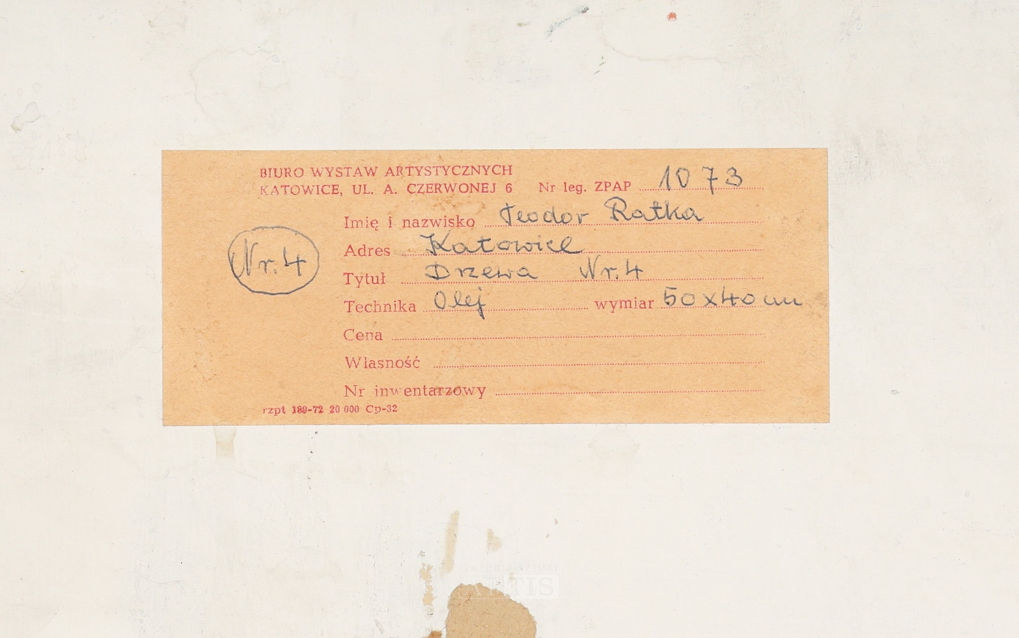 | Sygnowany i datowany l.d.: "T. Ratka | 1969" Na odwrocie metka Biura Wystaw Artystycznych w Katowicach. | |