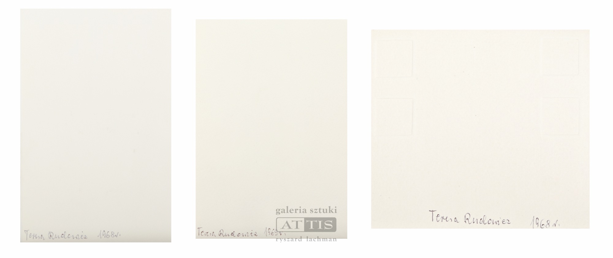 | Wymiary: 16 x 10,5 cm ("Bez tytułu I" (1968)), 16 x 11 cm ("Bez tytułu II" (1969)), 11 x 12,2 cm ("Bez tytułu IV" (1968)) Opisany na odwrocie: "Teresa Rudowicz 1968 r." ("Bez tytułu I" (1968)); "Teresa Rudowicz 1969 r." ("Bez tytułu II" (1969)); "Teresa Rudowicz 1968 r." ("Bez tytułu IV" (1968)) PROWENIENCJA: - kolekcja prywatna, - dar od artystki. | |